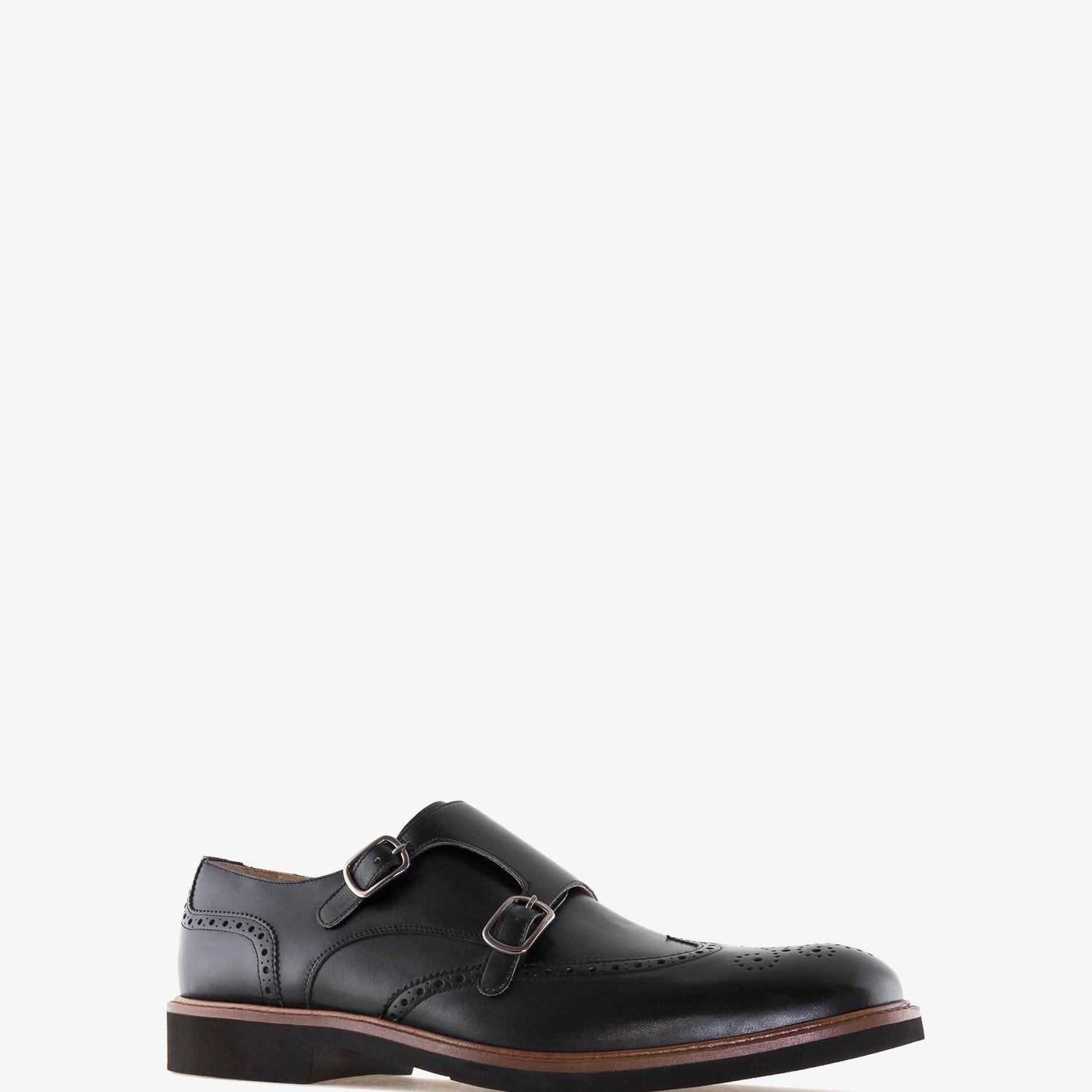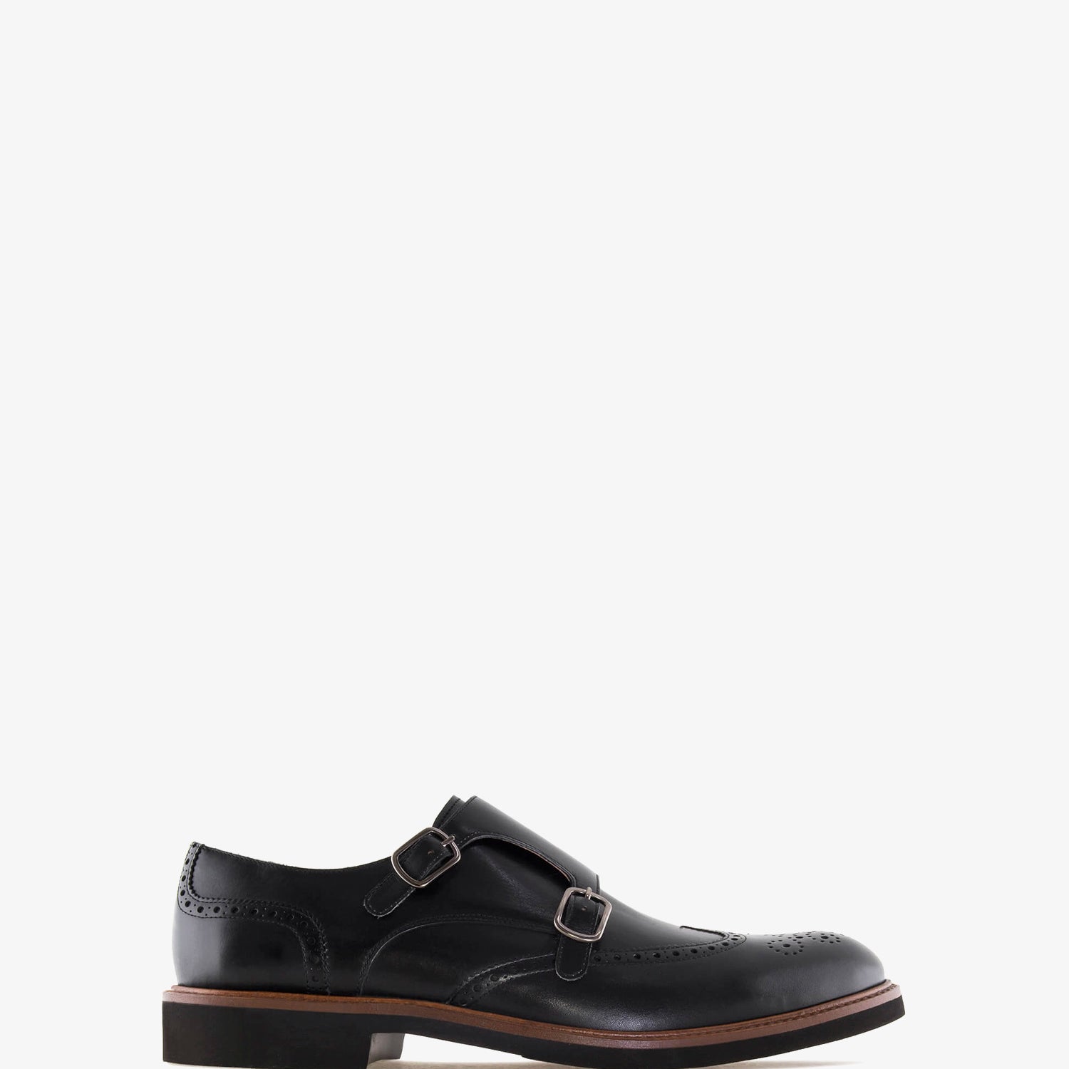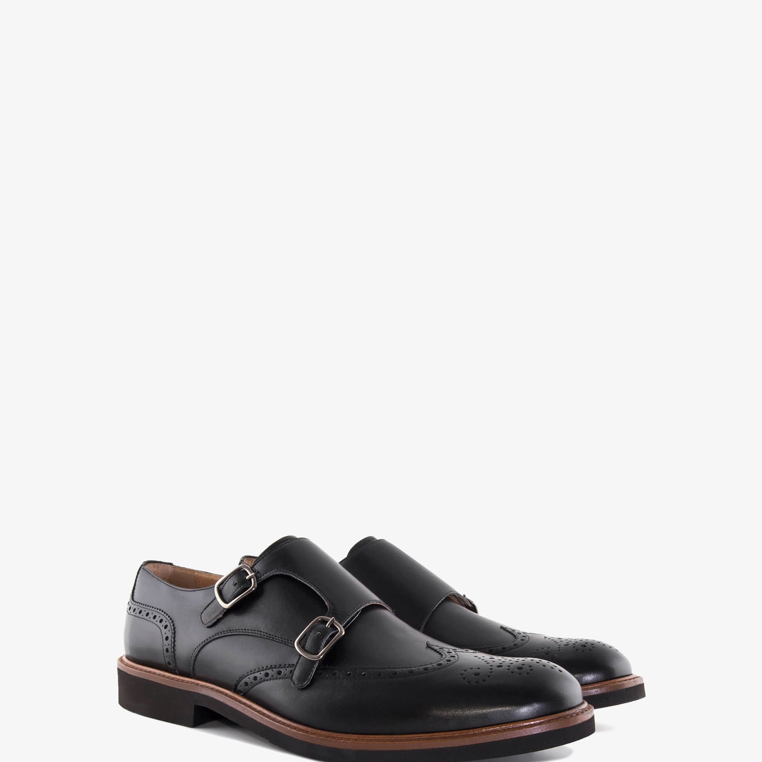 Czarne skórzane buty typu monk z dwiema metalowymi klamrami i elastycznym zapięciem. Ozdobny szczegół w postaci ściętych krawędzi cięcia. Wkładka i podszewka w kolorze wielbłądzim. Czarna podeszwa. Małe rozmiary od 37 do 40. Duże rozmiary męskie od 47 do 50. Wyprodukowano w Hiszpanii.