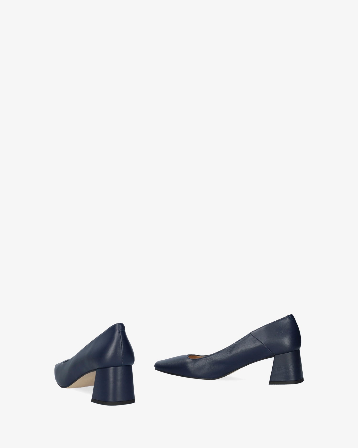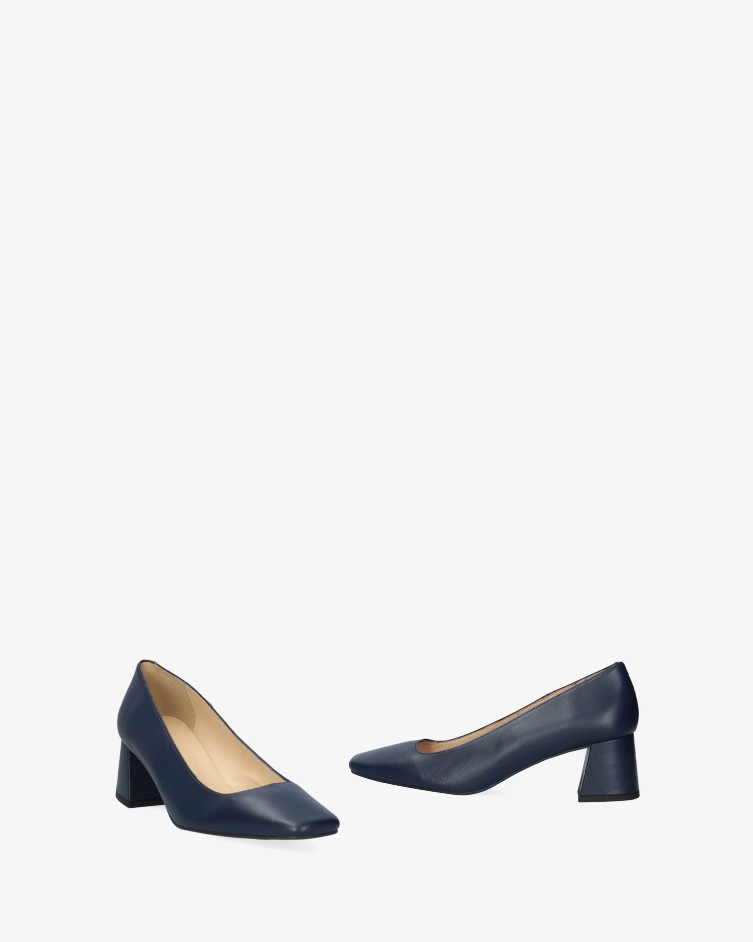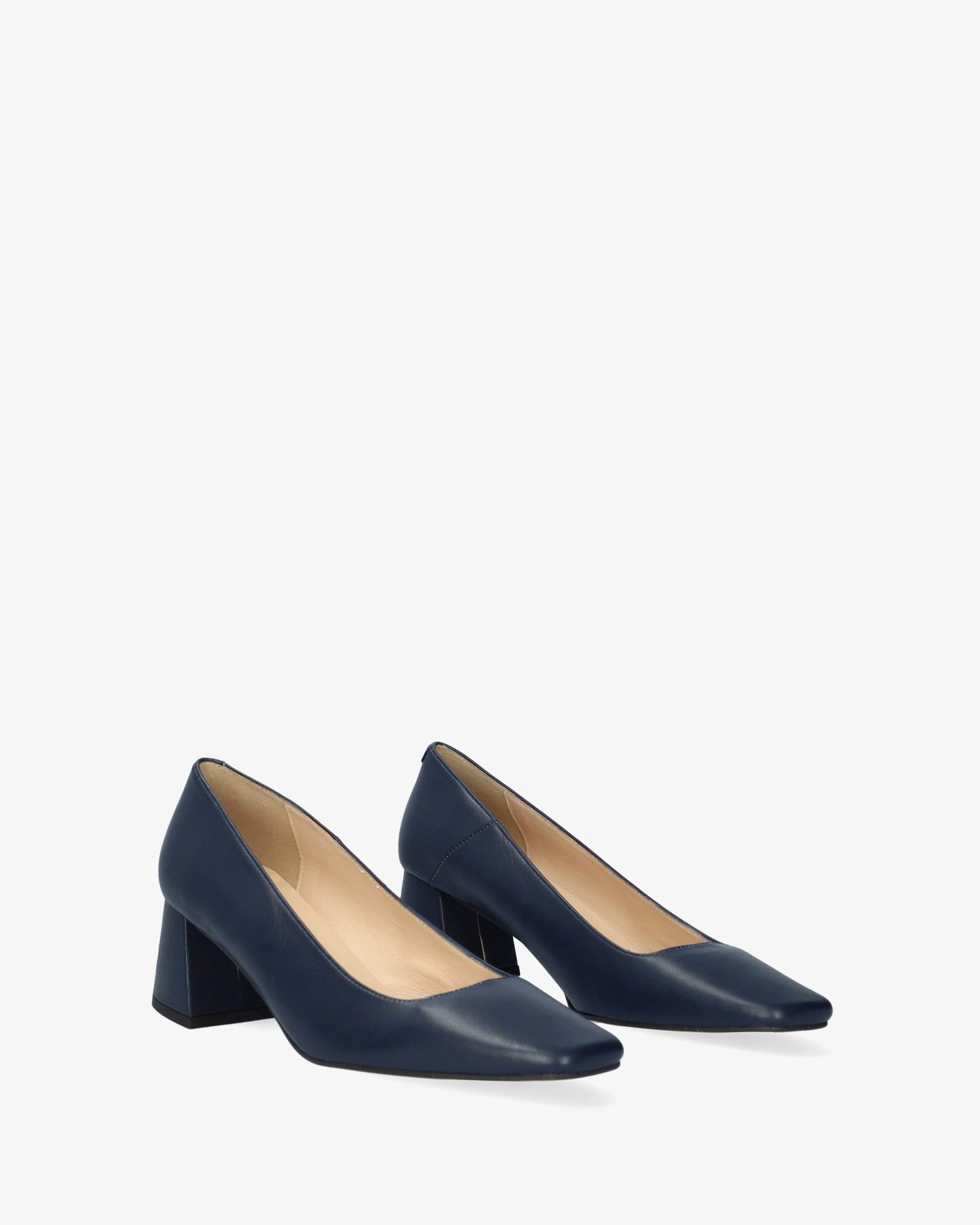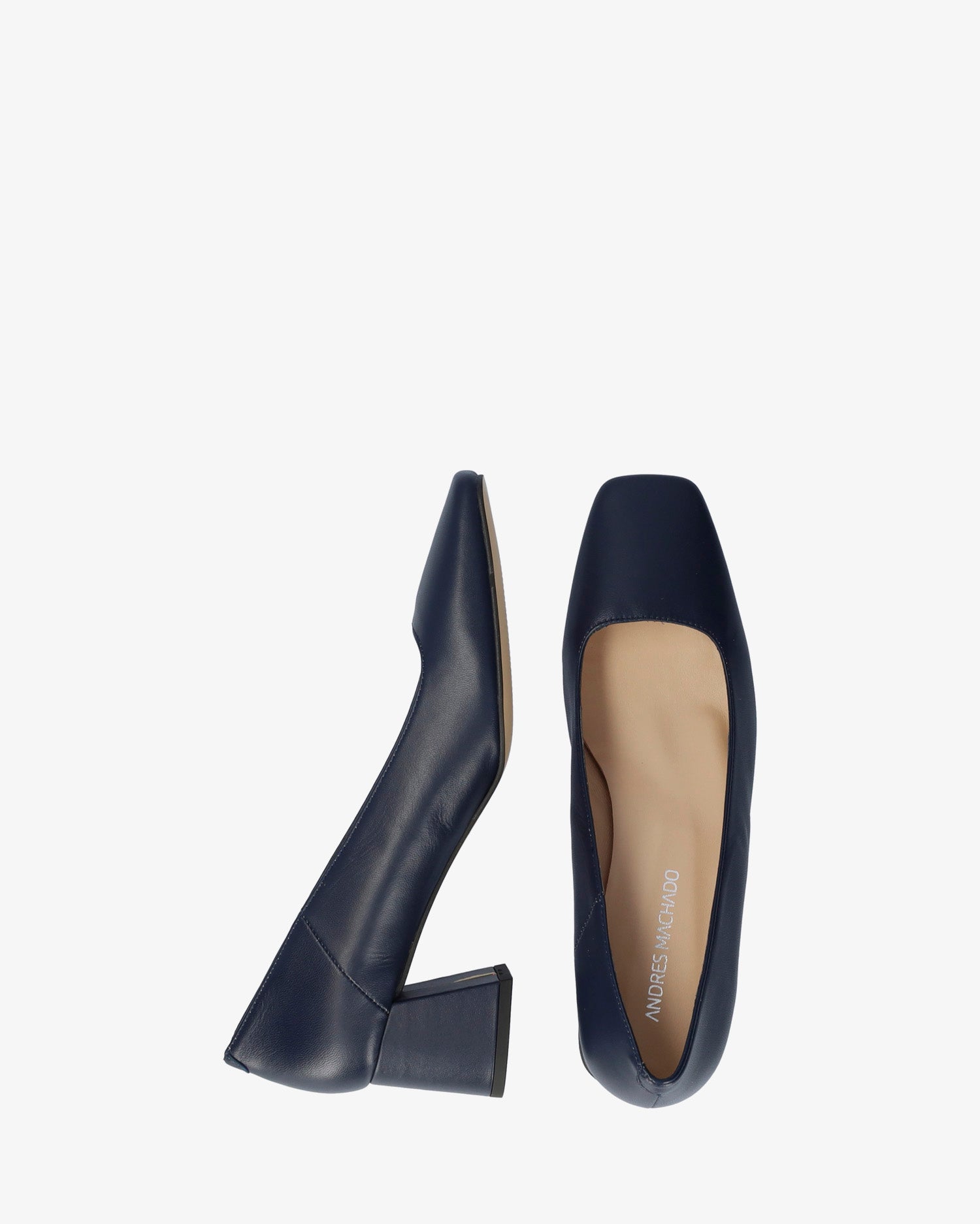 Skórzany but w kolorze granatowym. Wnętrze wyściełane beżową skórą. Wykończenie w formie kwadratowego noska. Obcas o wysokości 5 cm, z podszewką, pasujący do małych rozmiarów od 32 do 35. Obcas o wysokości 5 cm dla średnich rozmiarów od 36 do 41. Obcas o wysokości 6 cm dla dużych rozmiarów od 42 do 45. Wyprodukowano w Hiszpanii.