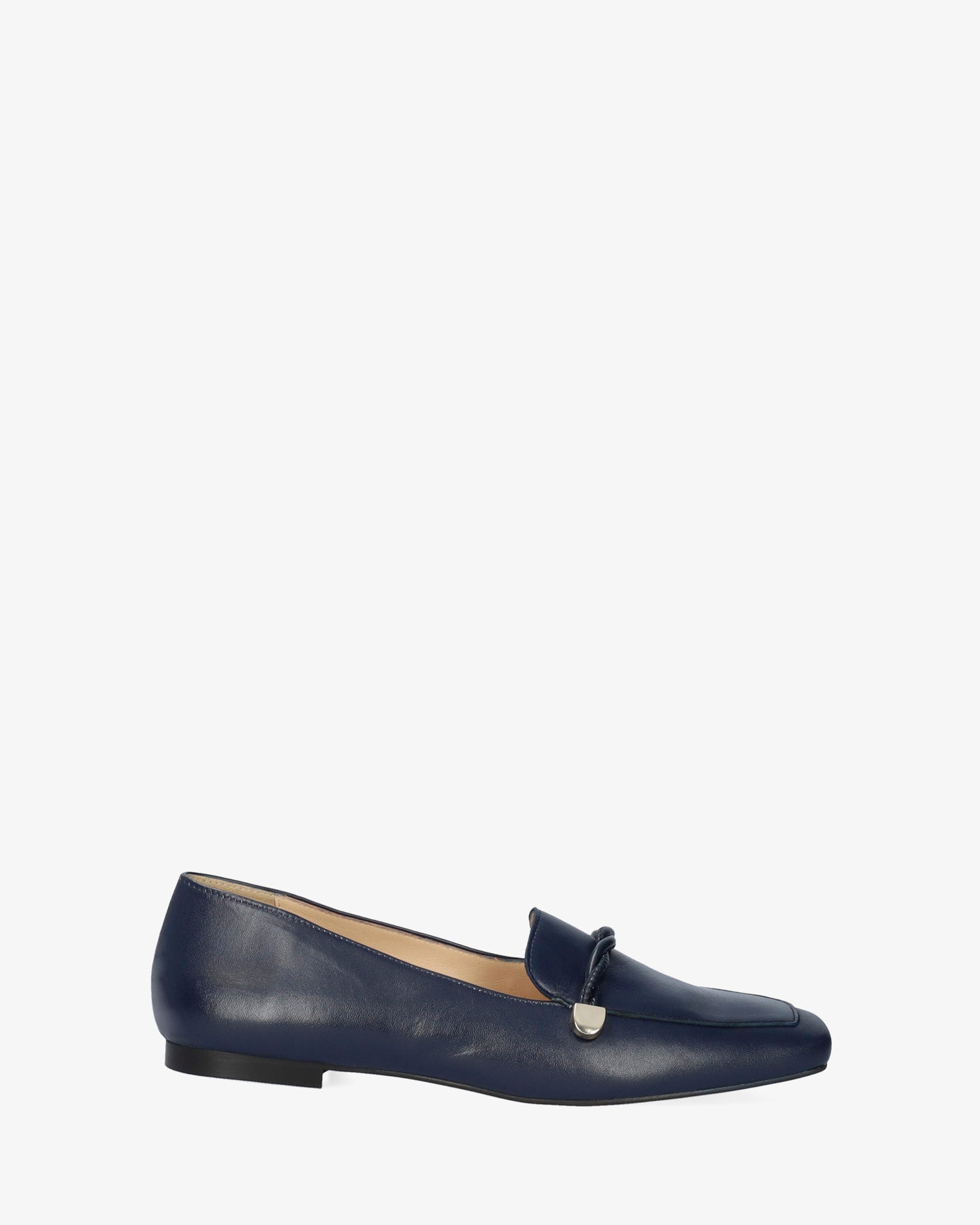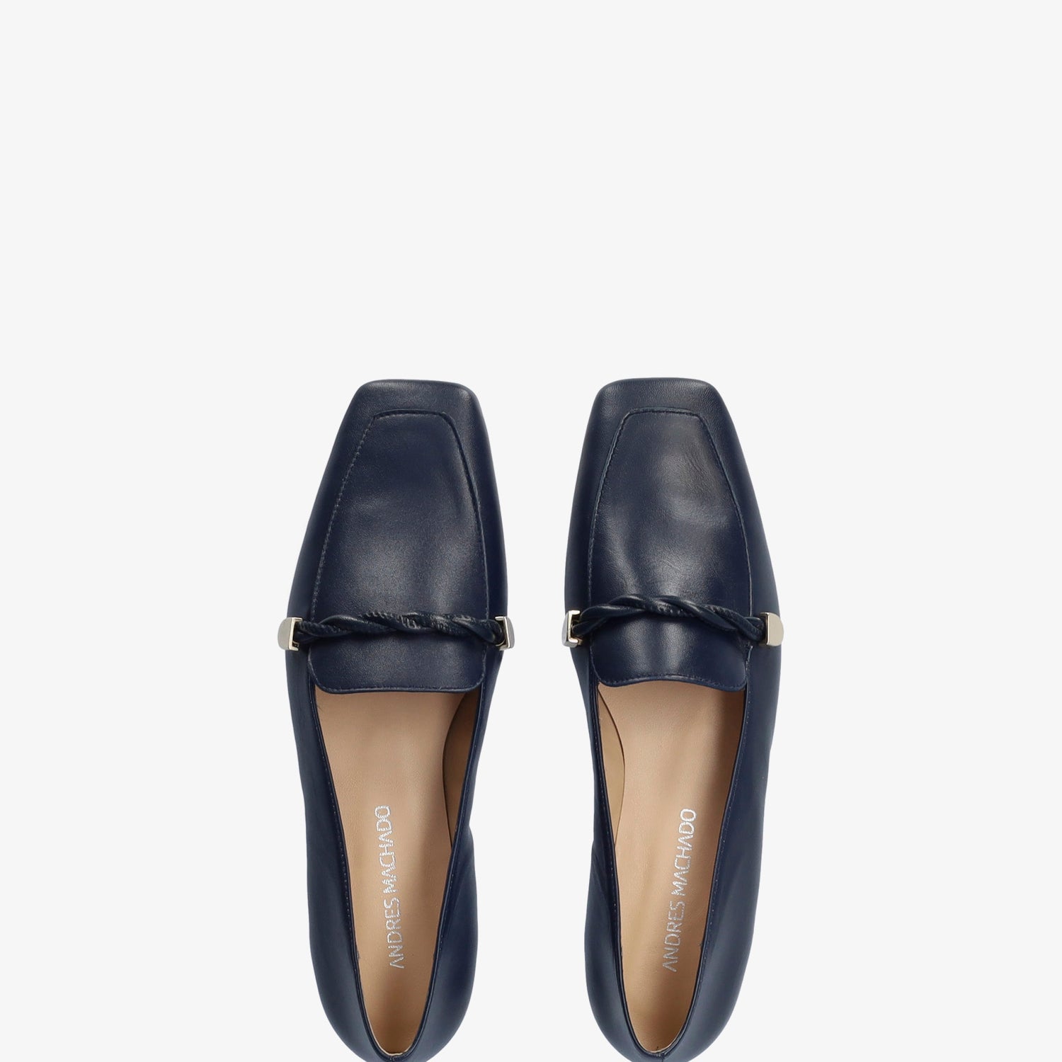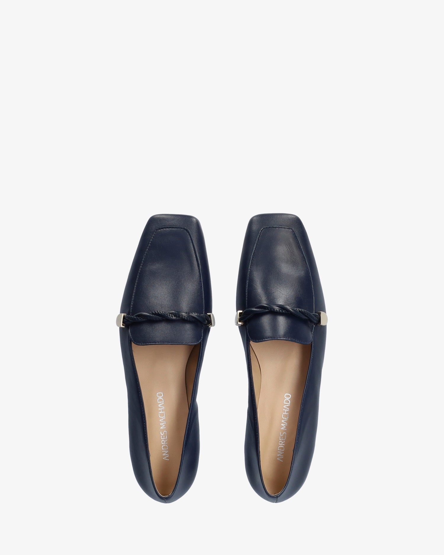 Mokasyny skórzane w kolorze granatowym. Dopasowane kolorystycznie sznurówki wykończone złotymi aplikacjami po bokach. Ozdobne przeszycia dopasowaną nicią. Wnętrze wyściełane beżową skórą. Wykończenie w formie kwadratowego noska. Dostępne rozmiary od 32 do 45. Wyprodukowano w Hiszpanii.