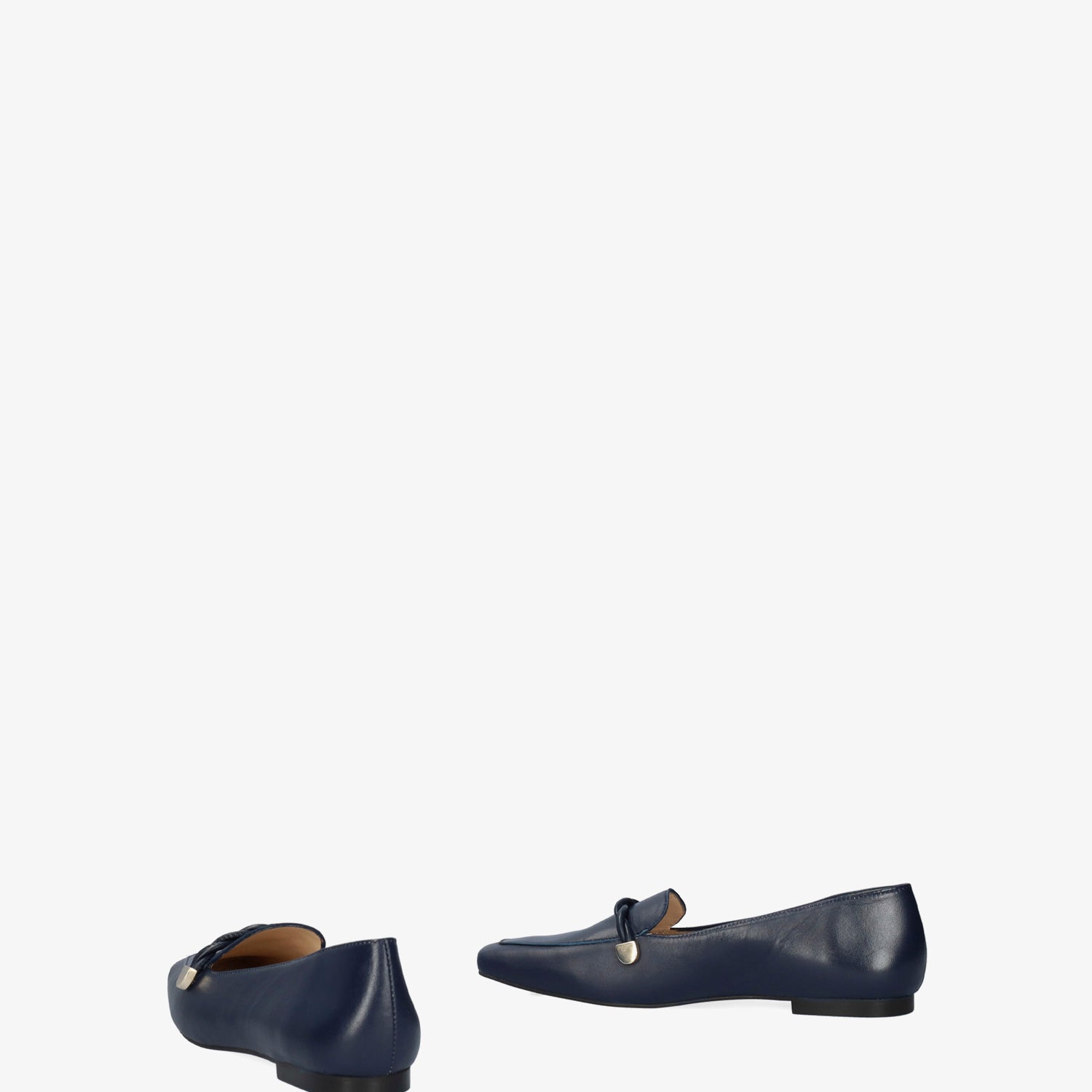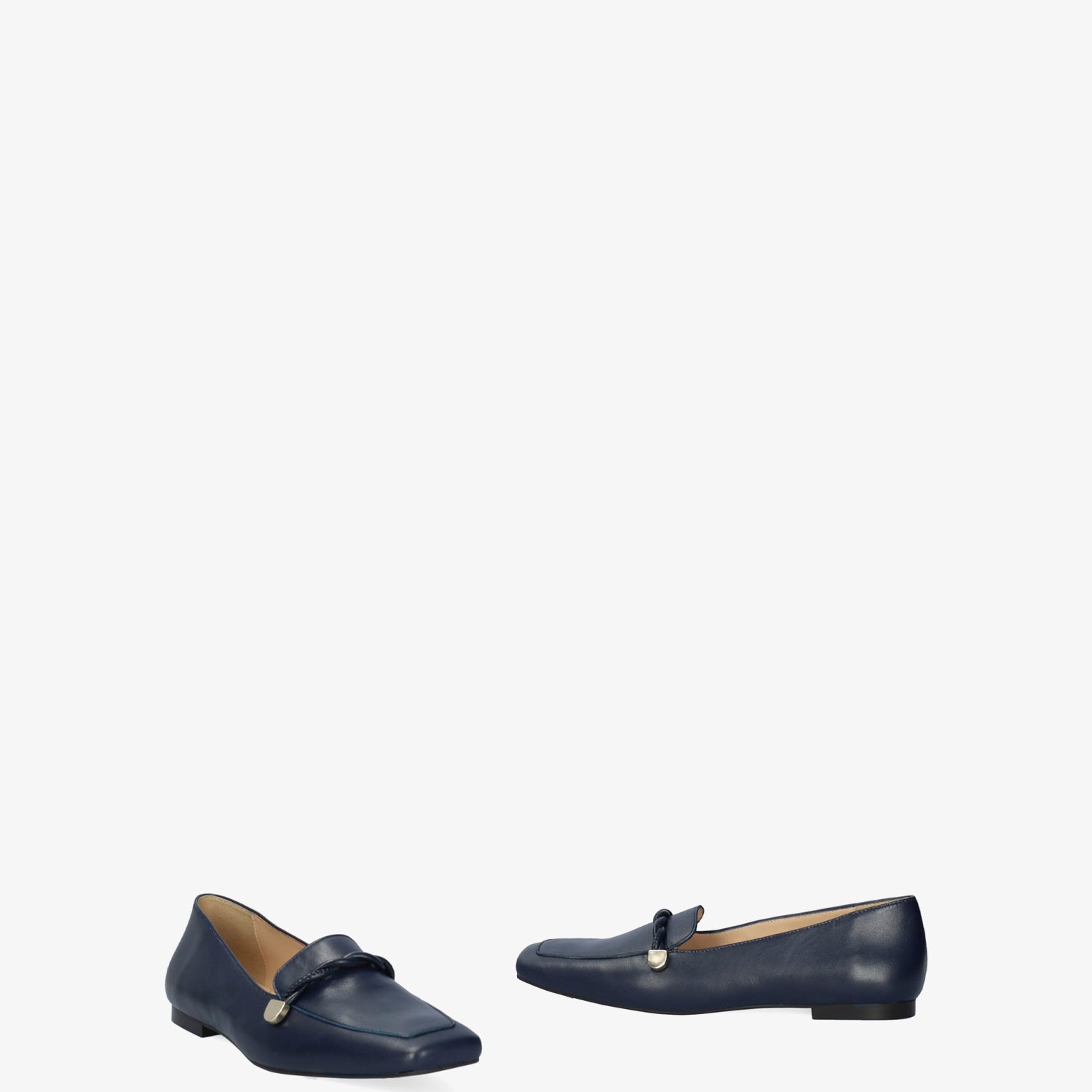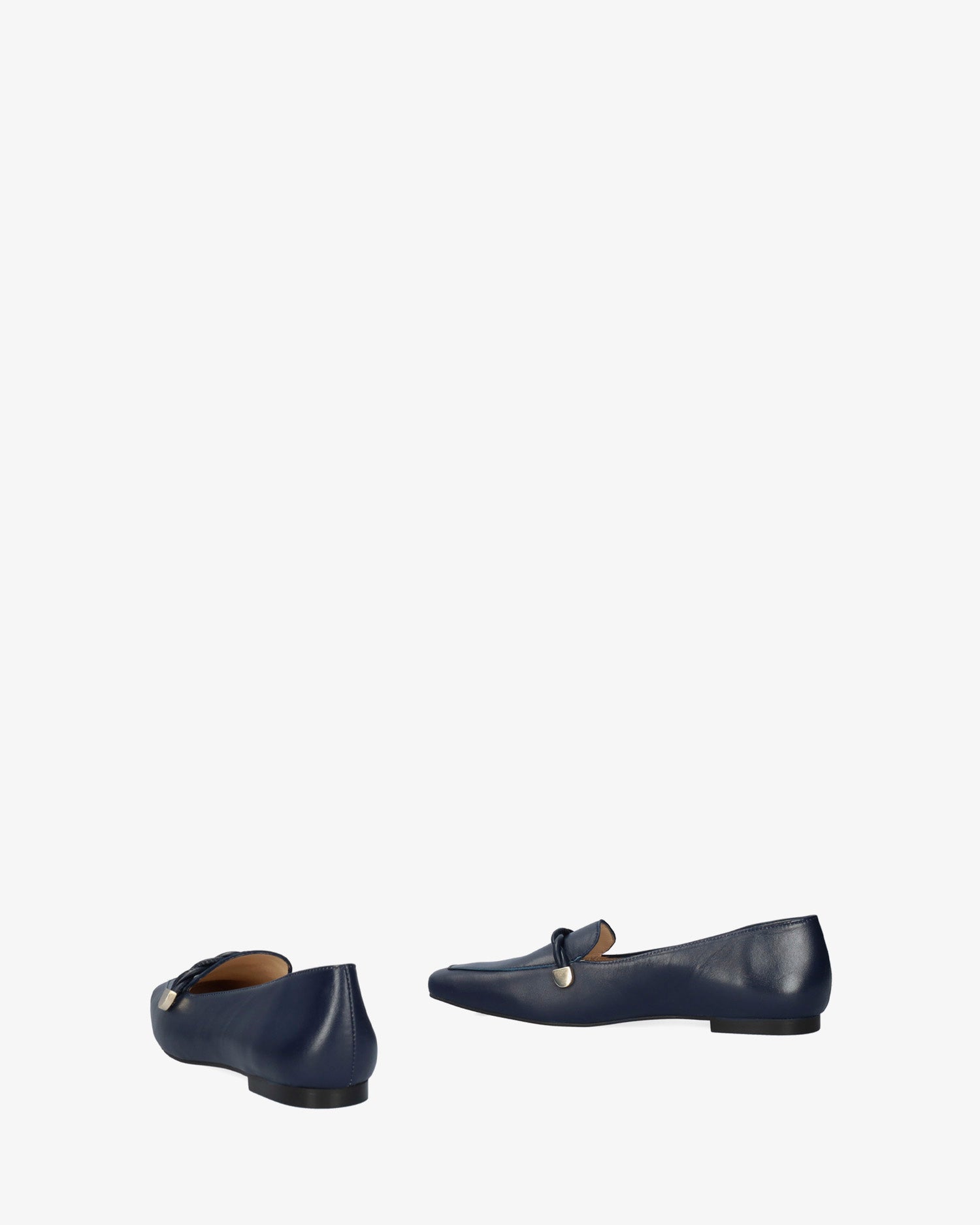 Mokasyny skórzane w kolorze granatowym. Dopasowane kolorystycznie sznurówki wykończone złotymi aplikacjami po bokach. Ozdobne przeszycia dopasowaną nicią. Wnętrze wyściełane beżową skórą. Wykończenie w formie kwadratowego noska. Dostępne rozmiary od 32 do 45. Wyprodukowano w Hiszpanii.
