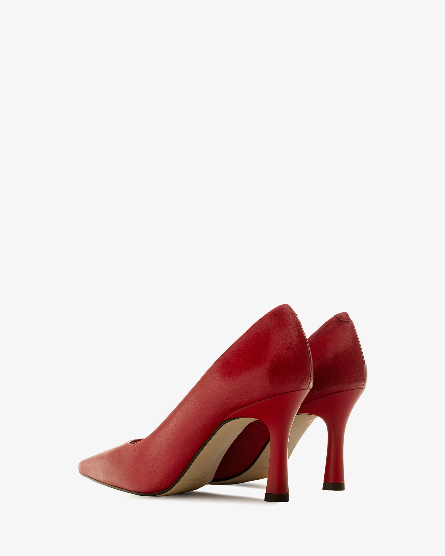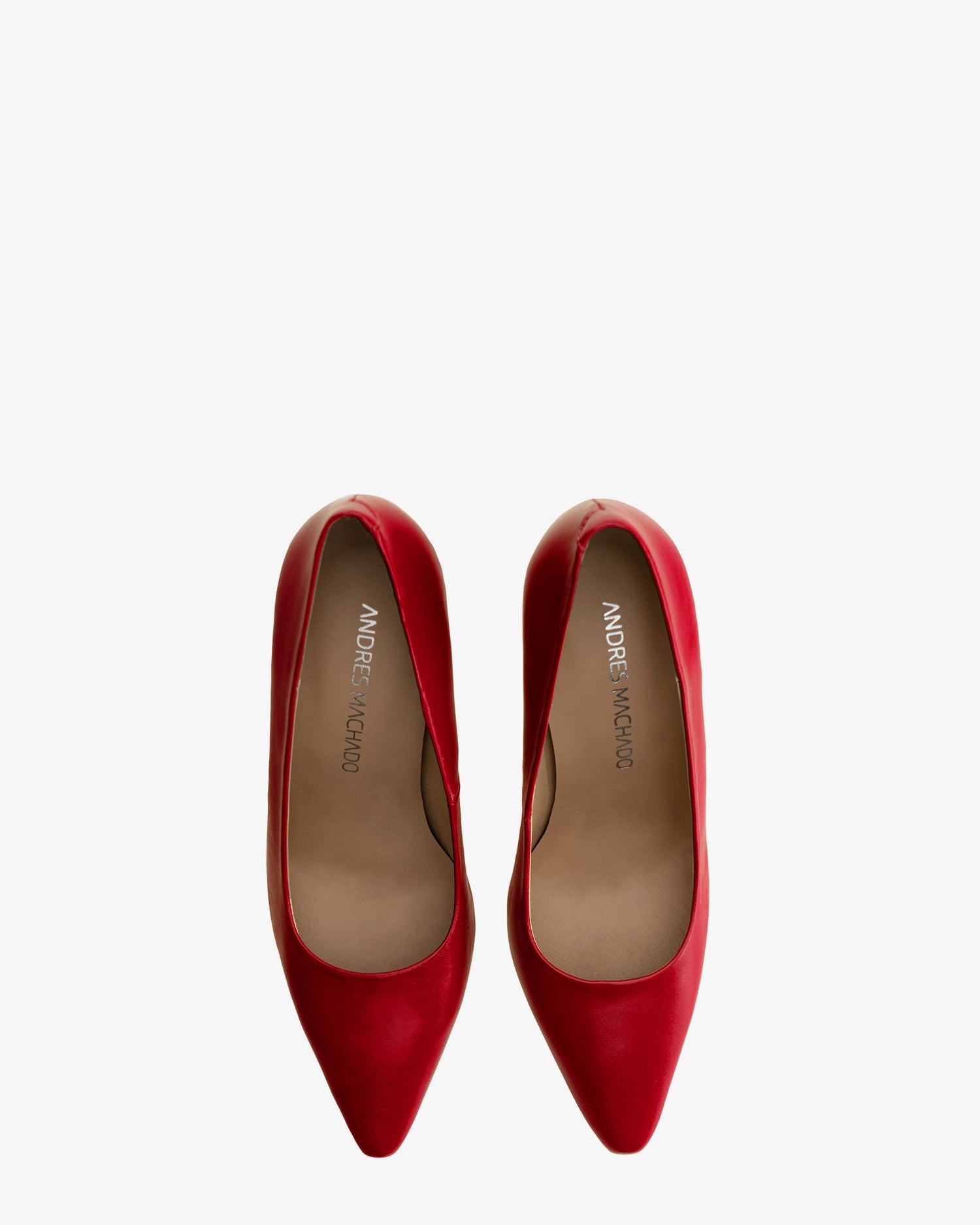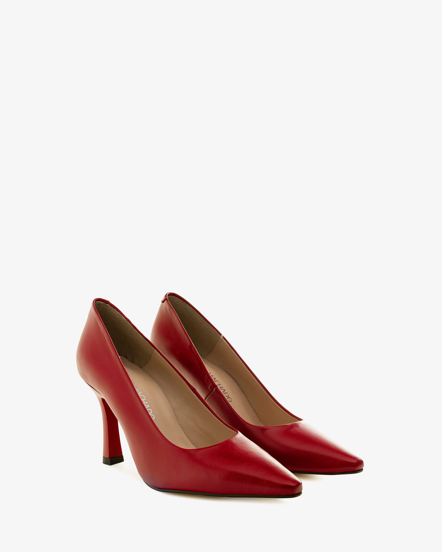 Czerwona skórzana kanapa. Skórzana podszewka i staranne wykończenie. 8-centymetrowy, czerwony, cienki obcas dla małych rozmiarów od 32 do 35. 9-centymetrowy obcas dla dużych rozmiarów od 42 do 45. Wyprodukowano w Hiszpanii