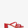 Czerwone skórzane sandały na obcasie. Krzyżujące się cienkie paski z przodu i na podbiciu, przeszycia nicią na paskach. Wykończone odkrytym, kwadratowym noskiem. Obcas 6 cm dla małych rozmiarów od 32 do 35. Obcas 6 cm dla średnich rozmiarów od 36 do 41. Obcas 6 cm dla dużych rozmiarów od 42 do 45. Wyprodukowano w Hiszpanii.