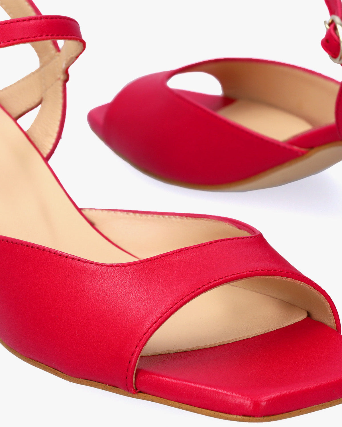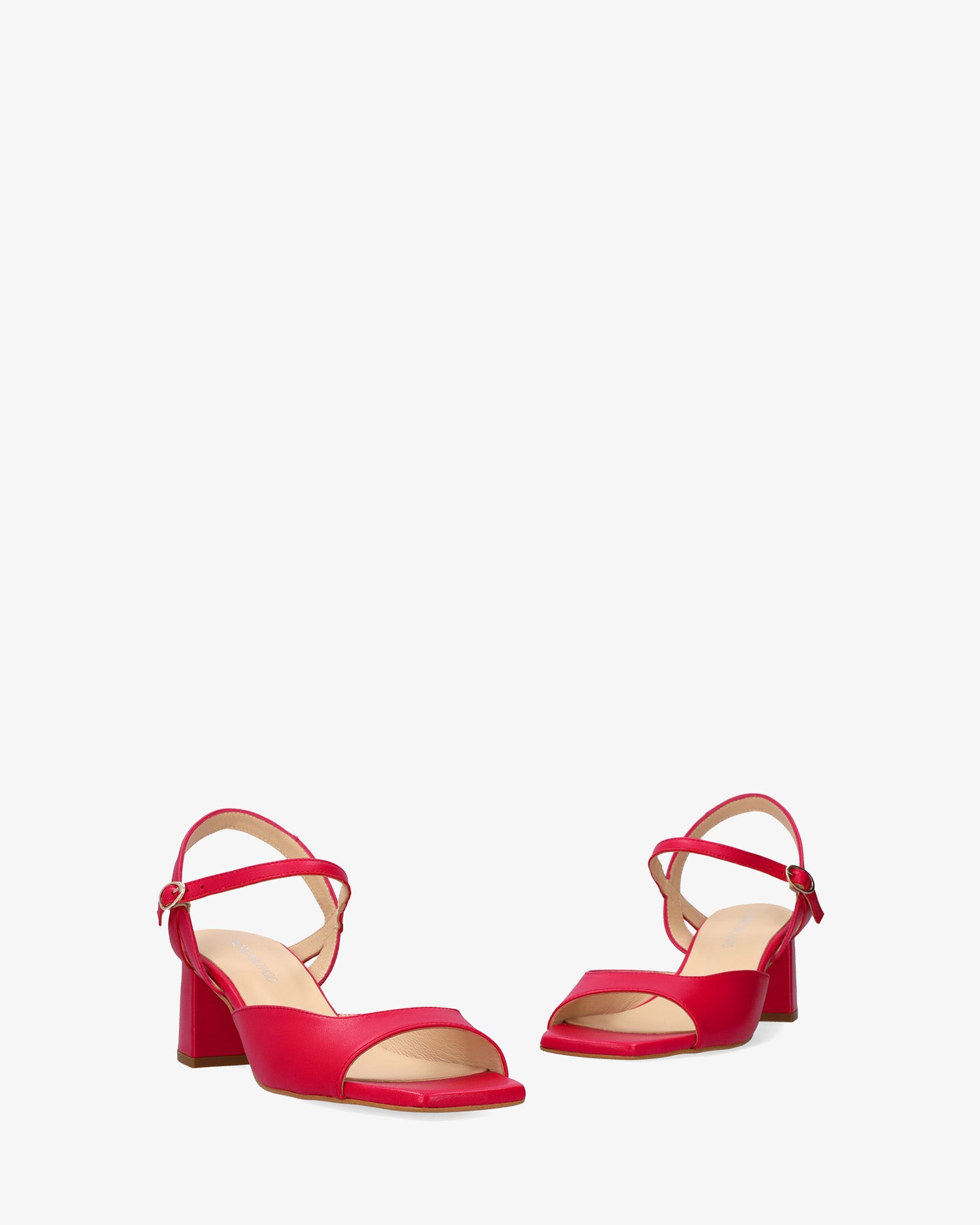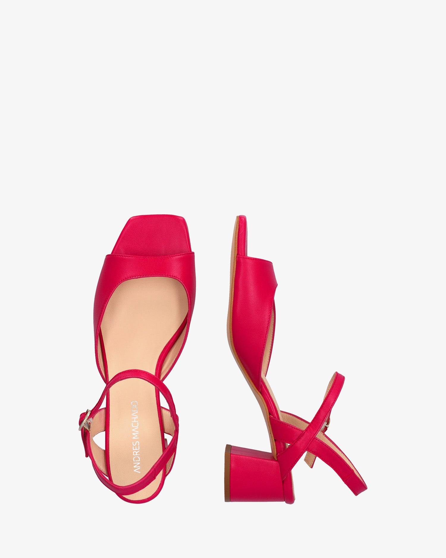 Sandały skórzane w kolorze fuksji z zaokrąglonym obcasem. Projekt przedniego paska. Zapięcie w postaci bransoletki oplatającej kostkę. Wykończone otwartym, kwadratowym noskiem. Wnętrze wyściełane beżową skórą. Wysokość obcasa: 5 cm, pasująca do małych rozmiarów od 32 do 35. Wysokość obcasa: 5,5 cm, pasują do dużych rozmiarów od 42 do 45. Wyprodukowano w Hiszpanii.