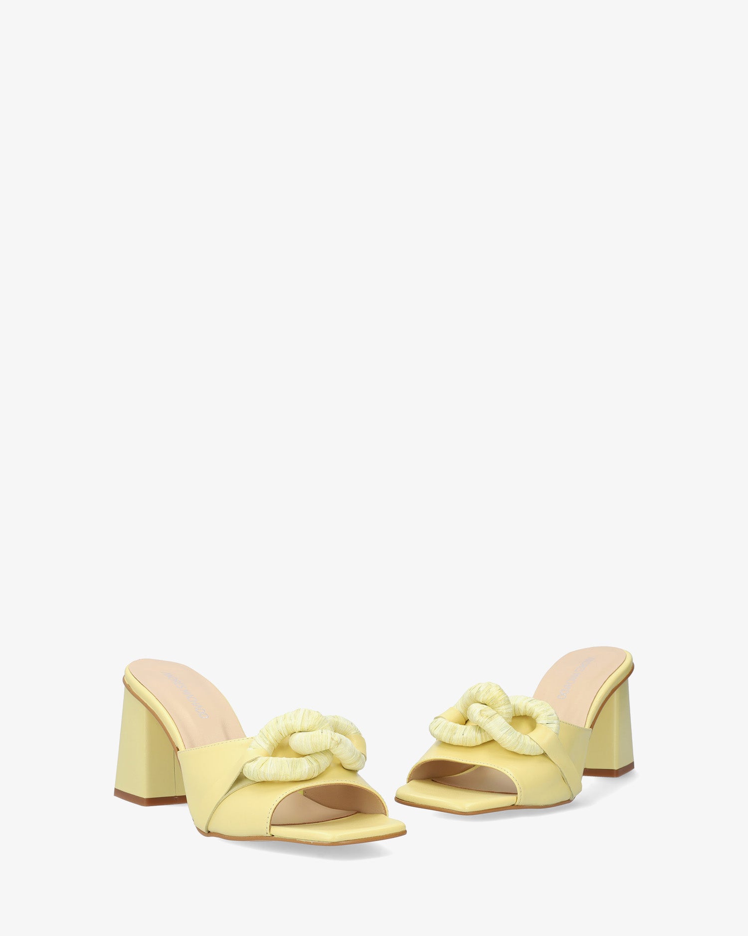 Sandały na kwadratowym obcasie, wykonane ze żółtej skóry. Szeroki pasek z dużym łańcuszkiem z rafii przy palcach. Wykończenie w formie kwadratowego noska. Obcas kwadratowy o wysokości 7,5 cm w pasujących kolorach do małych rozmiarów od 32 do 35. Obcas o wysokości 9 cm do dużych rozmiarów od 42 do 45. Wyprodukowano w Hiszpanii