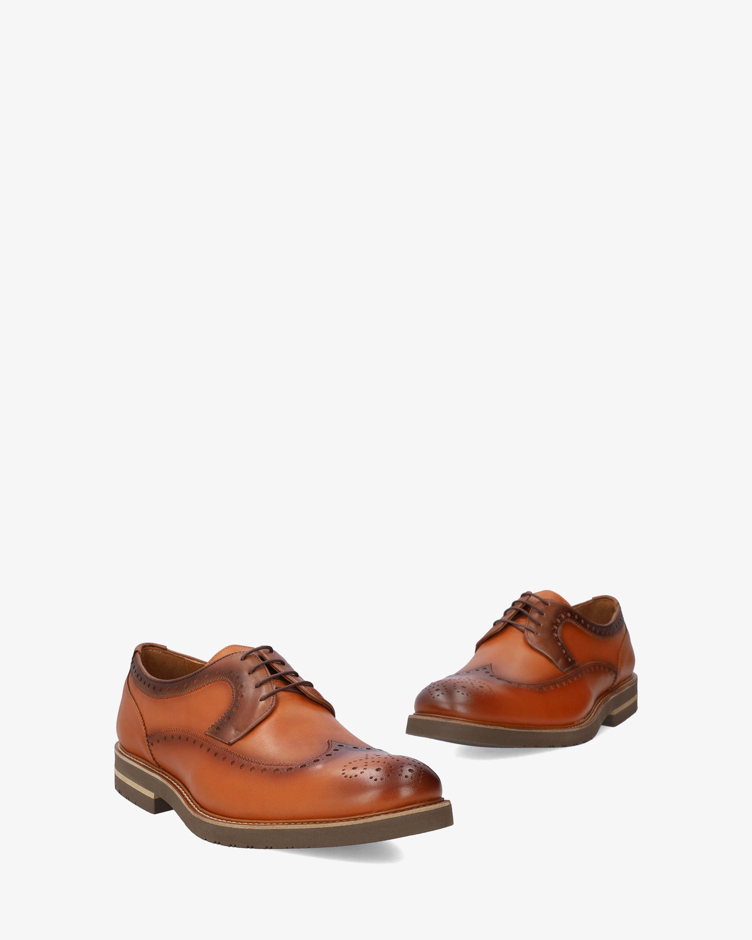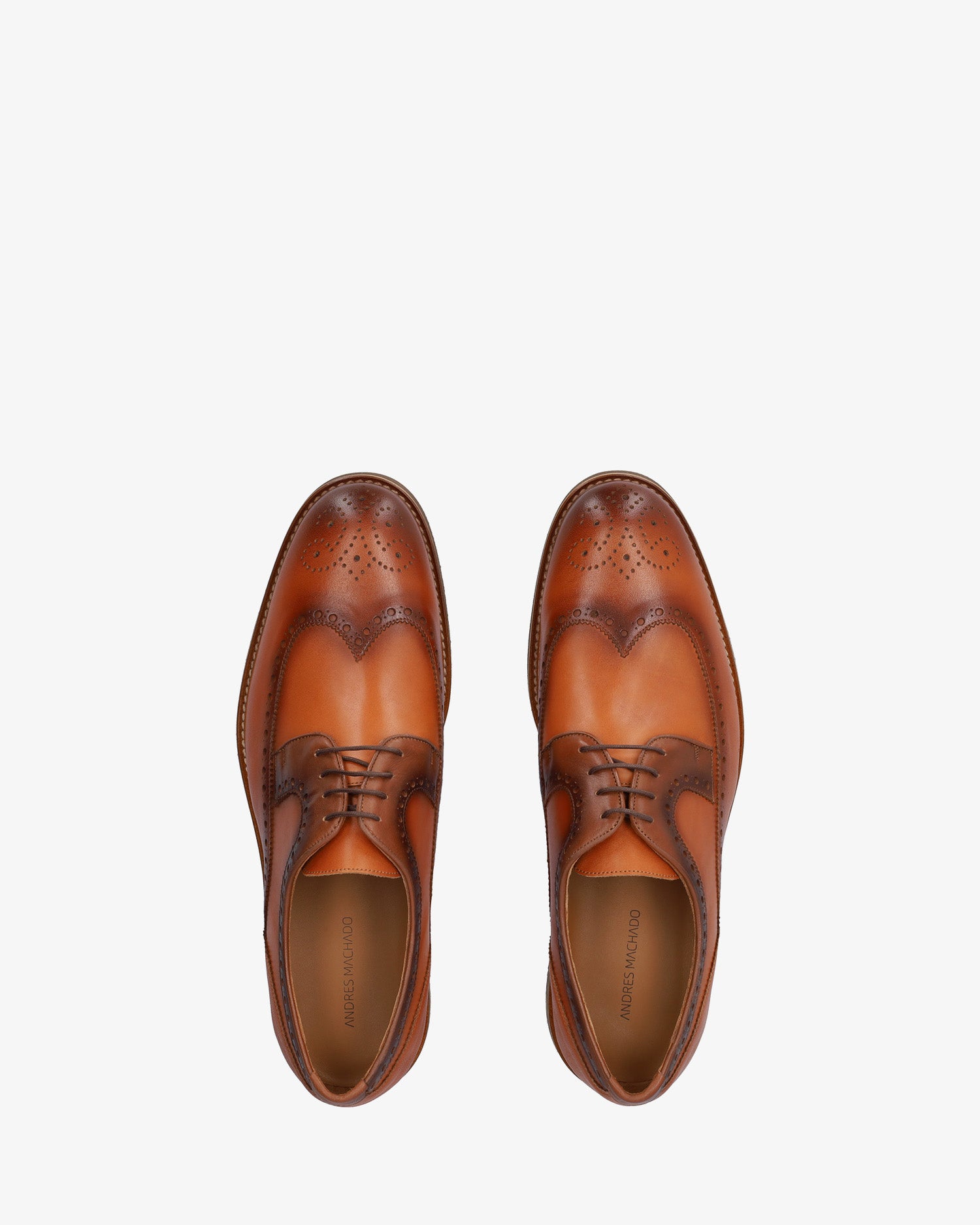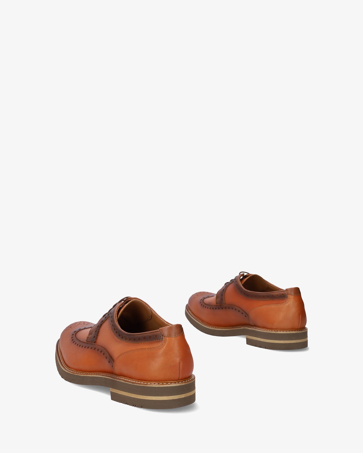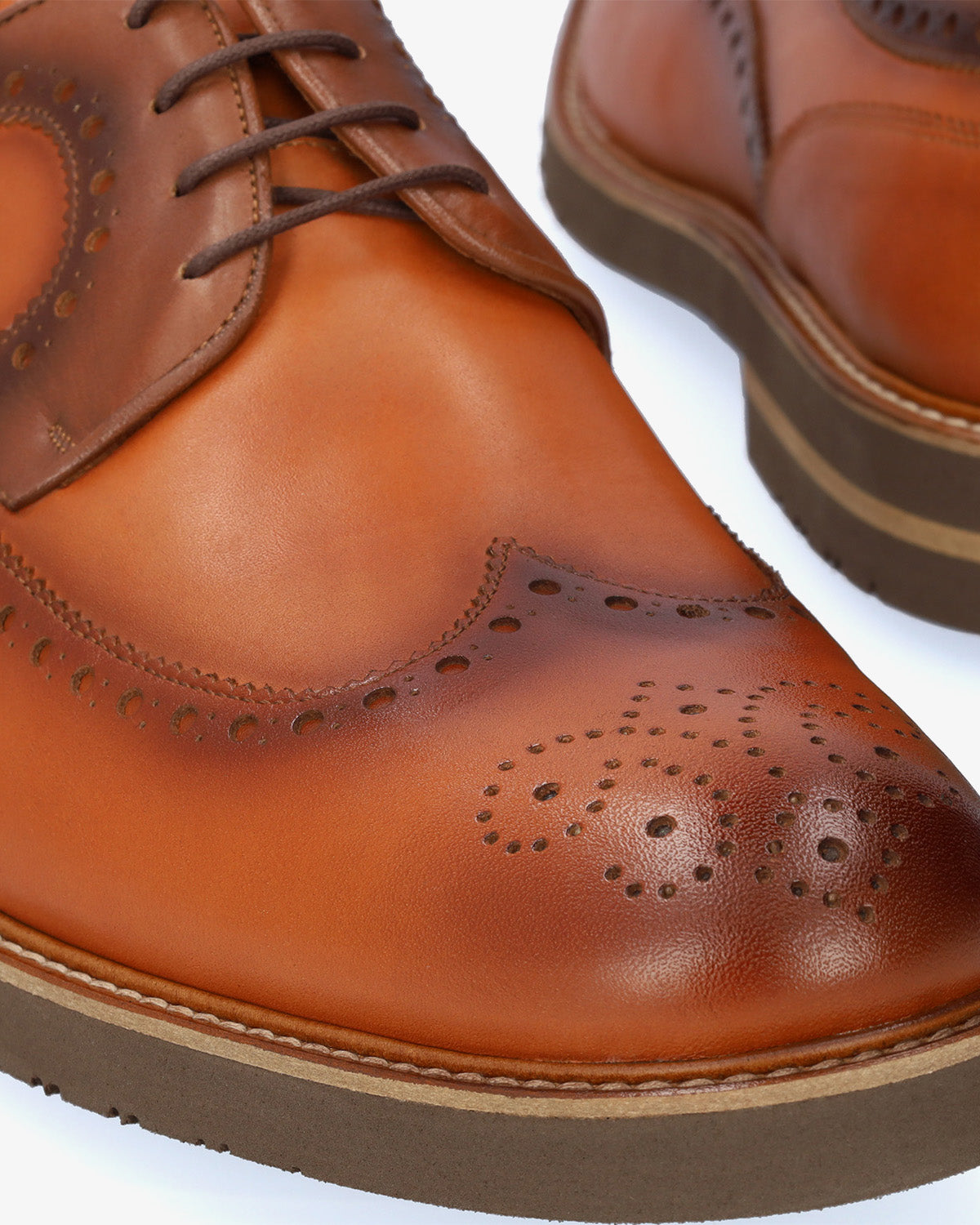 Skórzane buty typu Oxford w kolorze skórzanym. Typowe dla tego stylu są przycięte palce i boki. Dopasowane zapięcie na sznurówki. Wkładka i podszewka wykonane z ciemnobeżowej skóry. Dwukolorowa, ciemnobeżowa, szyta podeszwa Eva. Małe rozmiary od 38 do 40 i duże rozmiary od 47 do 50. Wyprodukowano w Hiszpanii.
