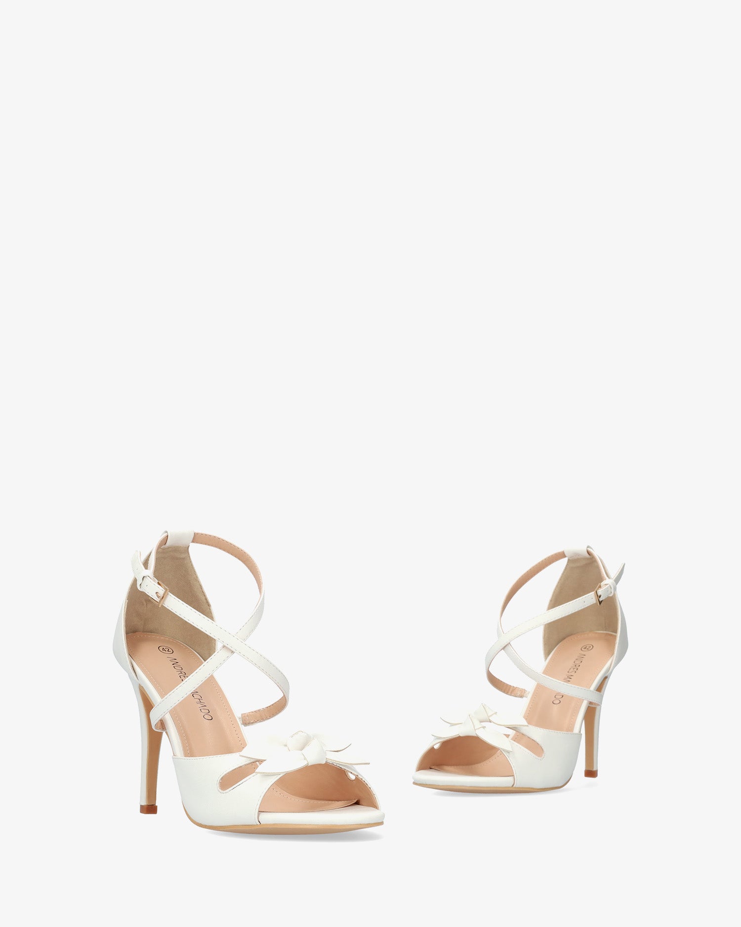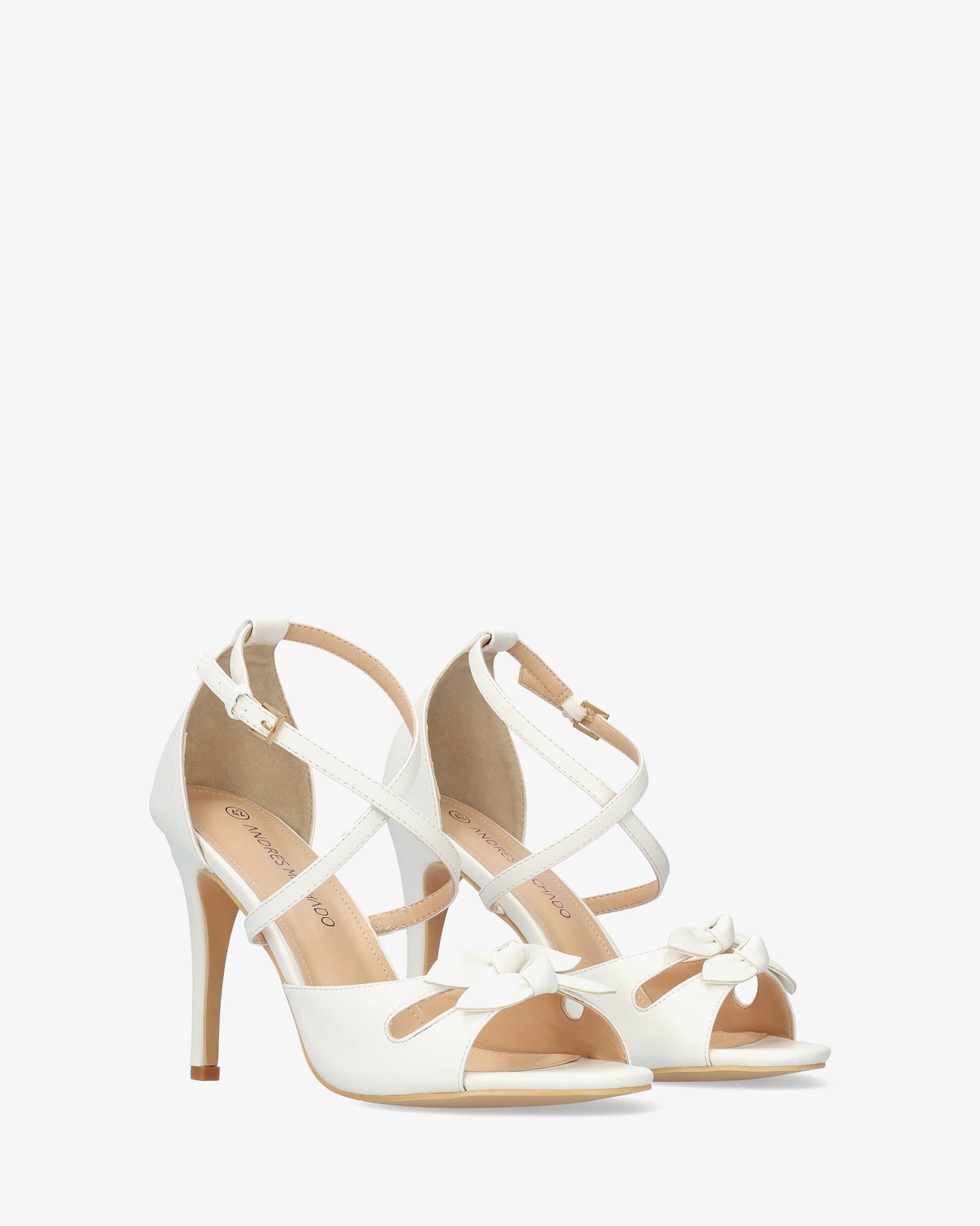 Miękkie białe sandały na wysokim obcasie. Model z zakrytym obcasem i dwoma paskami z pasującymi mini supełkami z przodu. Zapięcie na metalową klamrę z dwoma cienkimi skrzyżowanymi paskami na podbiciu. Odkryte palce. Obcas 9,5 cm dla małych rozmiarów od 32 do 35. Obcas 11 cm dla dużych rozmiarów od 42 do 45.