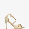 Miękkie złote sandały na wysokim obcasie. Model z zakrytym obcasem i dwoma paskami z pasującymi mini supełkami z przodu. Zapięcie na metalową klamrę z dwoma cienkimi skrzyżowanymi paskami na podbiciu. Odkryte palce. Obcas 9,5 cm dla małych rozmiarów od 32 do 35. Obcas 11 cm dla dużych rozmiarów od 42 do 45.
