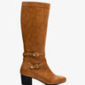 Miękkie kozaki do kolan w kolorze camelowym. Pasujące paski wokół kostki z ozdobnymi klamrami. Pasujący wewnętrzny zamek błyskawiczny. Obcas z imitacją drewna o szerokości 4,5 cm dla rozmiarów od 32 do 35. Obcas o szerokości 6 cm dla większych rozmiarów od 42 do 45. Ten model jest zaniżony; zalecamy zamówienie o jeden rozmiar większego niż zwykle. Według opinii klientów, ten model kozaków ma węższą cholewkę niż zwykle.