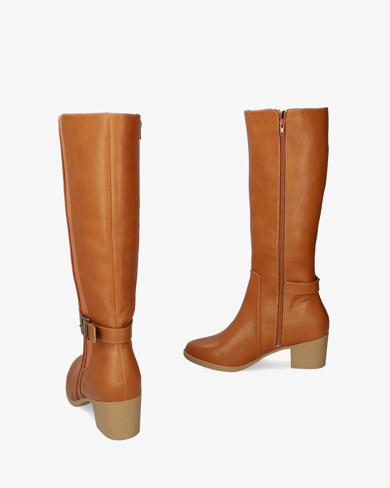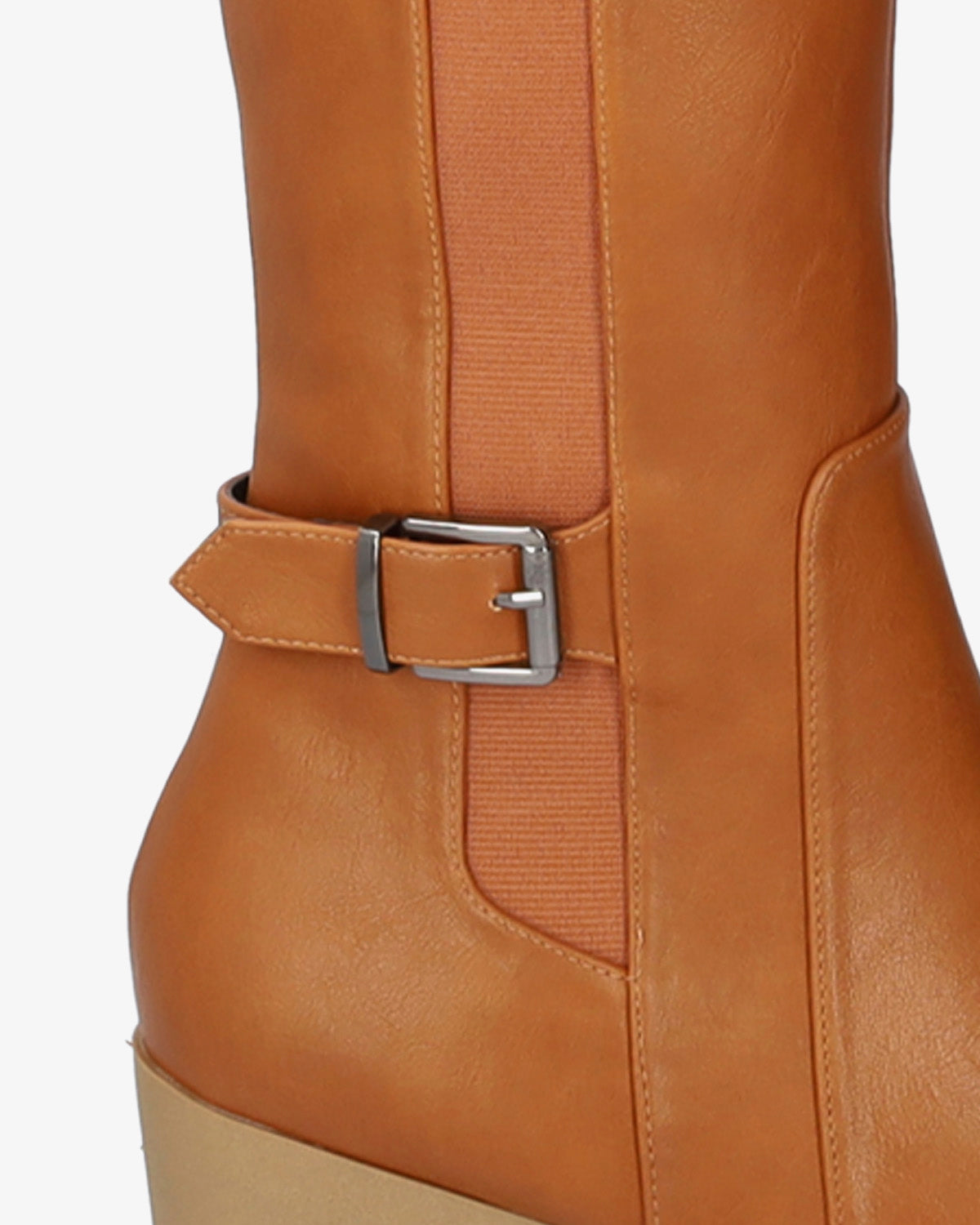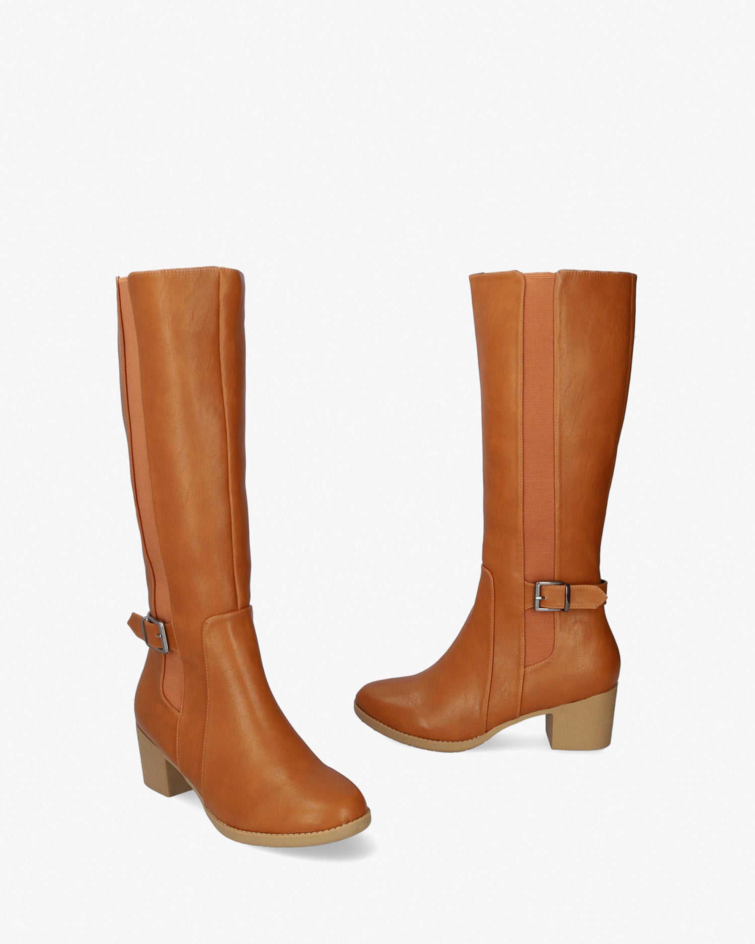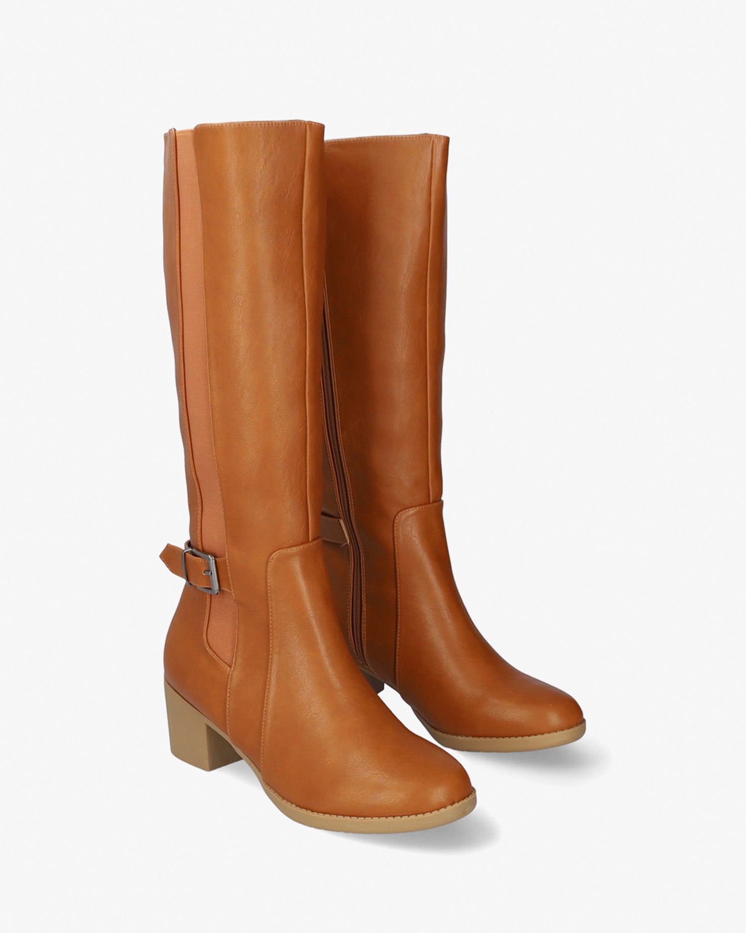 Miękkie kozaki do kolan w kolorze camelowym z brązowym elastycznym paskiem po zewnętrznej stronie i ozdobną klamrą przy kostce. Zapięcie na zamek błyskawiczny w tym samym kolorze od wewnątrz. Zaokrąglony nosek. Obcas z krepy o wysokości 5 cm dla małych rozmiarów od 32 do 35. Obcas o wysokości 6 cm dla dużych rozmiarów od 42 do 45. Na podstawie opinii klientów, ten model kozaków ma węższą cholewkę niż zwykle. Ten model może mieć odchylenia od standardu; zalecamy sprawdzenie wymiarów wkładki lub wkładki.
