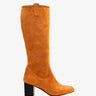 Buty wykonane ze skóry zamszowej w kolorze wielbłądzim. Wysoka cholewka z zapięciem na suwak po wewnętrznej stronie. Szczegóły pasującego uchwytu. Obcas o wysokości 5,5 cm, imitujący drewno, odpowiedni dla małych rozmiarów od 32 do 35. Obcas o wysokości 7 cm odpowiedni dla dużych rozmiarów od 42 do 45.