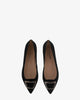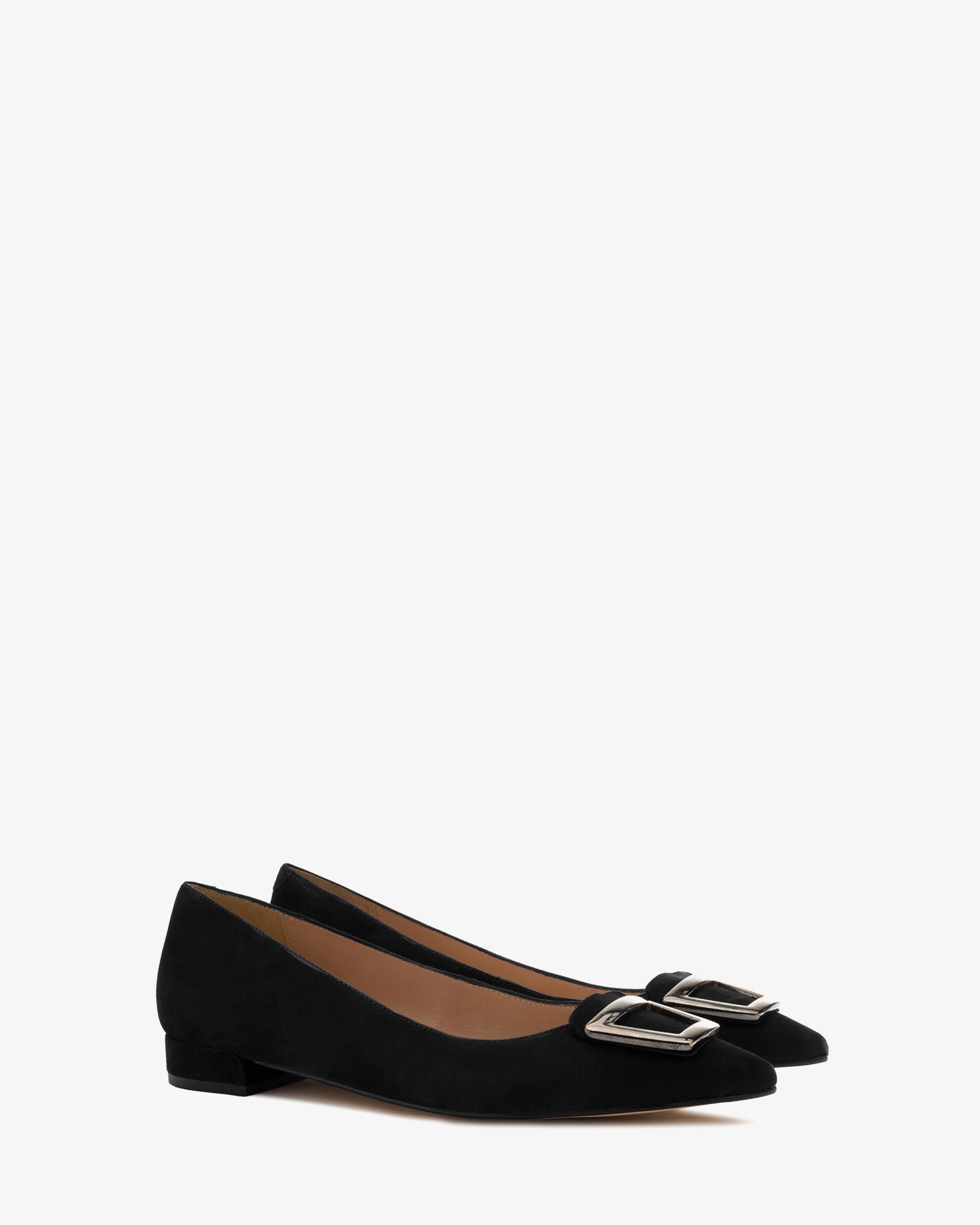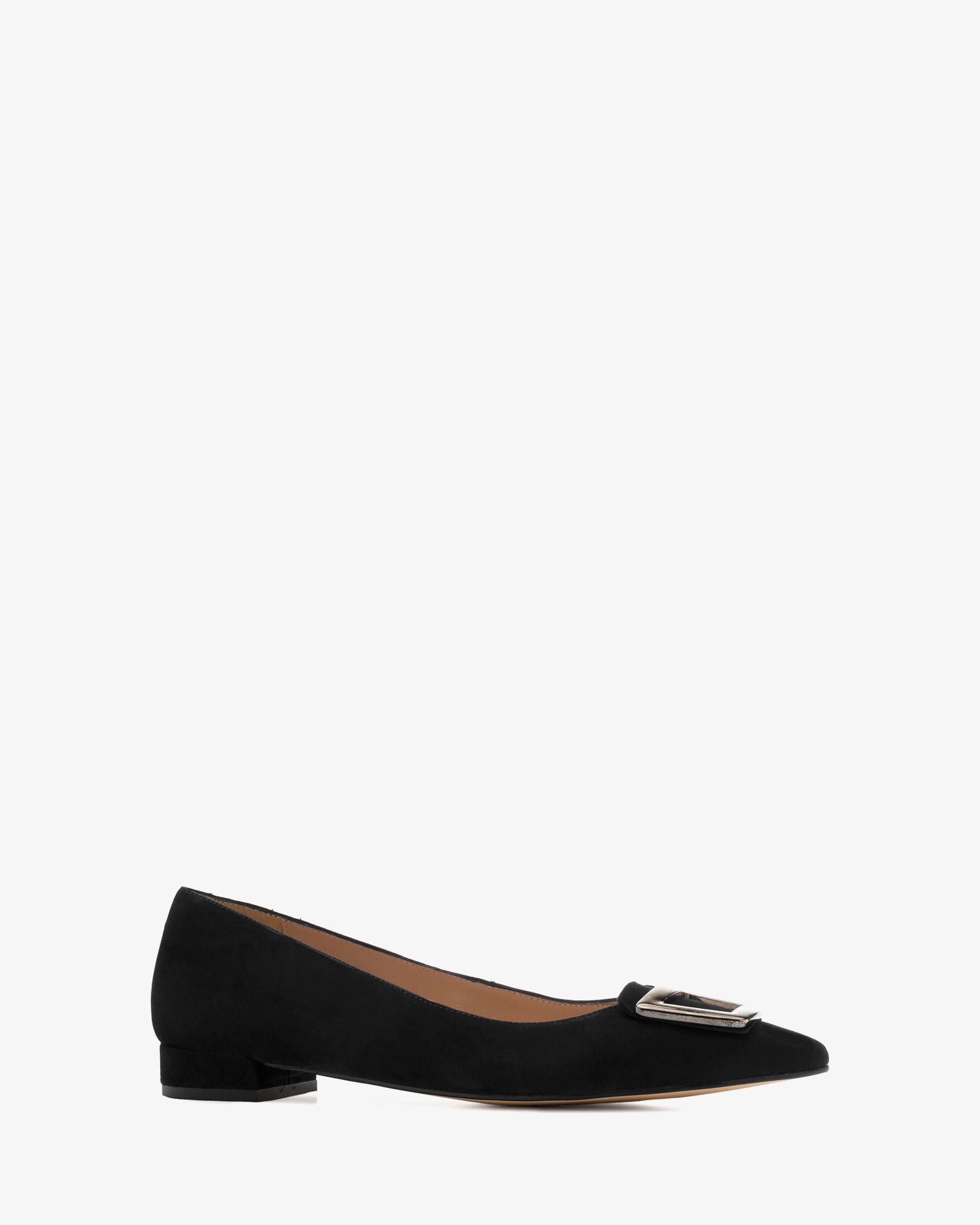 Czarne zamszowe baleriny. Kwadratowa metalowa aplikacja na palcach. Wykończone cienkim szpicem i skórzaną podszewką. 2-centymetrowy, dopasowany, mini obcas dla małych rozmiarów od 32 do 35. 2-centymetrowy obcas dla dużych rozmiarów od 42 do 45. Wyprodukowano w Hiszpanii.