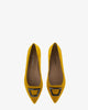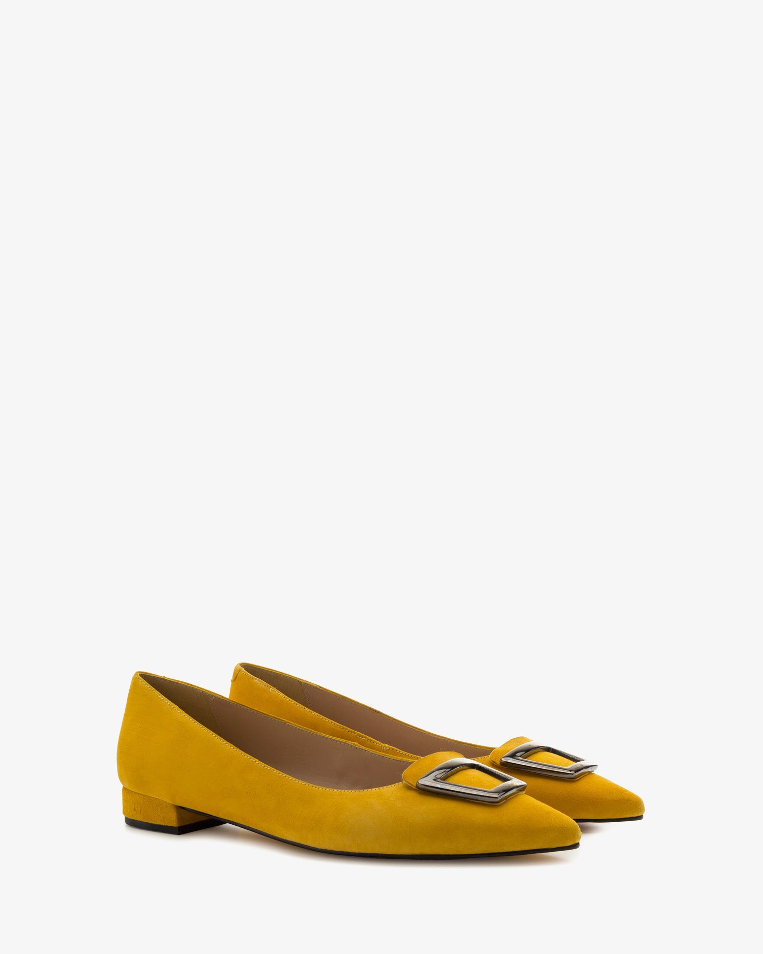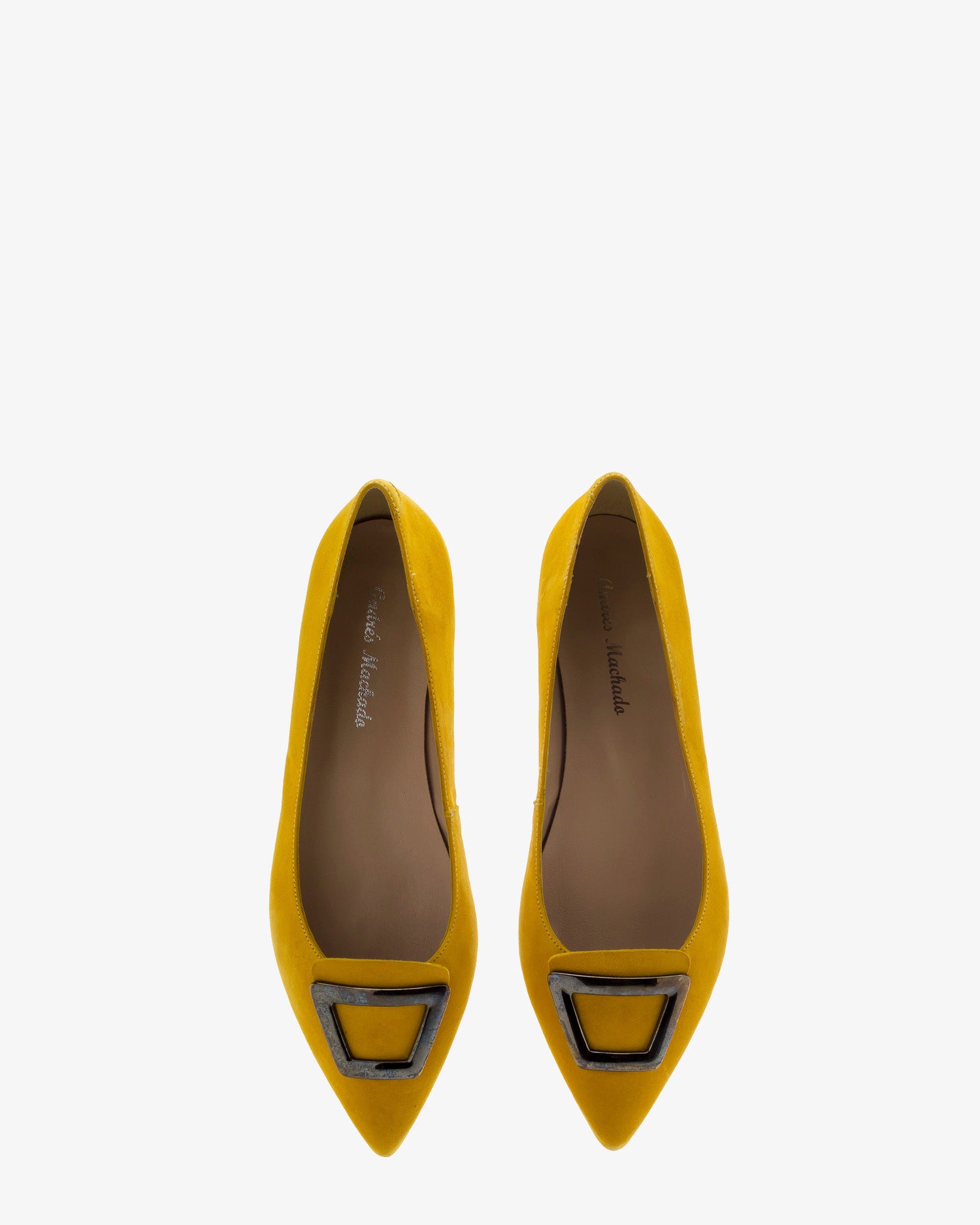 Baleriny zamszowe w kolorze musztardowym. Kwadratowa metalowa aplikacja na palcach. Wykończone cienkim szpicem i skórzaną podszewką. 2-centymetrowy, dopasowany, mini obcas dla małych rozmiarów od 32 do 35. 2-centymetrowy obcas dla dużych rozmiarów od 42 do 45. Wyprodukowano w Hiszpanii.