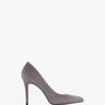 Szpilki ze spiczastym noskiem i szarym zamszowym obcasem. Podszewka i wkładka wykonane z różowej skóry. Cienki obcas o wysokości 9,5 cm dla małych rozmiarów od 32 do 35. Cienki obcas o wysokości 11,5 cm dla dużych rozmiarów od 42 do 45. Wyprodukowano w Hiszpanii.