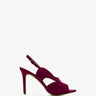 Sandały zamszowe z odkrytym tyłem w kolorze fuksji. Szeroki, falisty pasek wokół podbicia. Pasek z tyłu zapinany na sprzączkę z boku. Wnętrze wyłożone skórą. Cienki obcas typu szpilka o wysokości 10,5 cm, podszyty w pasujących kolorach, do małych rozmiarów od 32 do 35. Cienki obcas o wysokości 11,5 cm, podszyty w pasujących kolorach, do dużych rozmiarów od 42 do 45. Wyprodukowano w Hiszpanii