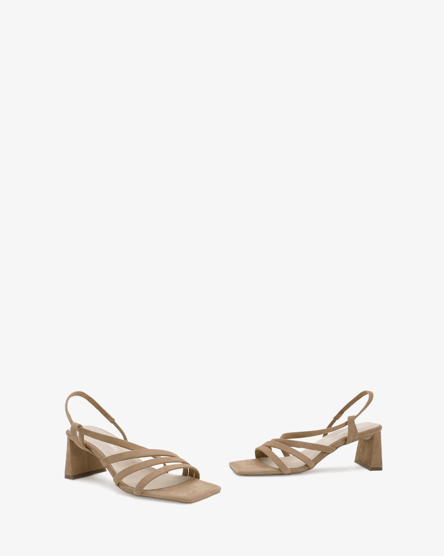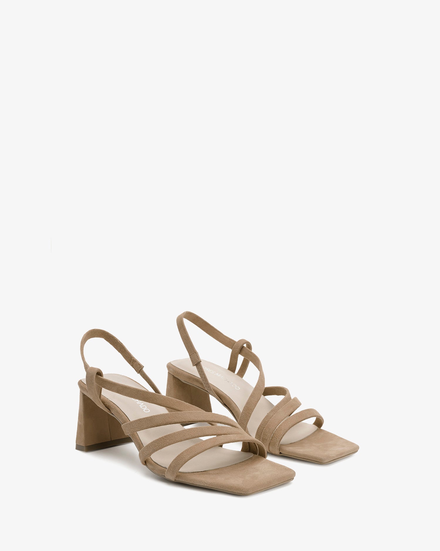 Sandały zamszowe w kolorze skóry. Wzór składający się z cienkich, skośnych pasków w tym samym odcieniu na podbiciu. Ukośny pasek z boku nad podbiciem i wokół kostki z dopasowaną gumką dla większego wsparcia. Obcas w kształcie prostokąta. Dostępne rozmiary od 32 do 45. Dostępne rozmiary od 32 do 45. Obcas 5,5 cm dla rozmiarów od 32 do 38. Obcas 6 cm dla rozmiarów od 39 do 45. Wyprodukowano w Hiszpanii.