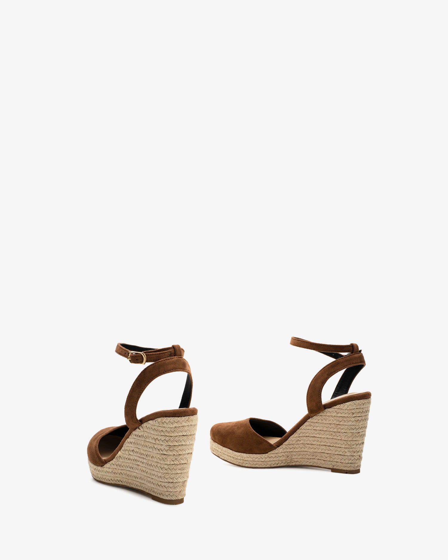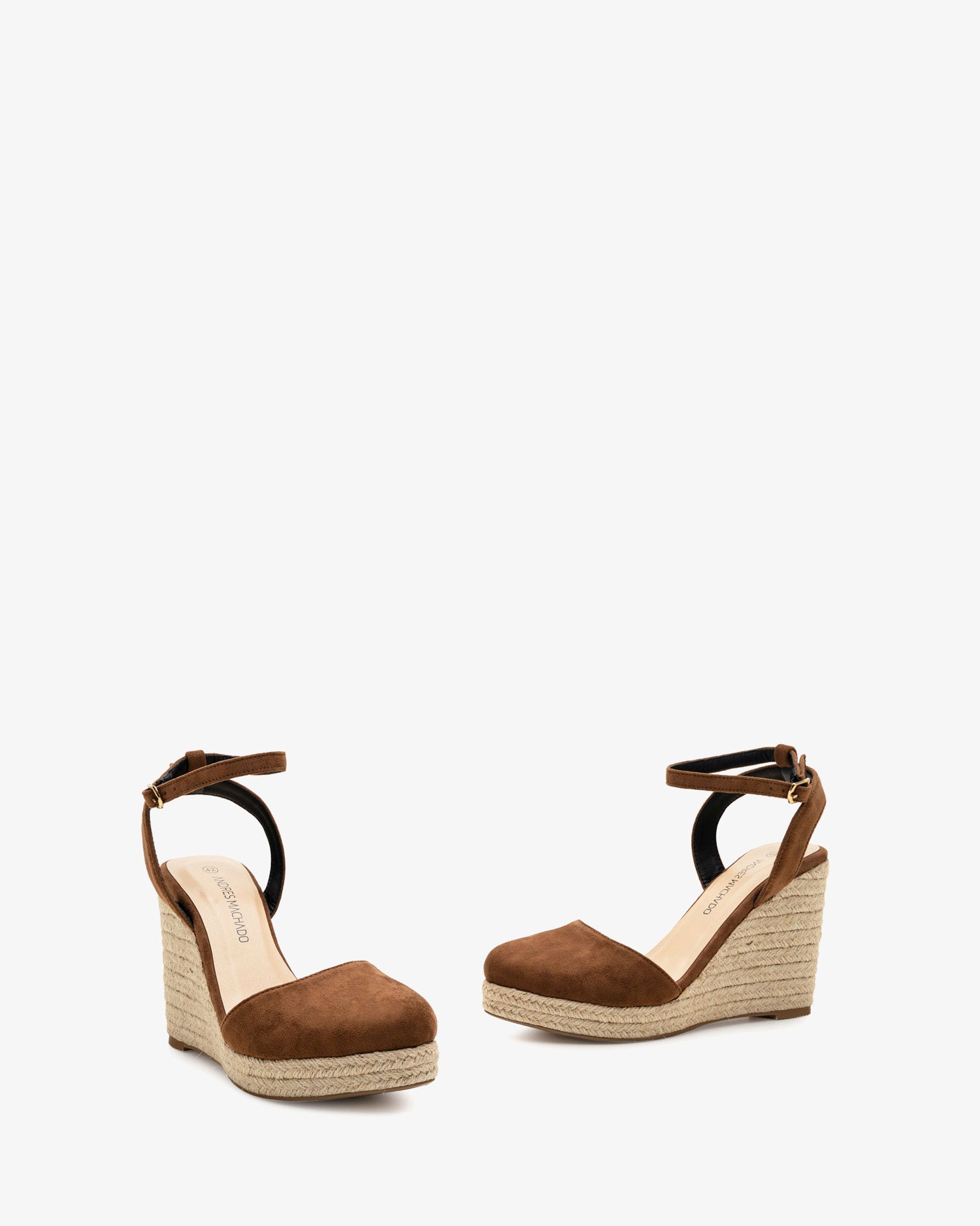 Alpargata en símil ante de color Marron con cuña en yute. Diseño destalonado con cierre de hebilla con pulsera al tono en el tobillo. Punta cerrada y redondeada. Cuñas y plataforma delantera en yute. Cuña de 10 cm y plataforma de 2 cm para las tallas pequeñas de la 32 a la 35. Cuña de 11,5 cm y plataforma de 2 cm para las tallas grandes de la 42 a la 45.