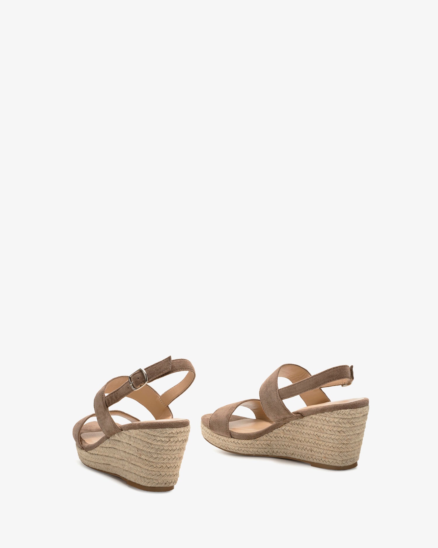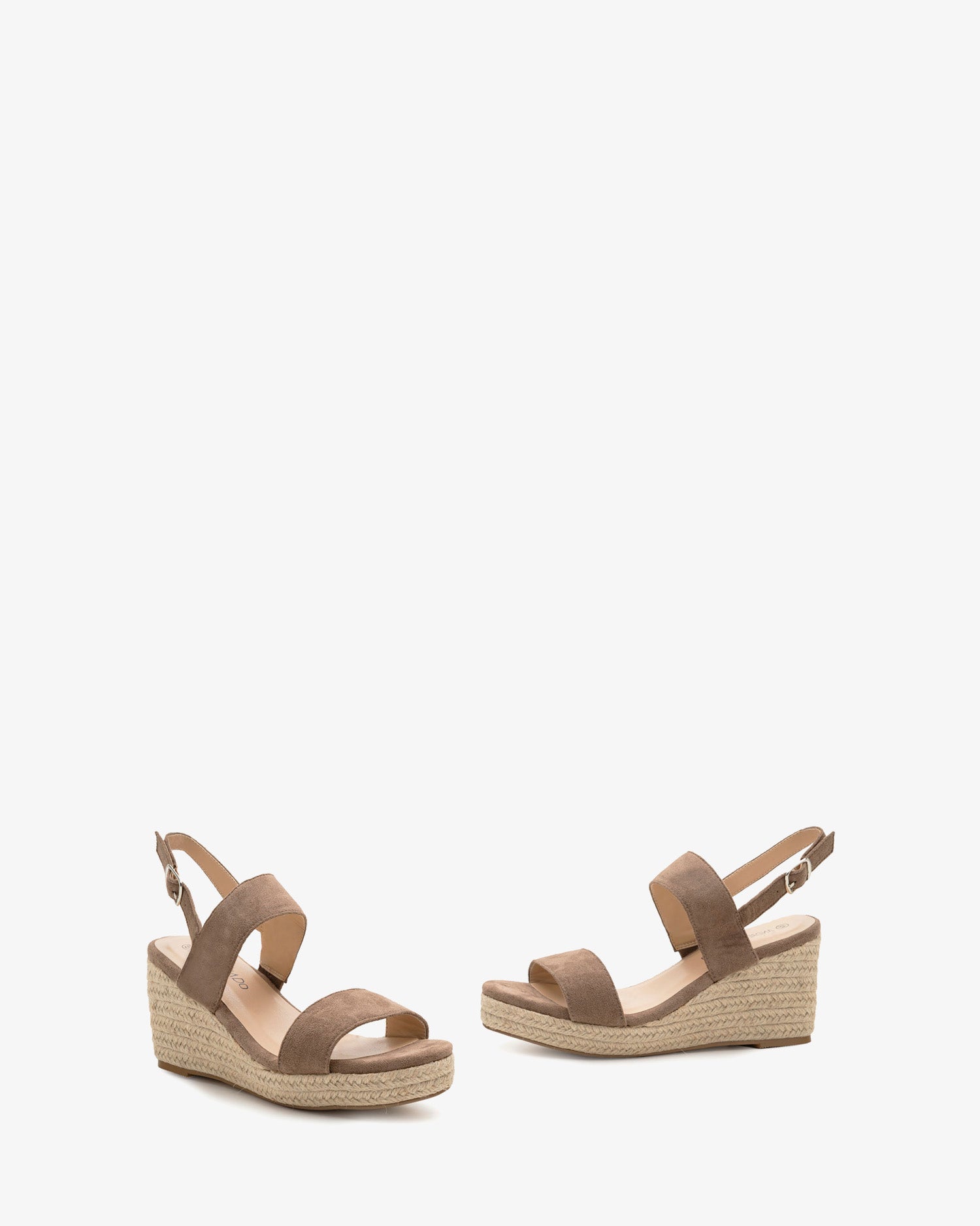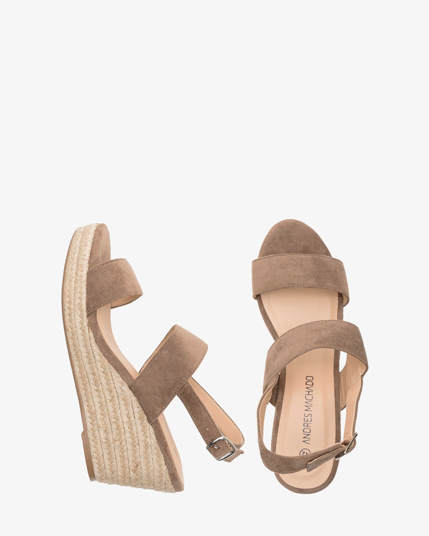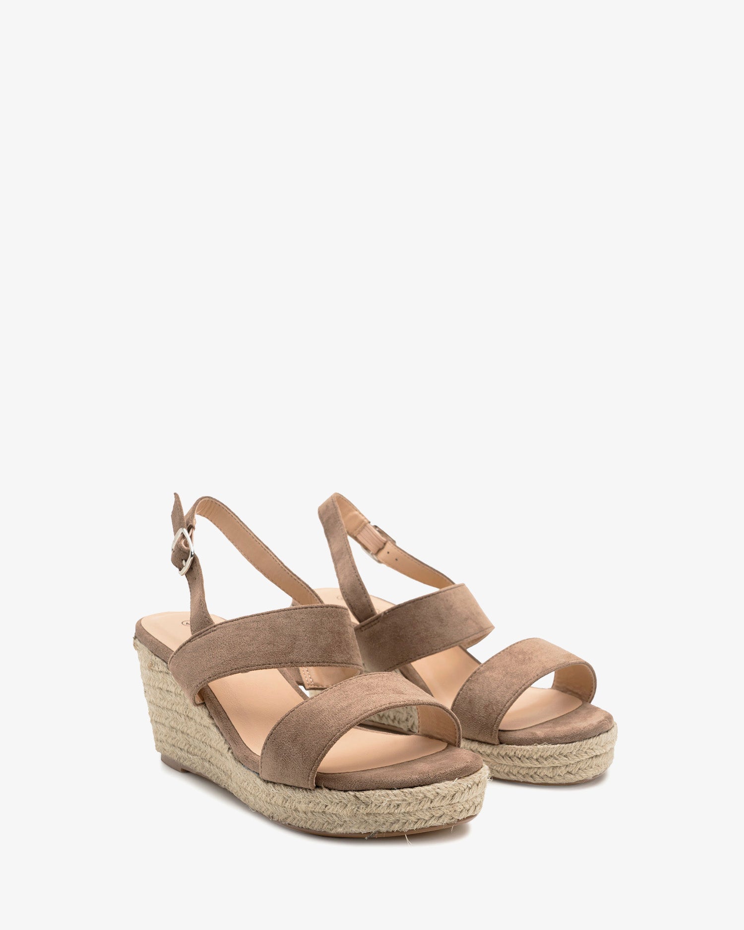 Alpargata en símil ante en color tierra con cuña en yute. Diseño de dos tiras anchas al tono en la puntera y alrededor del empeine. Cierre de hebilla con tiras al tono en la parte trasera. Punta redondeada y abierta. Cuña de 7 cm yplataforma de 2 cm para las tallas pequeñas de la 32 a la 35. Cuña de 8 cm yplataforma de 2 cm para las tallas grandes de la 42 a la 45. Este modelo calza pequeño, se recomienda coger una talla más de la habitual.
