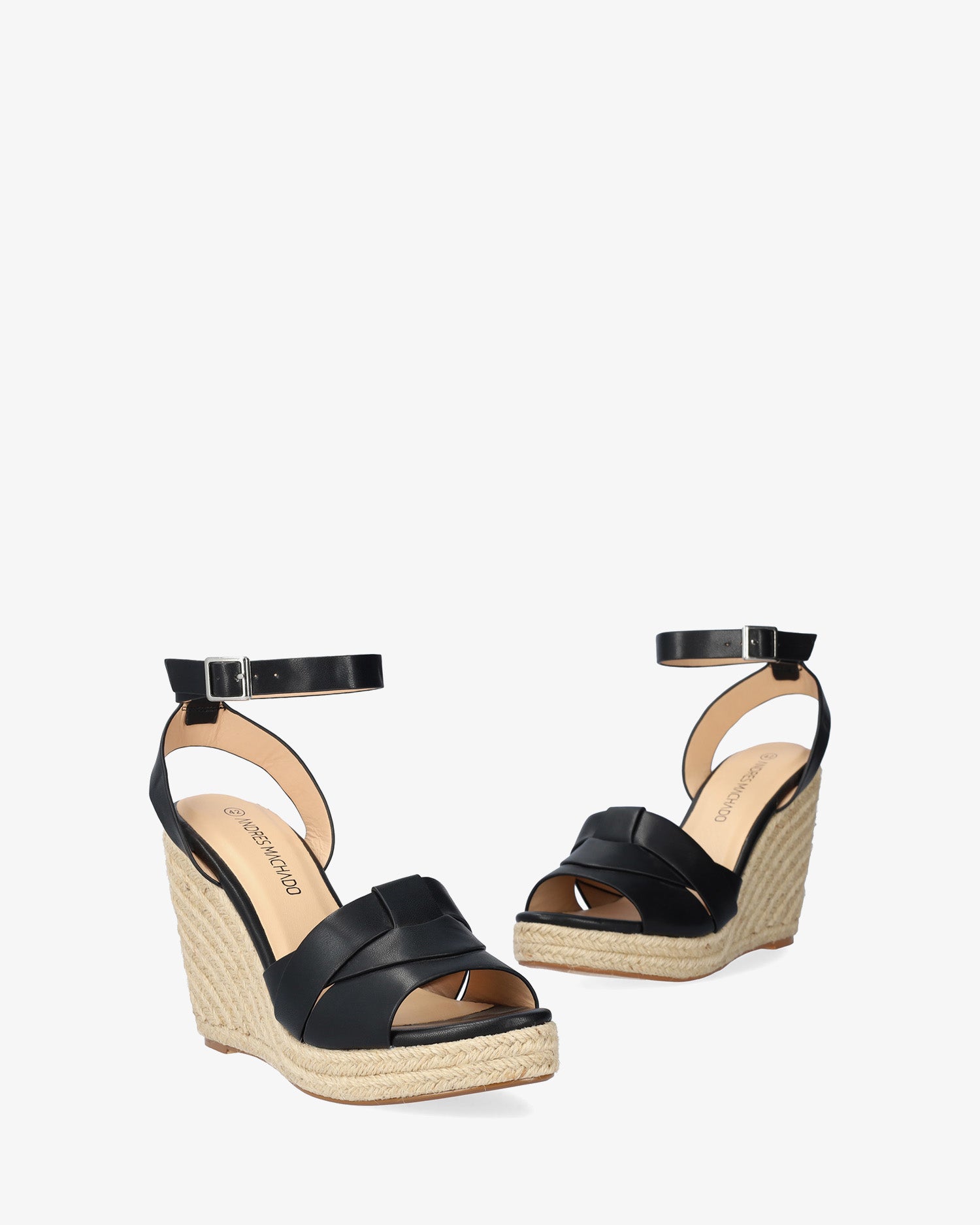 Alpargatas en soft de color Negro con cuña. Diseño destalonado con tiras entrelazadas en la parte delantera. Cierre de hebilla con pulsera al tono en el tobillo. Puntera abierta. Cuñas y plataforma delantera en yute. Cuña de 10 cm y plataforma de 2 cm para las tallas pequeñas de la 32 a la 35. Cuña de 12 cm y plataforma de 2 cm para las tallas grandes de la 42 a la 45.