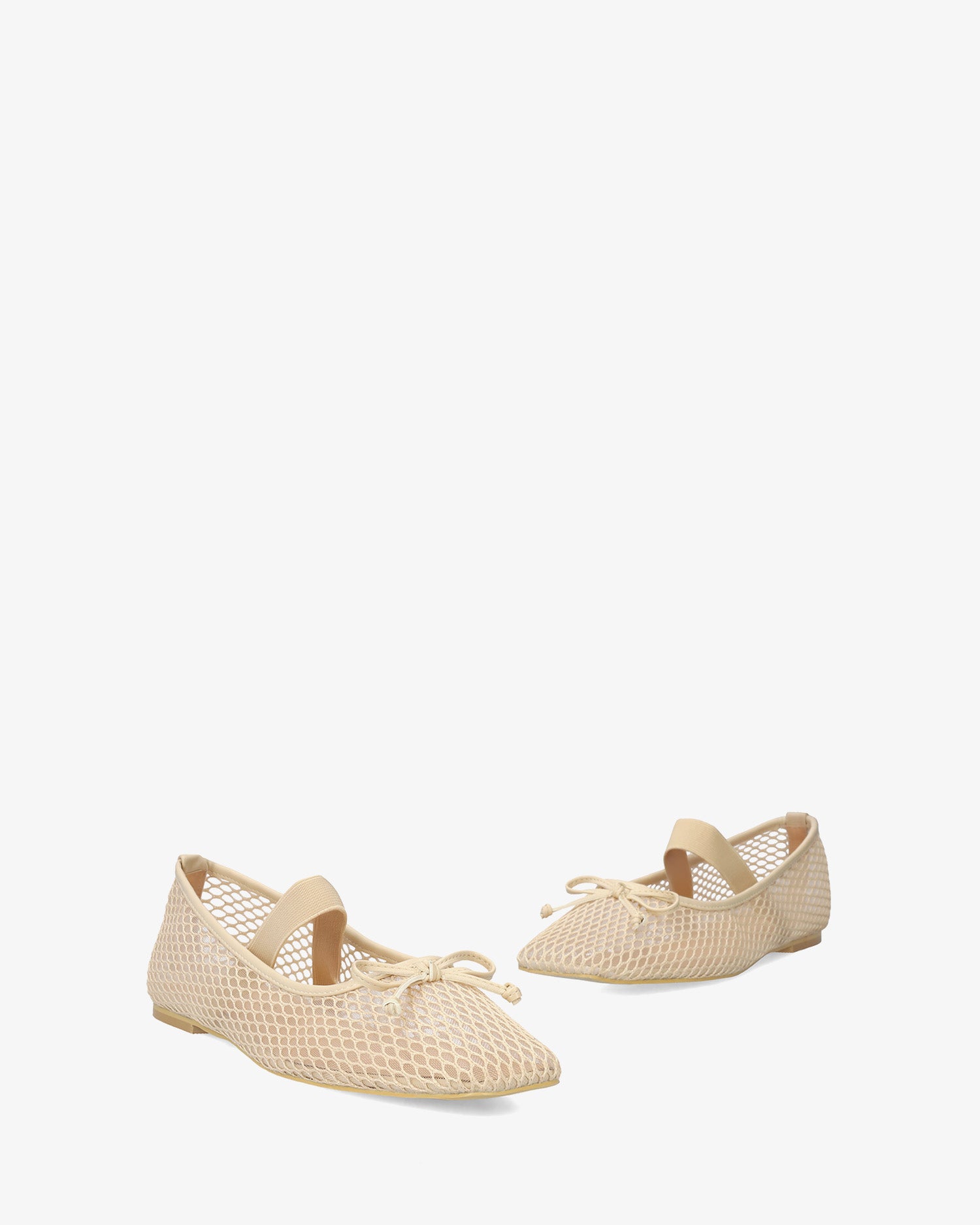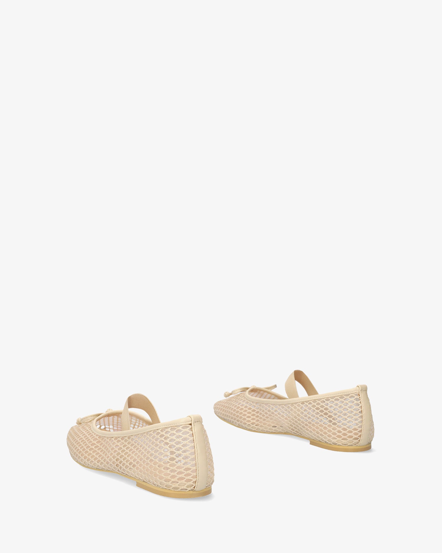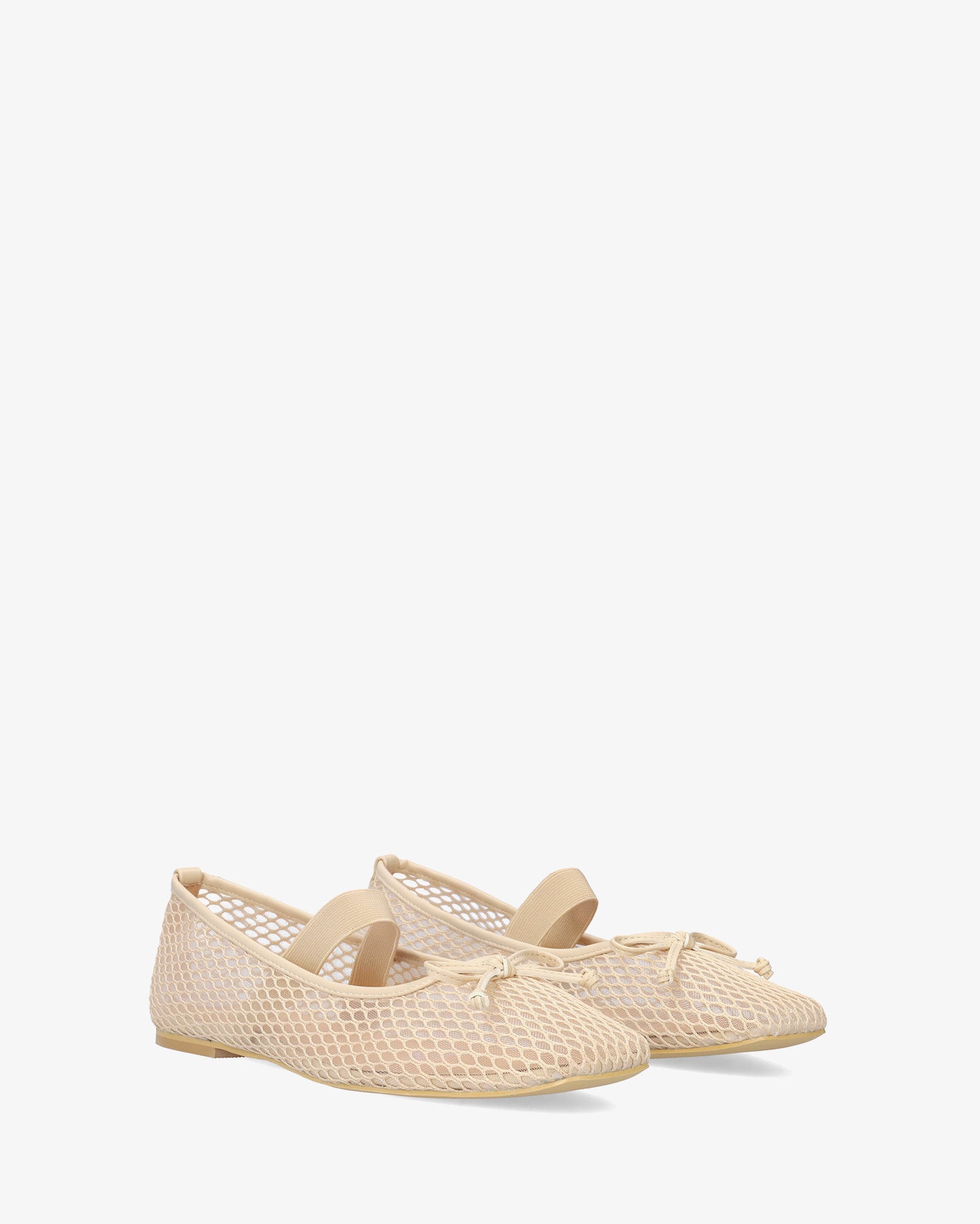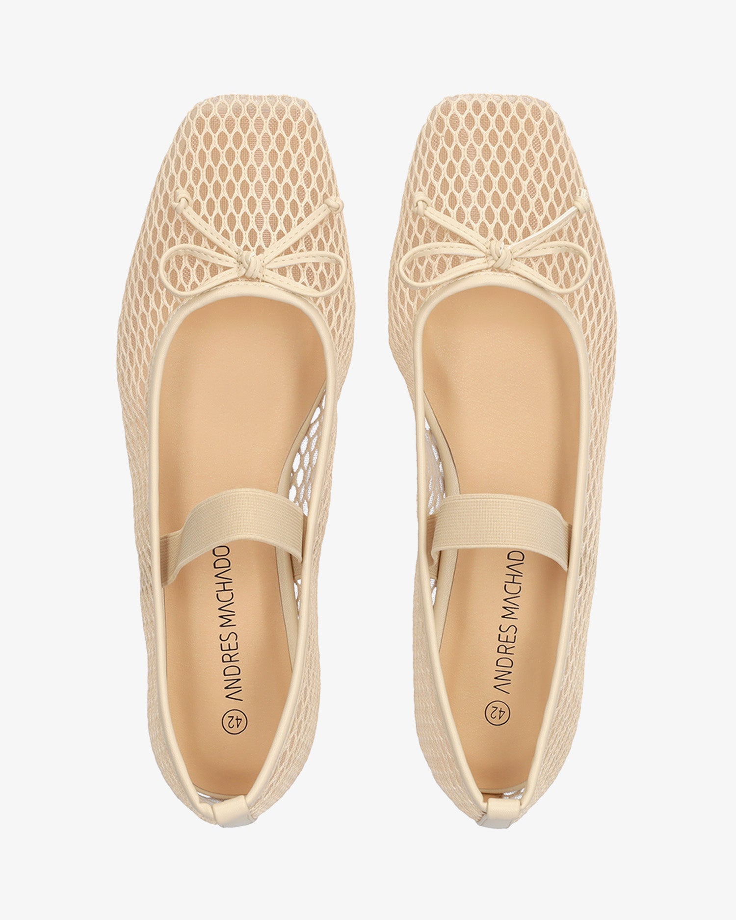 Bailarina plana de rejilla con punta cuadrada, detalle de lazo delantero y tira ancha elástica en el empeine al tono. Disponible para las tallas pequeñas de la 32 a la 35 y tallas grandes de la 42 a la 46.
