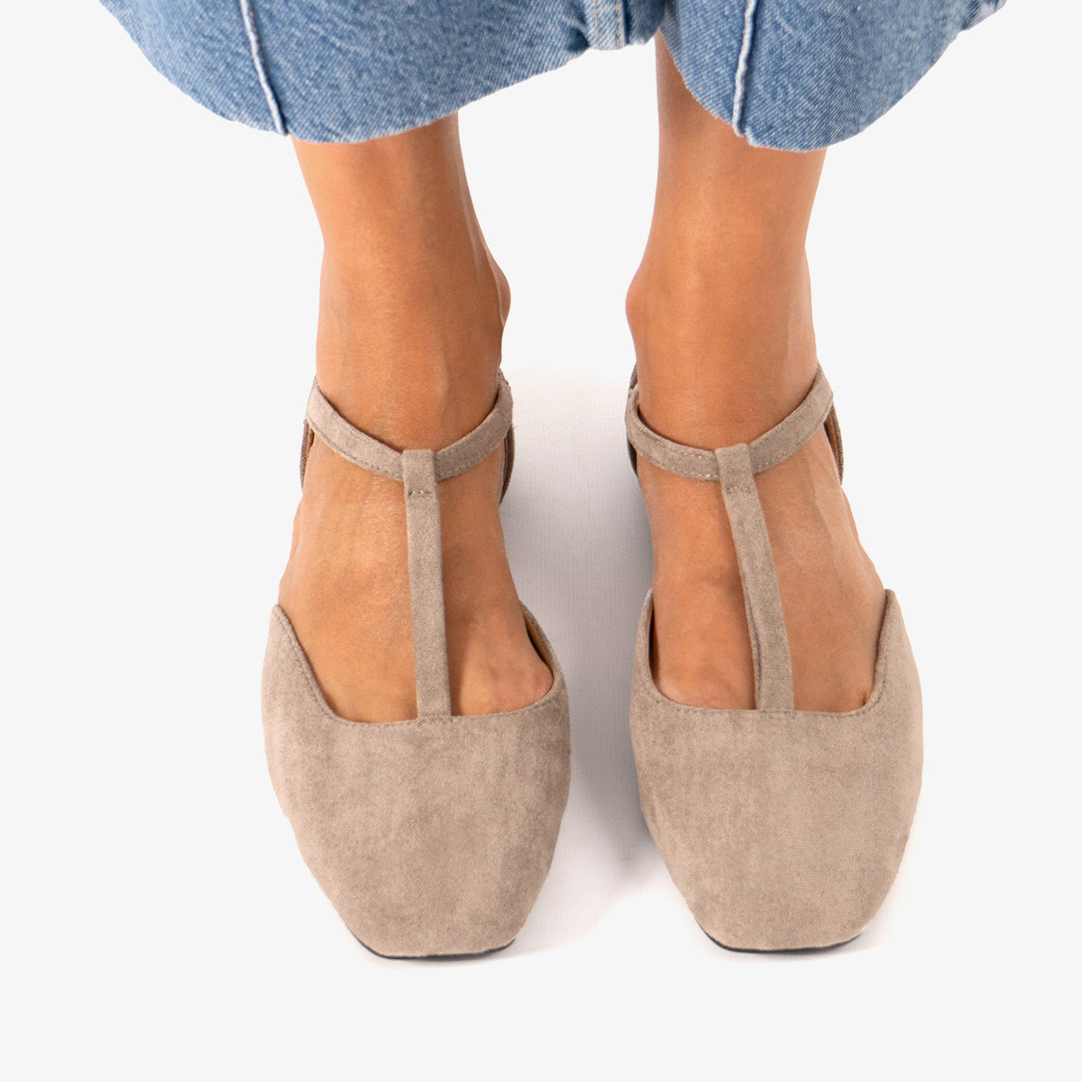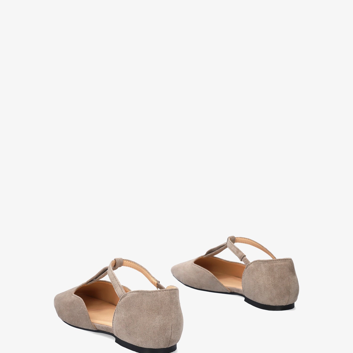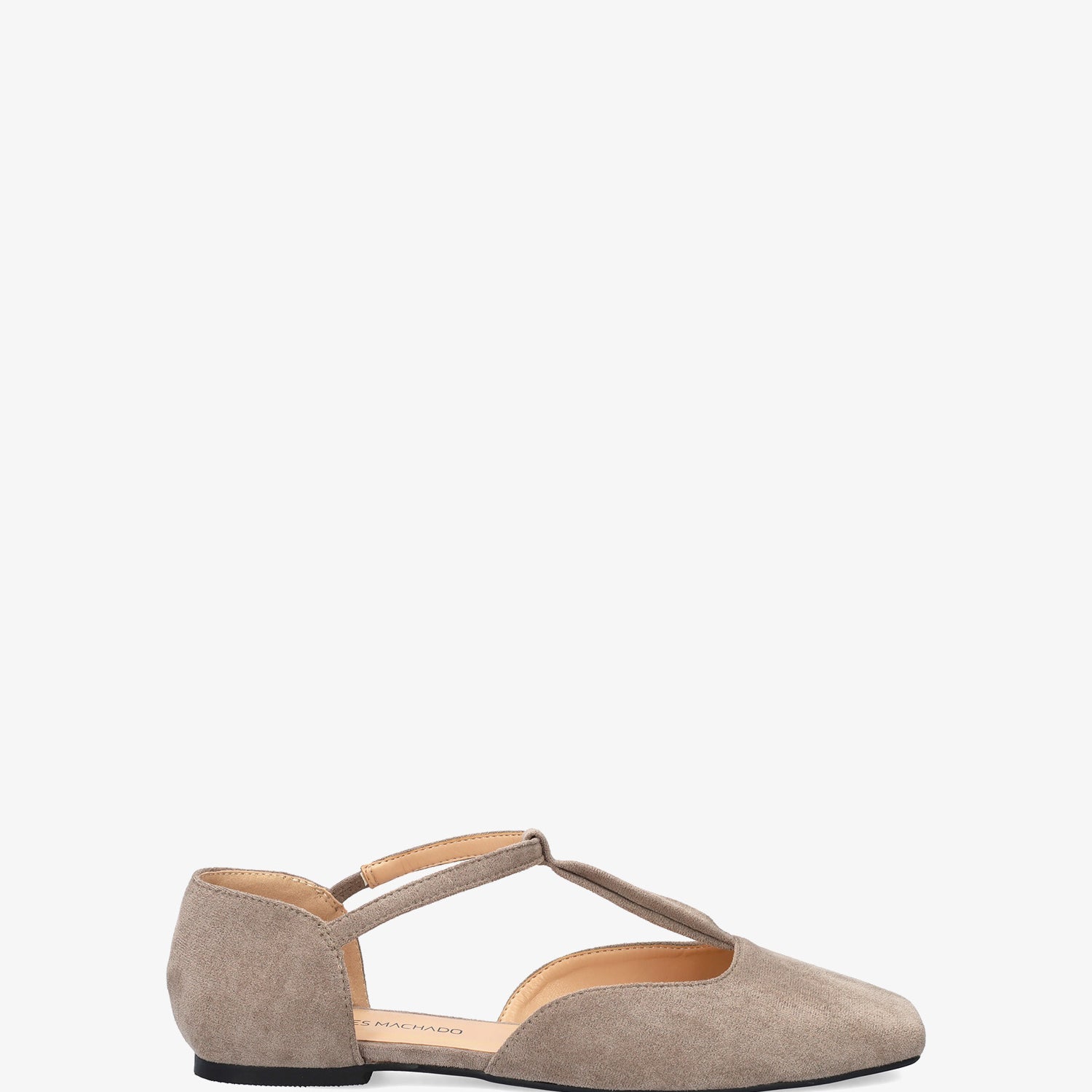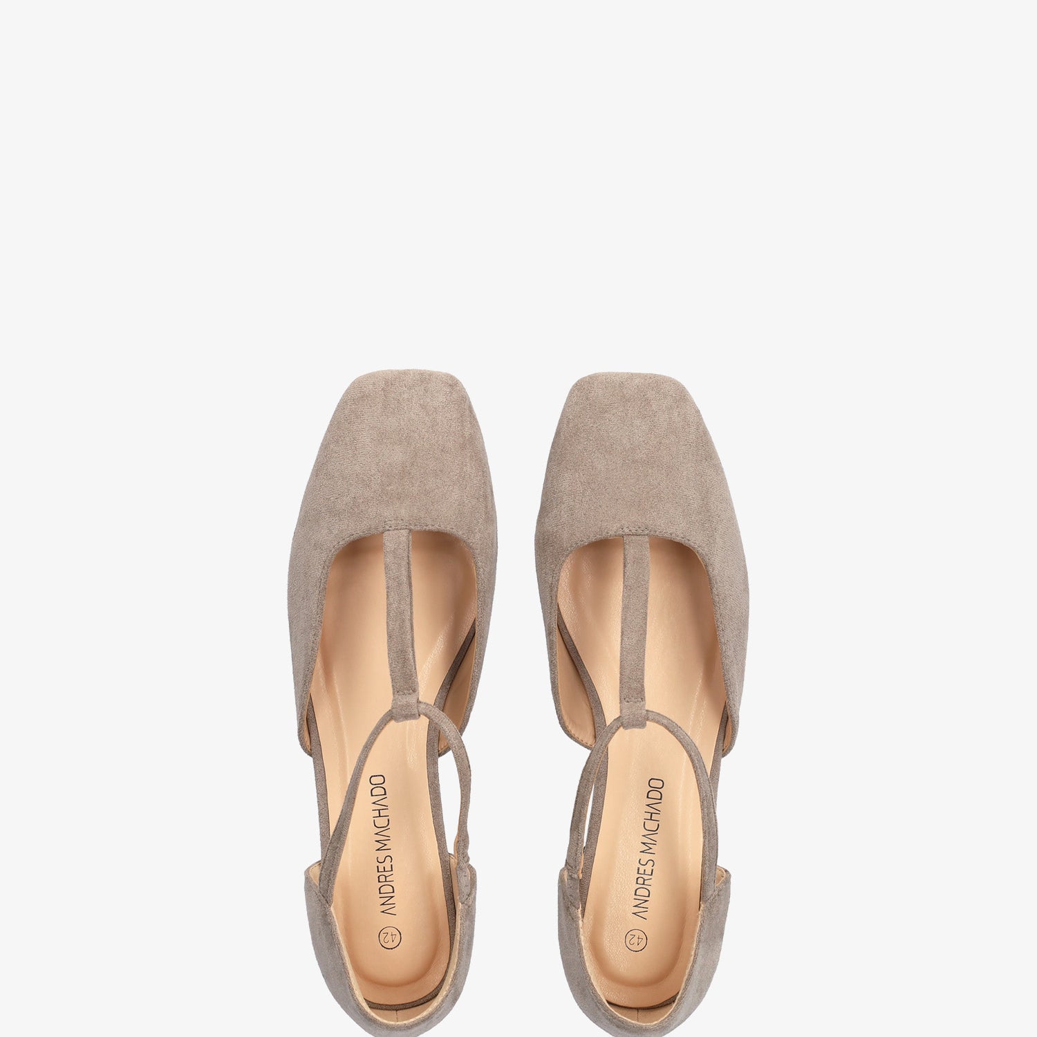 Bailarina plana en símil de ante en color Gris. Diseño acabado en punta cuadrada cerrada, con tira central en T invertida sobre empeine con elástico, para mejor sujeción al tobillo.Disponible para las tallas grandes de la 42 a la 46.