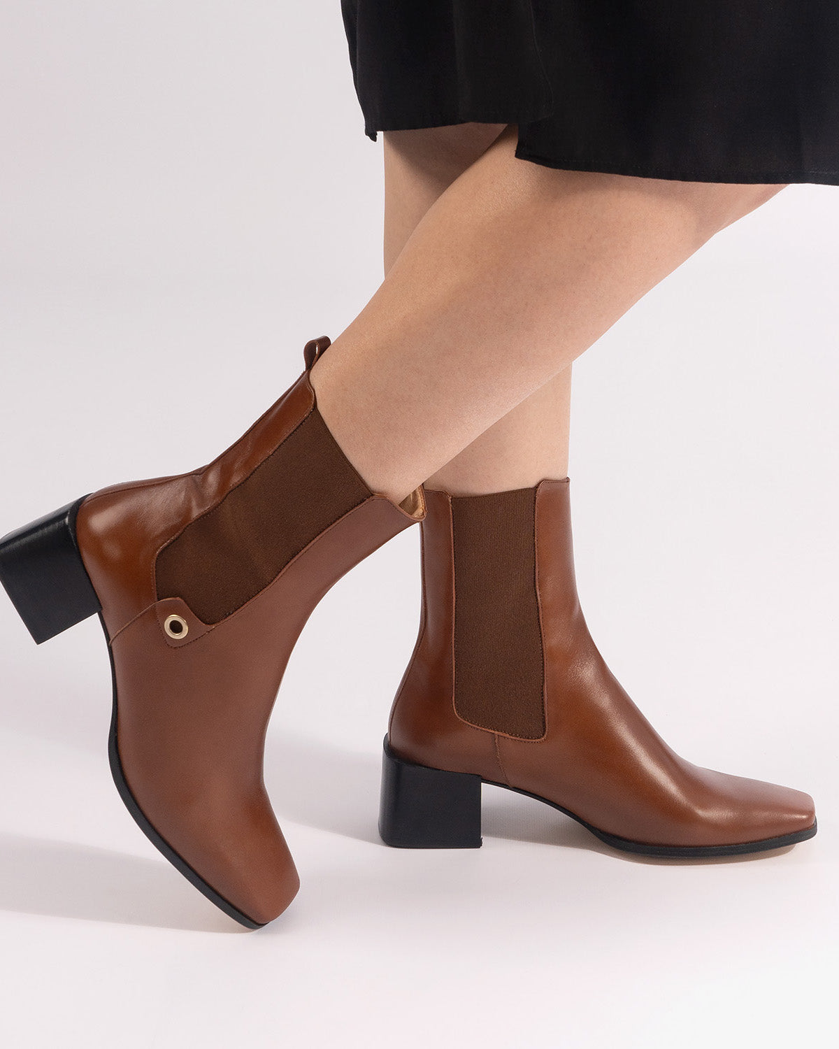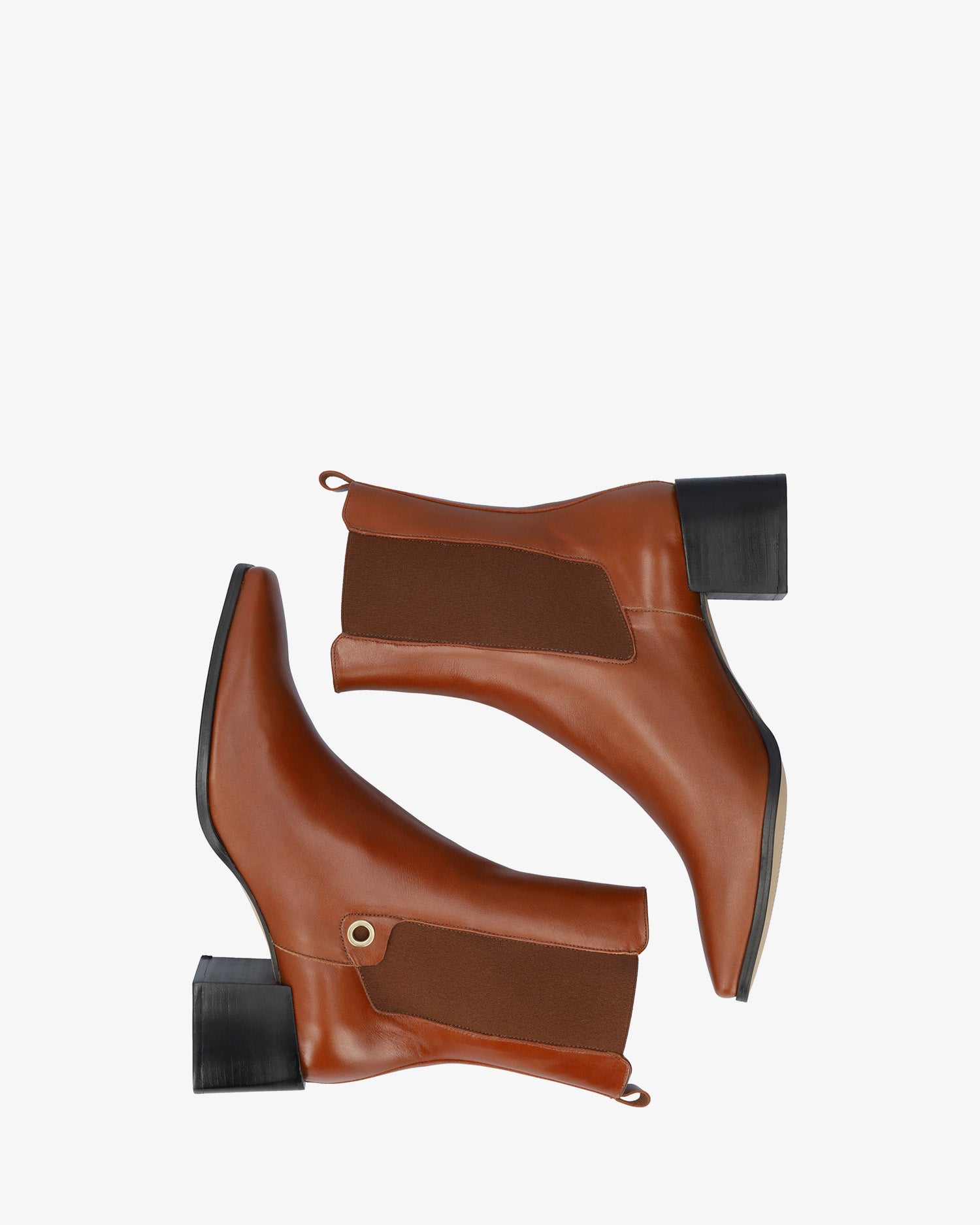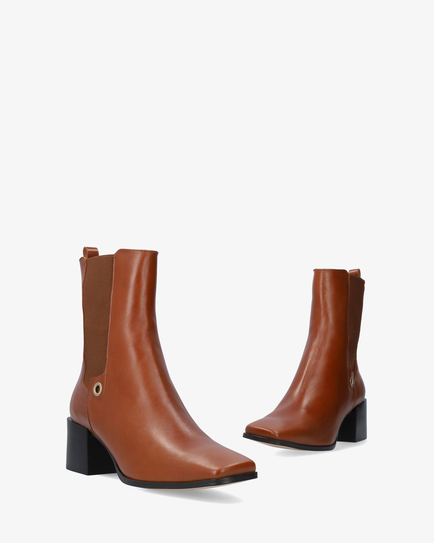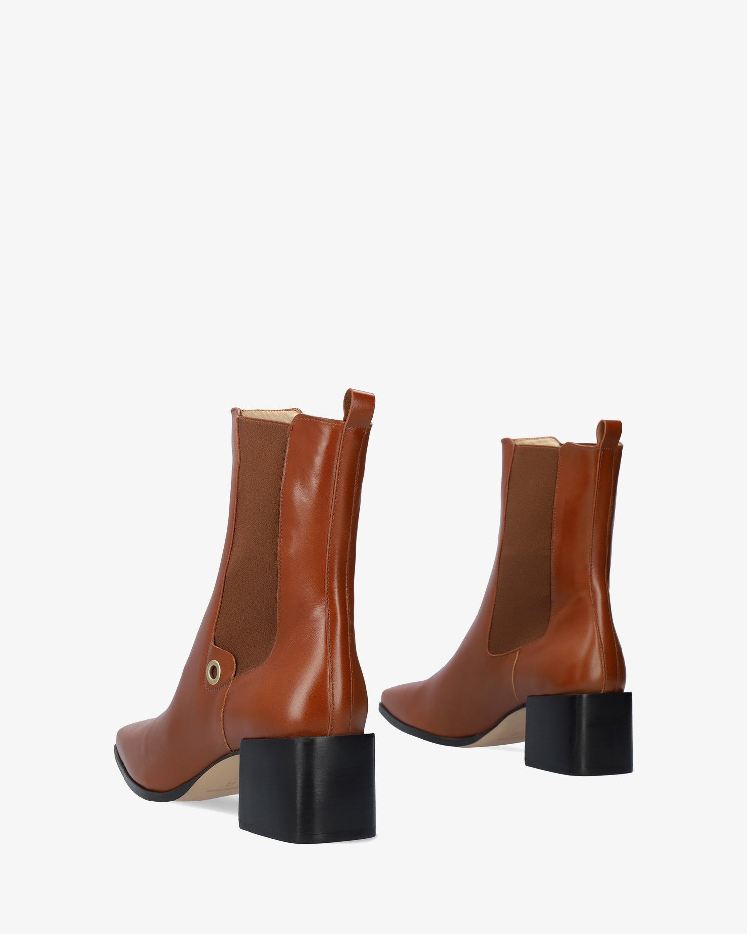 Botín de estilo Chelsea en piel de color Cognac. Elásticos al tono en los laterales con detalle de tachuela dorada en la parte exterior y tirador en piel al tono. Forro interior en piel y acabado en punta cuadrada. Tacón cuadrado efecto madera de 5 cm de alto para las tallas pequeñas de la 32 a la 35. Tacón de 6 cm de alto para las tallas grandes de la 42 a la 45. Fabricado en España.
