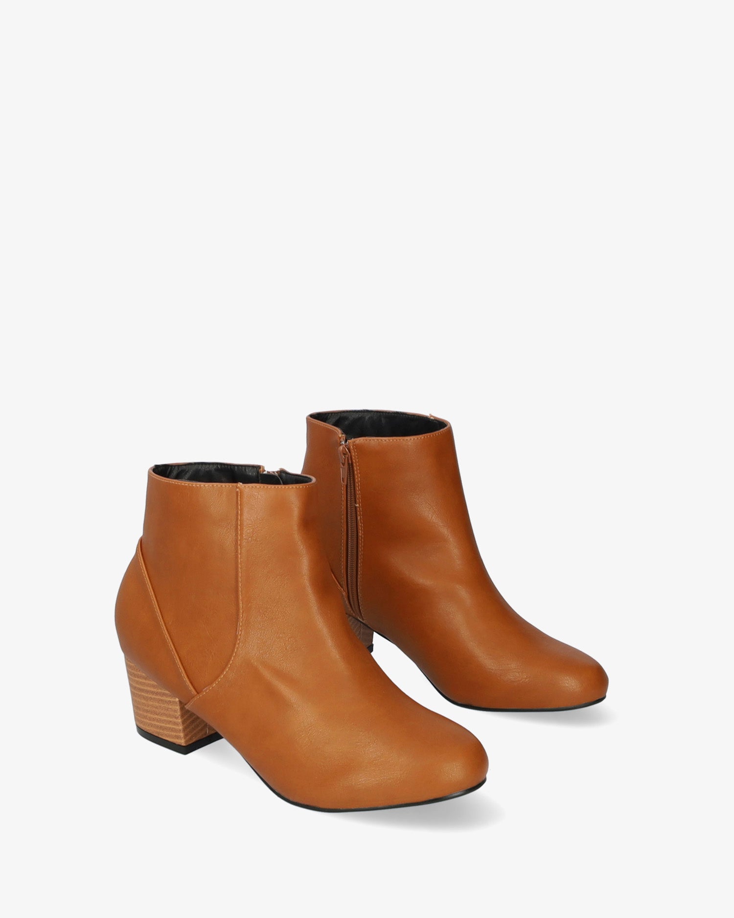 Botín en soft de color camel. Pespunte decorativo en la talonera. Cierre de cremallera al tono en el lateral interior. Acabado en forma de almendra. Tacón ancho forrado laminado efecto madera de 4 cm para las tallas pequeñas de la 32 a la 35. Tacón de 6 cm para las tallas grandes de la 42 a la 45.