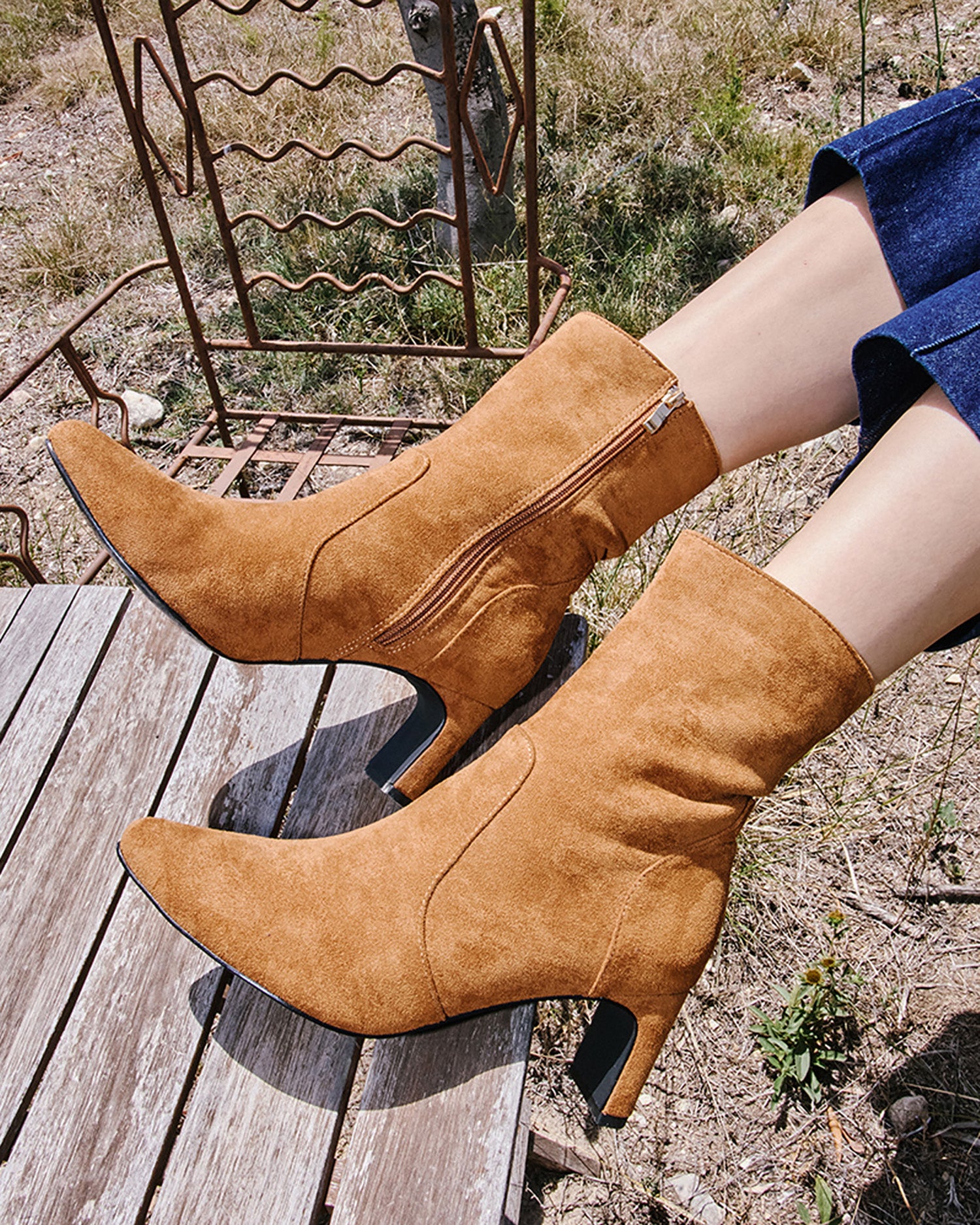 Botín alto en símil ante de color negro. Detalle de pespunte decorativo en la pala y cierre de cremallera en la parte interior. Acabado en punta fina. Tacón semi-cuadrado forrado al tono de 7 cm para las tallas pequeñas de la 32 a la 35. Tacón de 7 cm para las tallas grandes de la 42 a la 45. Este modelo puede tener una variación de medidas respecto al estandar, te recomendamos que revises los cms de la plantilla o suela interior.