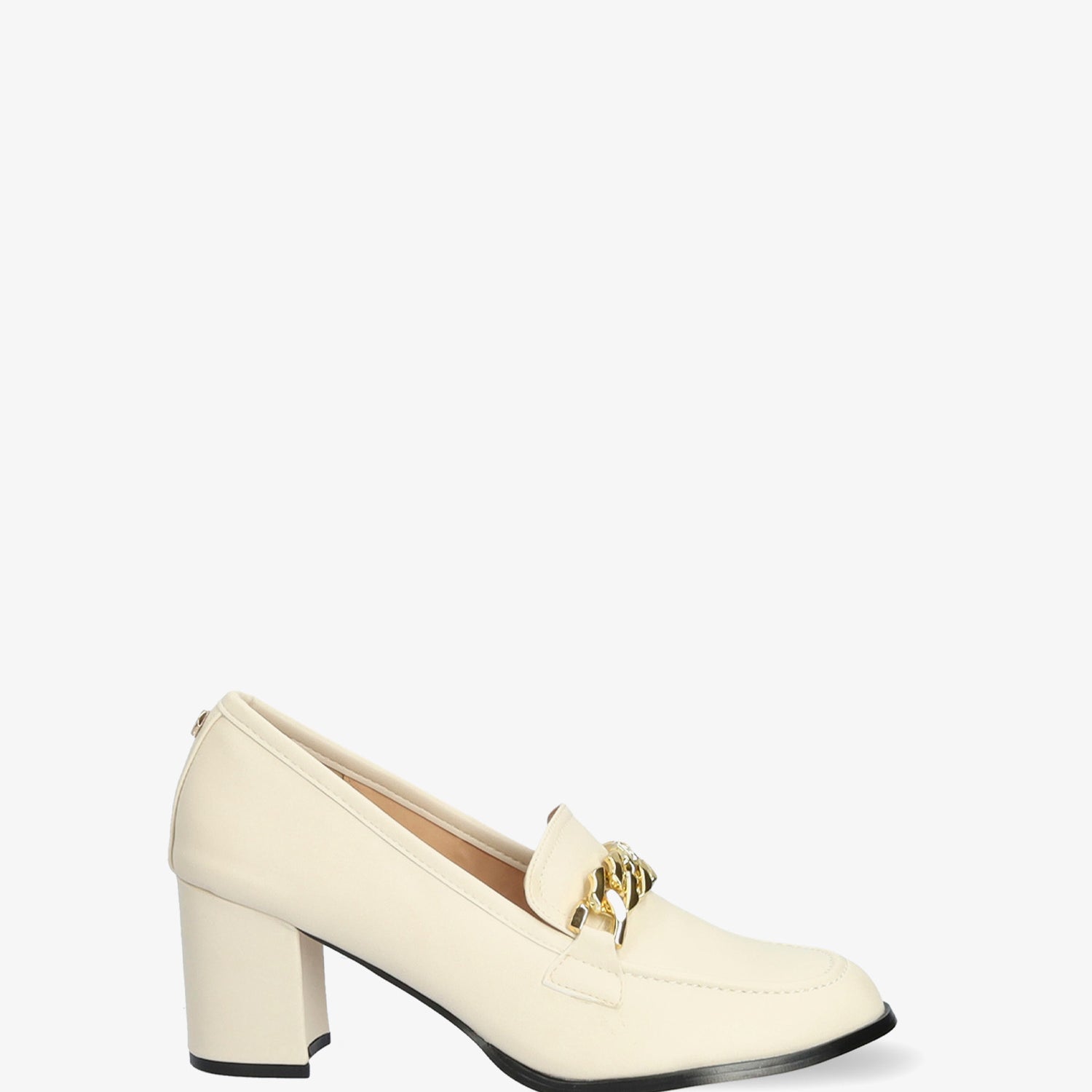 Zapato de estilo mocasín en soft de color Blanco. Detalle decadena de maxi eslabones dorados en la parte de la puntera. Acabado en punta almendra. Tacón ancho forrado al tono de 7 cm para las tallas pequeñas de la 32 a la 35. Tacón de 7 cm para las tallas grandes de la 42 a la 45.