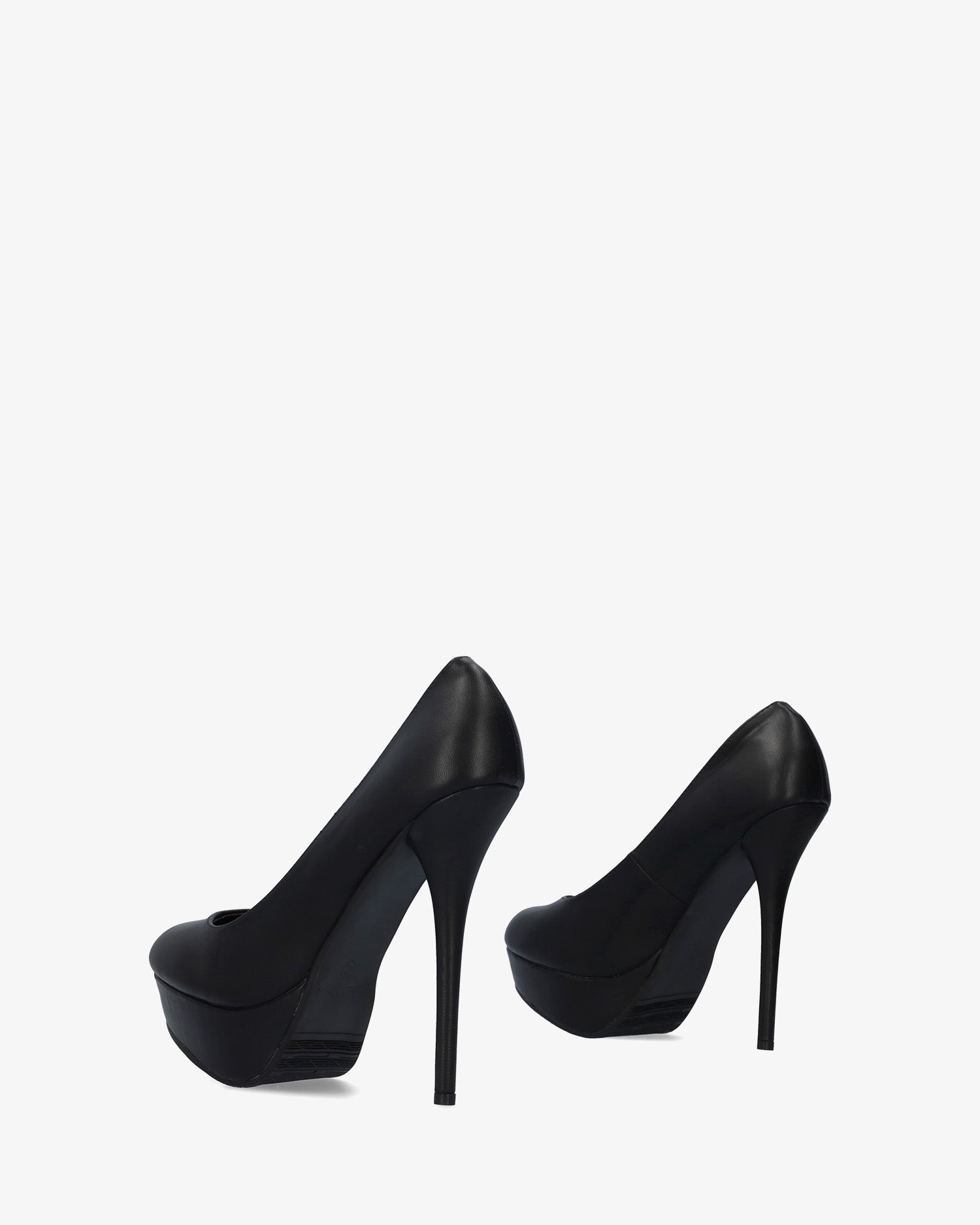 Precioso salón en soft color negro, con punta redonda e interior del mismo color. Tallas Pequeñas de la 32 a la 35 con tacón de aguja de 12 cm y plataforma de 3 cm. Tallas Medianas de la 36 a la 41 con tacón de aguja de 13 cm y plataforma de 3 cm. Tallas Grandes de la 42 a la 45 con tacón de aguja de 14 cm y plataforma de 3 cm.