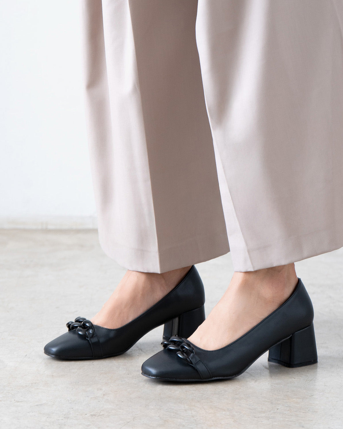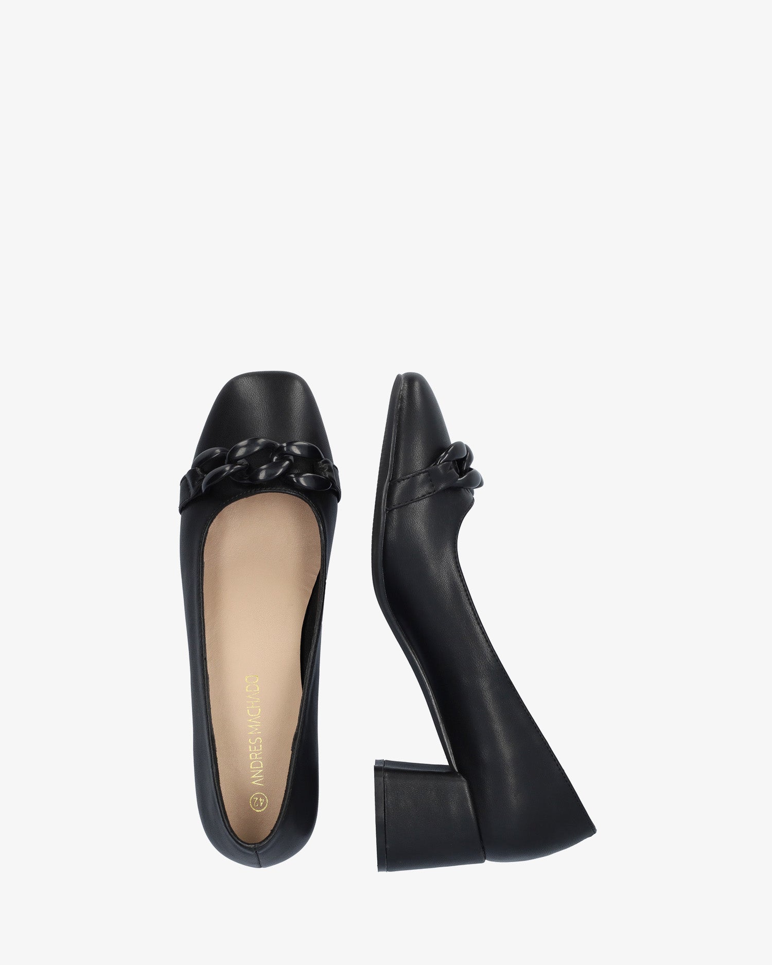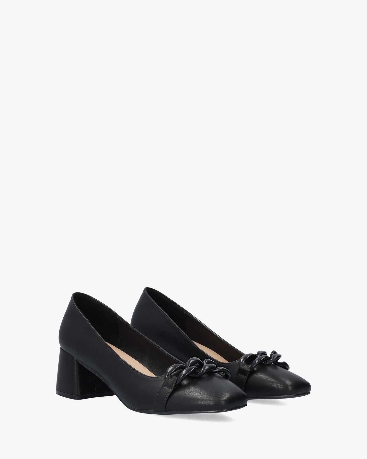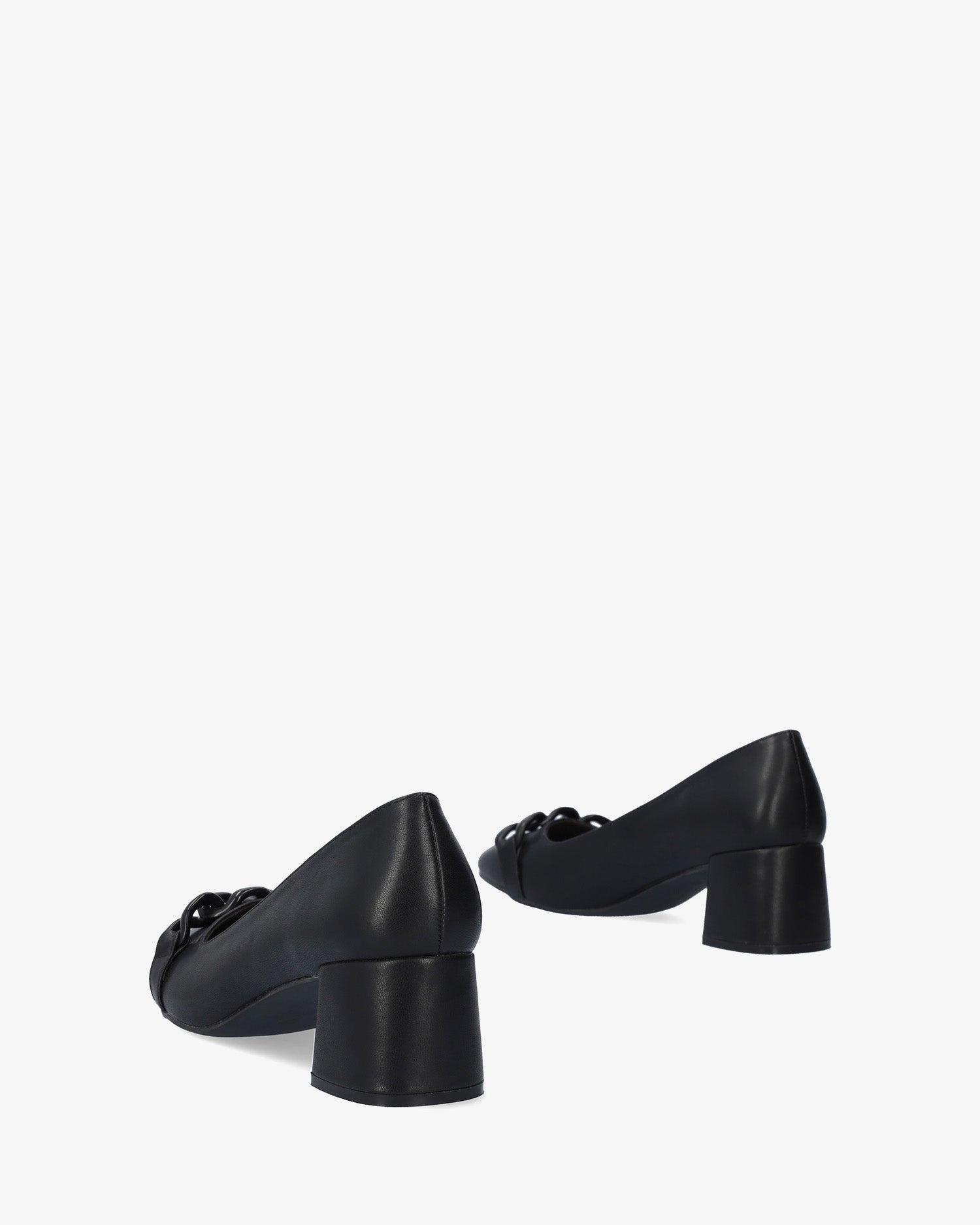 Salón de tacón en soft de color Negro. Detalle de cadena de eslabones al tono sobre el empeine. Acabado en punta cuadrada. Tacón ancho forrado al tono de 6 cm de alto para las tallas pequeñas de la 32 a la 35. Tacón de 6,5 cm de alto para las tallas grandes de la 42 a la 45.