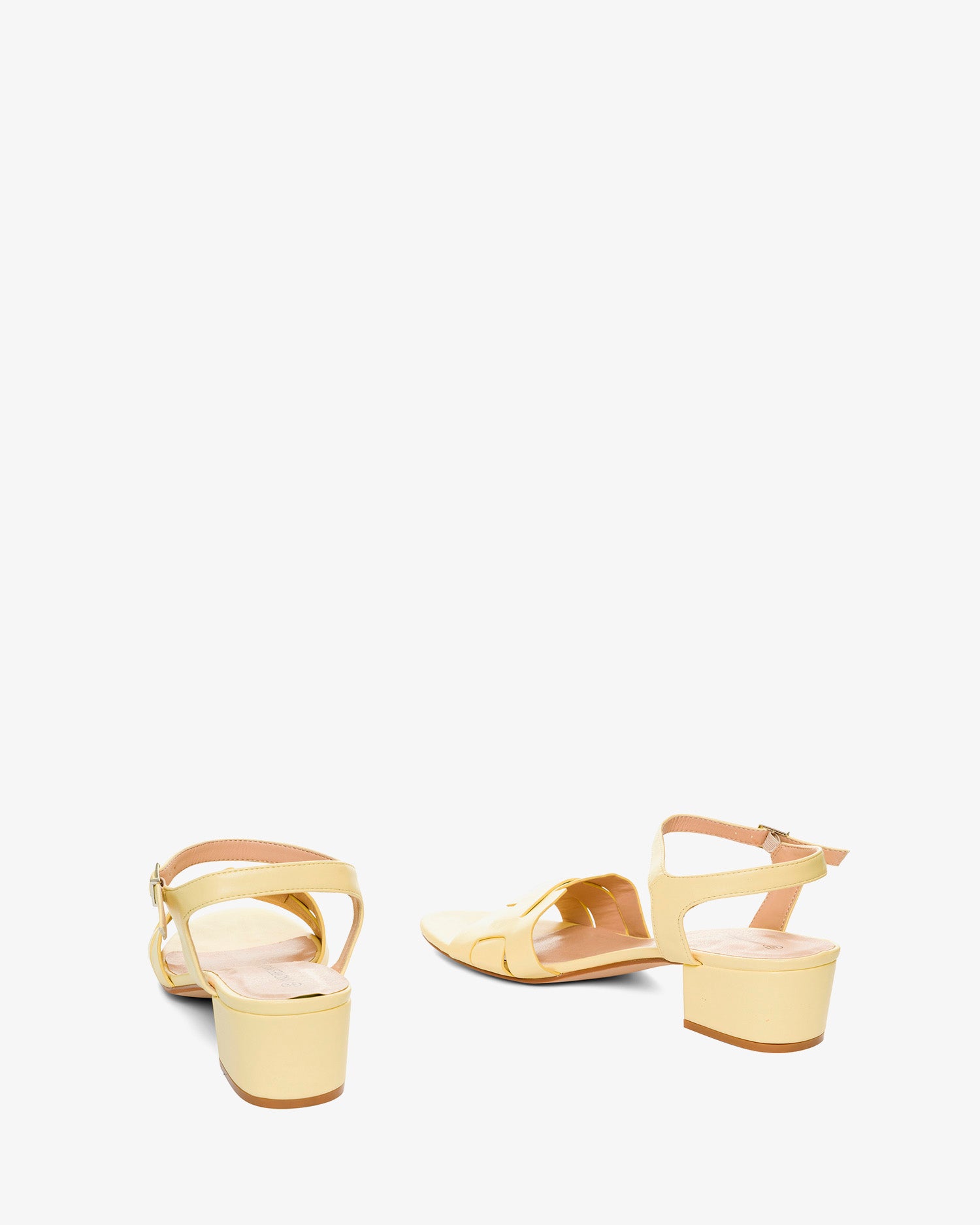 Sandalias de tacón ancho en soft color Amarillo. Diseño destalonado con tira ancha y tira fina entrelazadas en la puntera al tono. Cierre con hebilla metálica al tobillo. Puntera redondeada y abierta. Tacón de 5 cm para las tallas pequeñas de la 32 a la 35. Tacón de 5,5 cm para las tallas grandes de la 42 a la 45.