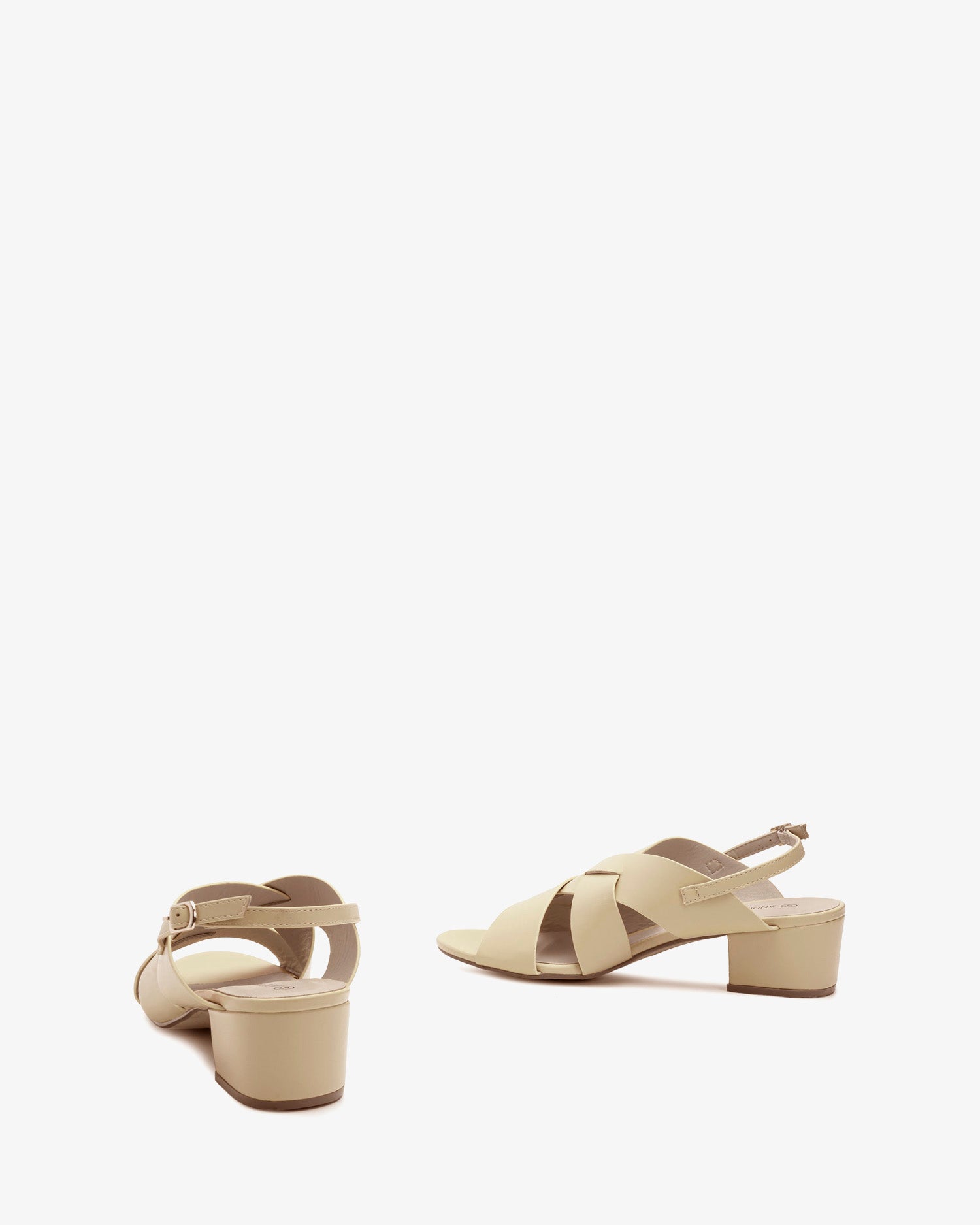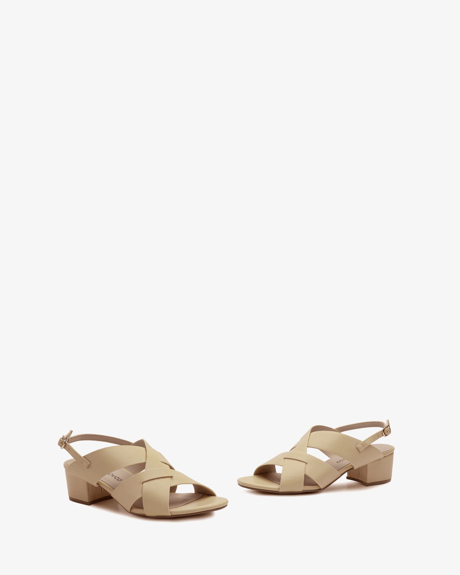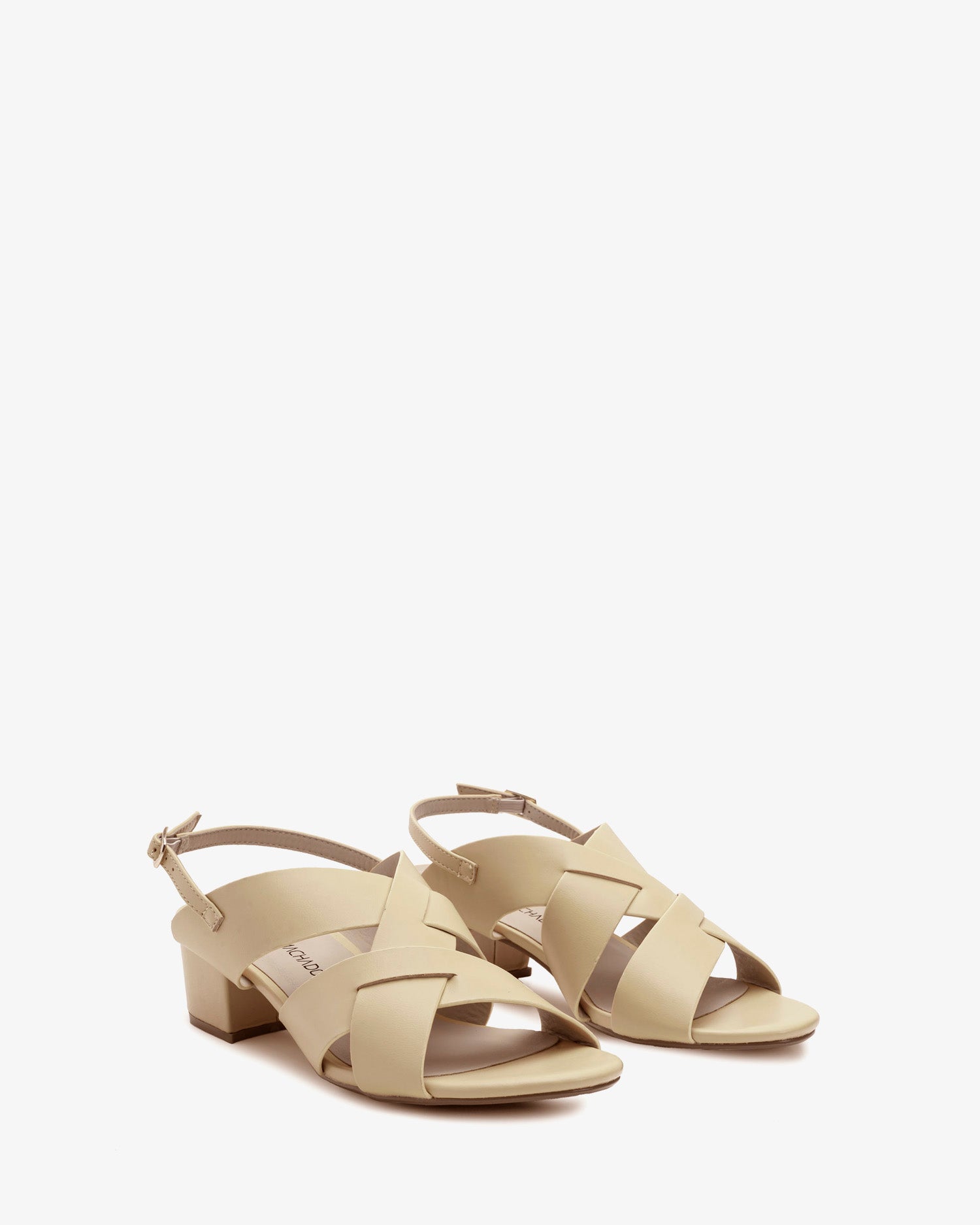 Sandalias en Soft de color crema. Diseño de tiras anchas al tono entrelazada alrededor del empeine. Cierre de hebilla con tira trasera al tono. Puntera redondeada. Talonera abierta. Tacón ancho forrado al tono de 4,5 cm para las tallas pequeñas de la 32 a la 35. Tacón de 5 cm para las tallas grandes de la 42 a la 45.