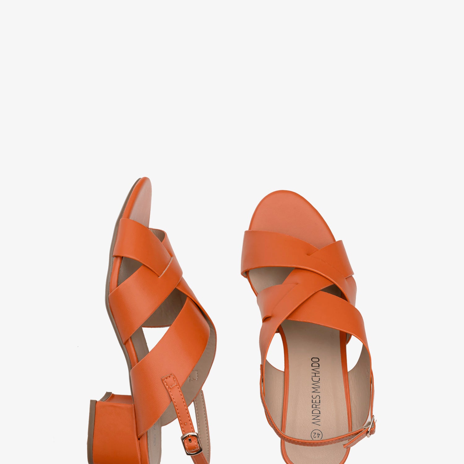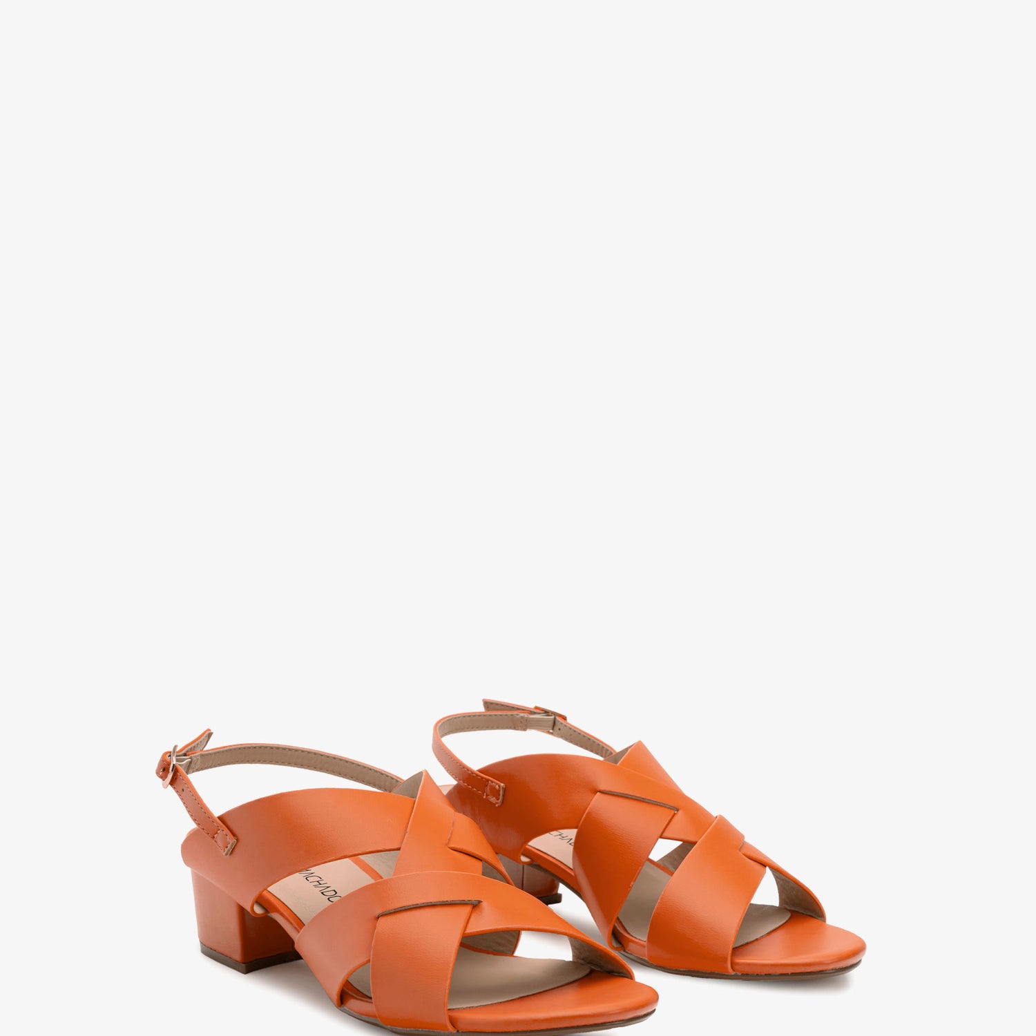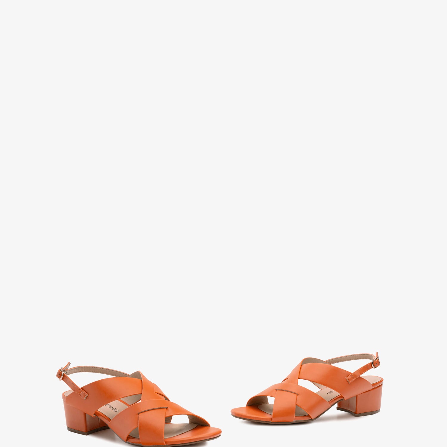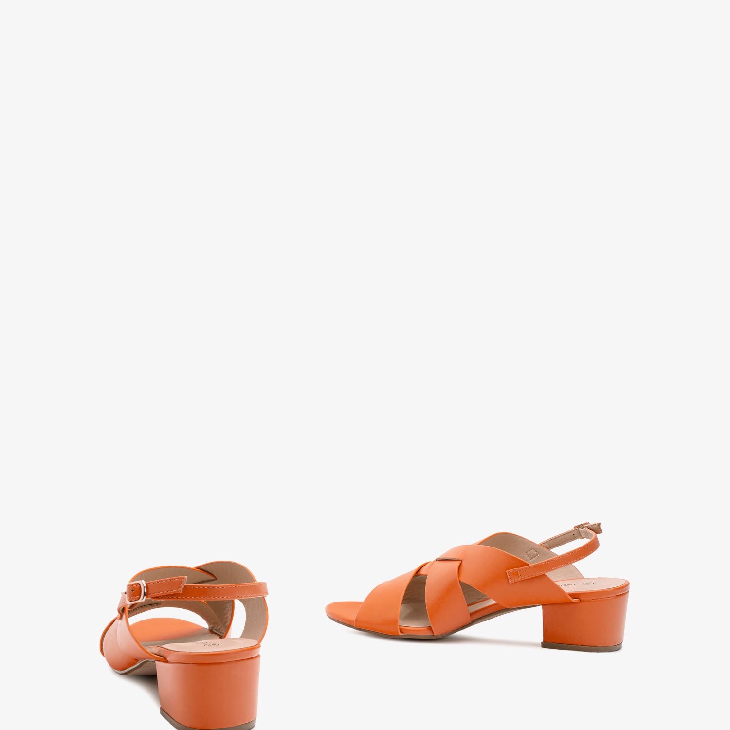 Sandalias en Soft de color naranja. Diseño de tiras anchas al tono entrelazada alrededor del empeine. Cierre de hebilla con tira trasera al tono. Puntera redondeada. Talonera abierta. Tacón ancho forrado al tono de 4,5 cm para las tallas pequeñas de la 32 a la 35. Tacón de 5 cm para las tallas grandes de la 42 a la 45.