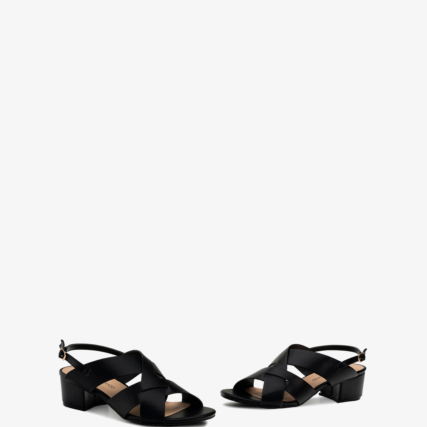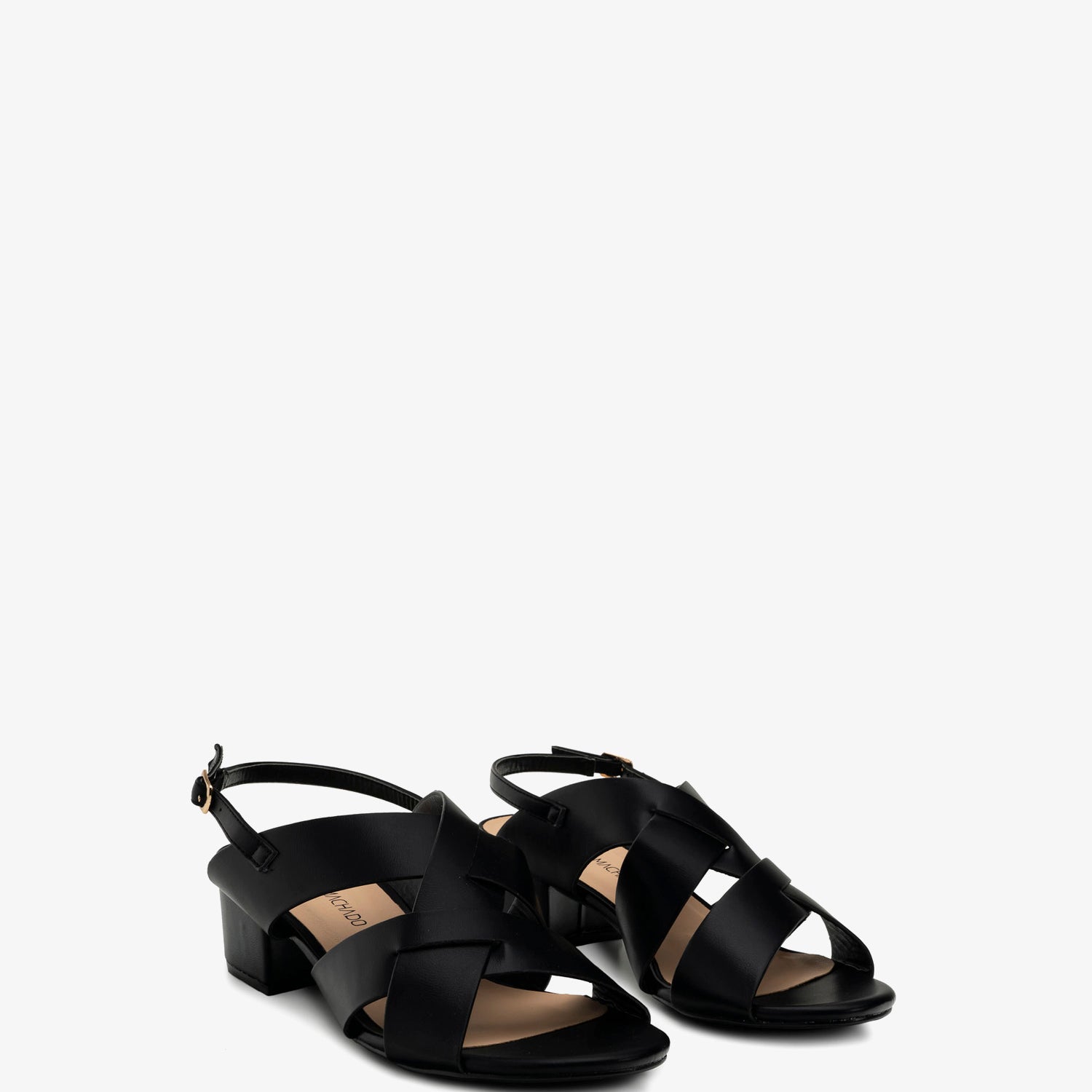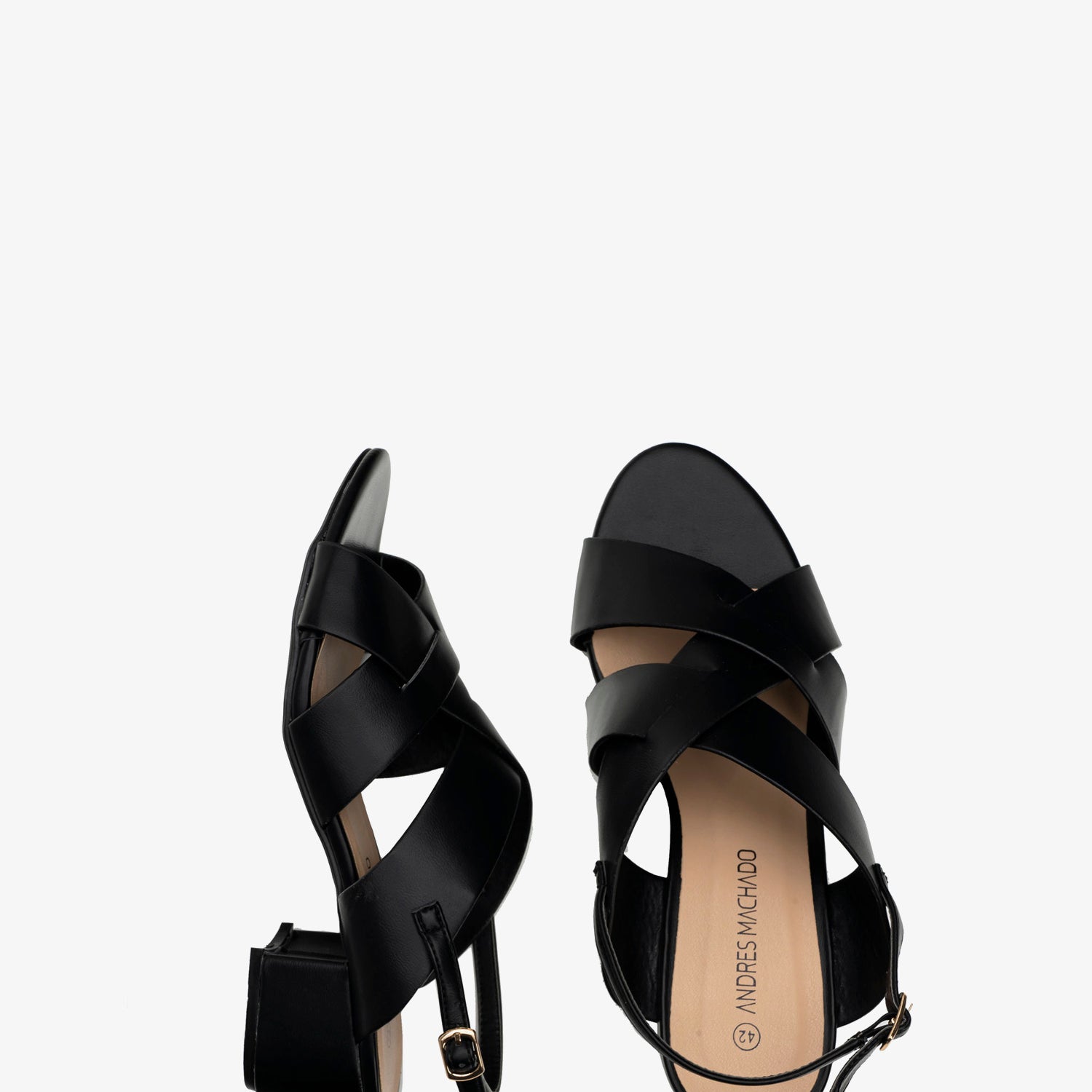 Sandalias en Soft de color negro. Diseño de tiras anchas al tono entrelazada alrededor del empeine. Cierre de hebilla con tira trasera al tono. Puntera redondeada. Talonera abierta. Tacón ancho forrado al tono de 4,5 cm para las tallas pequeñas de la 32 a la 35. Tacón de 5 cm para las tallas grandes de la 42 a la 45.
