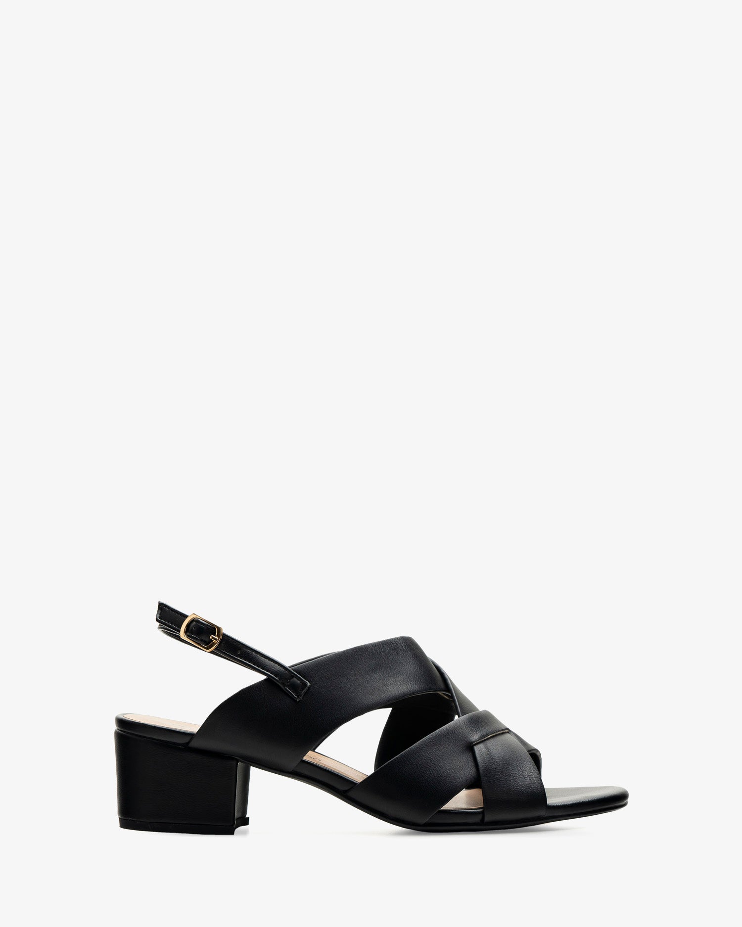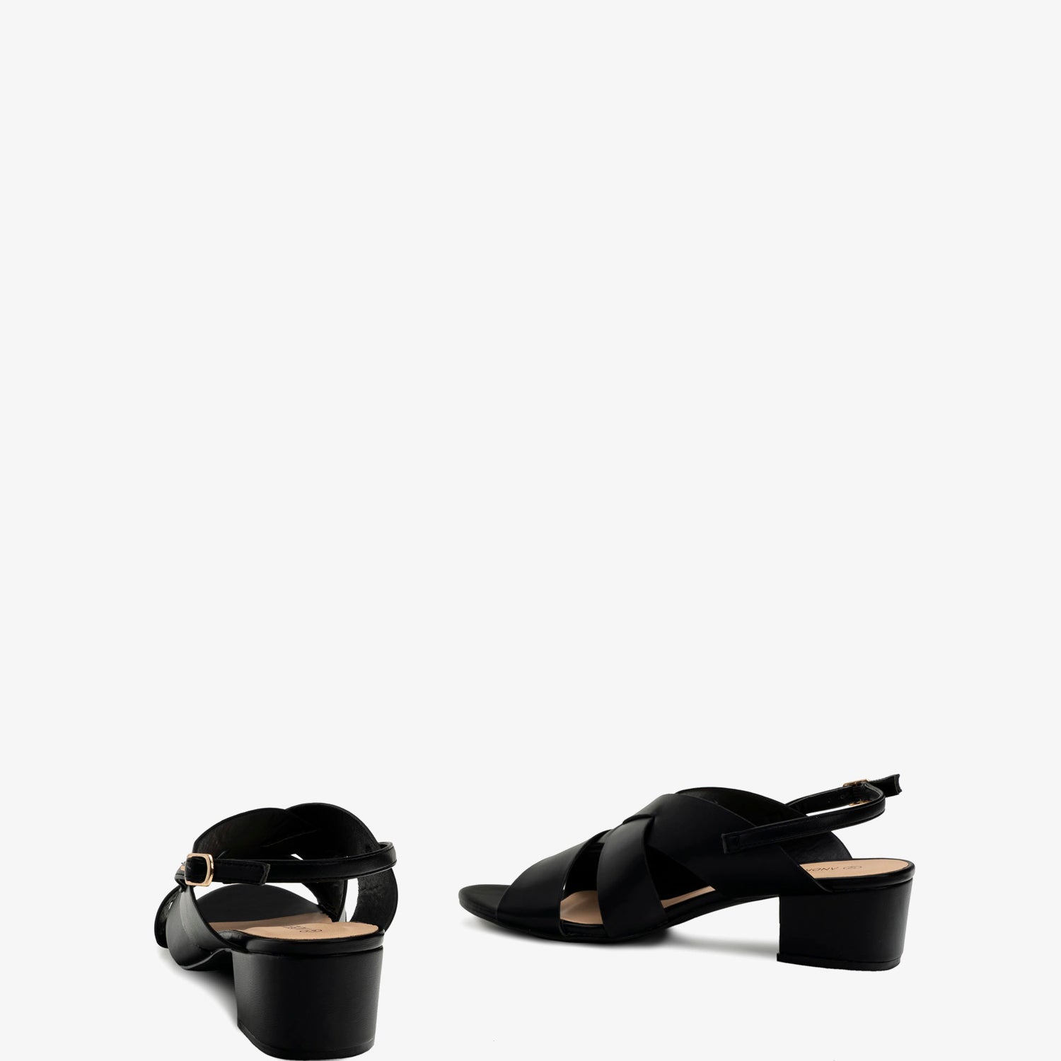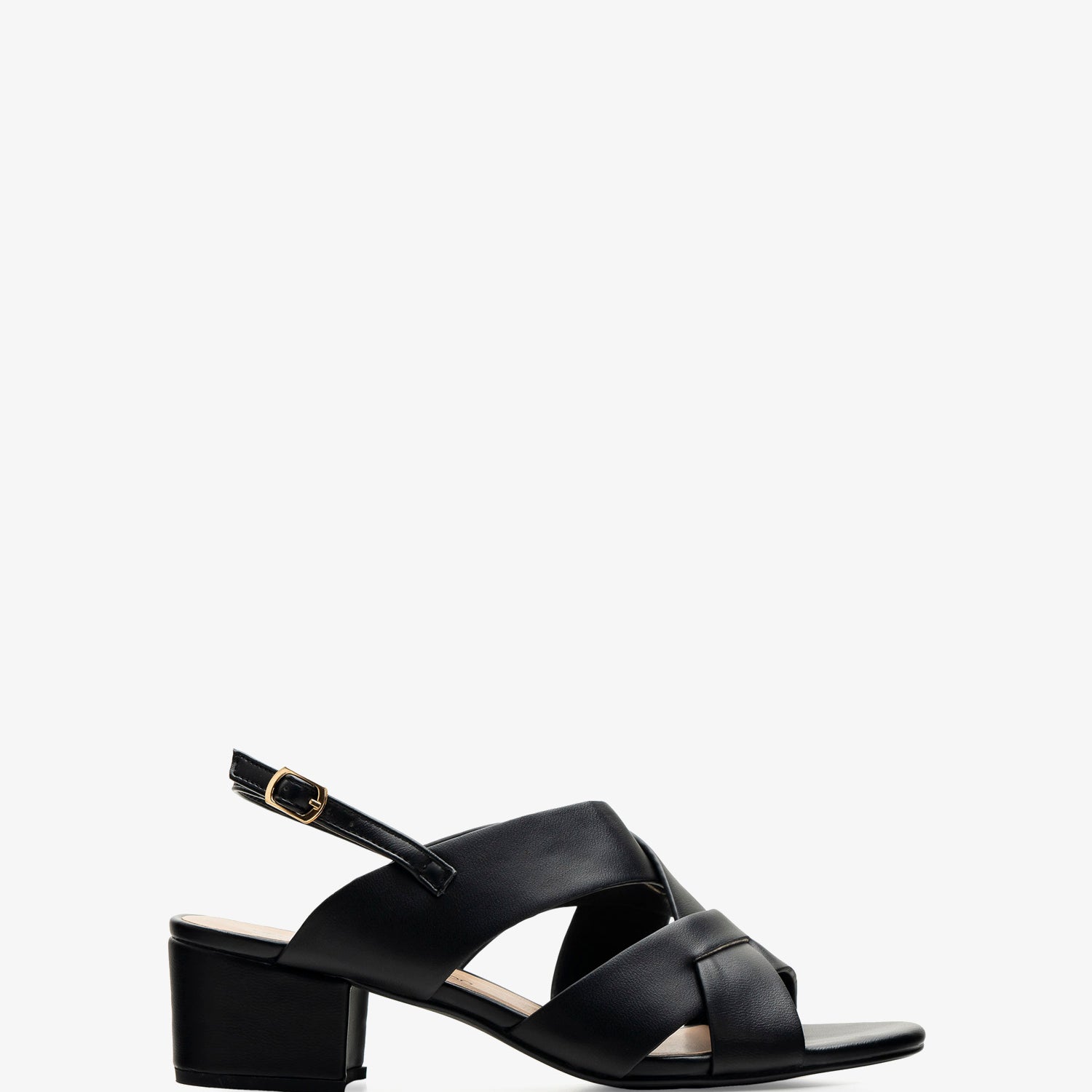 Sandalias en Soft de color negro. Diseño de tiras anchas al tono entrelazada alrededor del empeine. Cierre de hebilla con tira trasera al tono. Puntera redondeada. Talonera abierta. Tacón ancho forrado al tono de 4,5 cm para las tallas pequeñas de la 32 a la 35. Tacón de 5 cm para las tallas grandes de la 42 a la 45.
