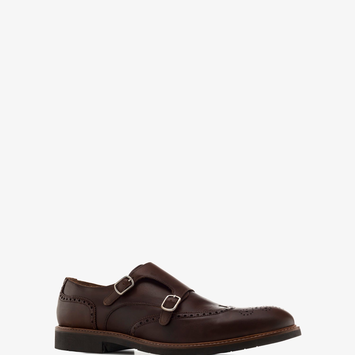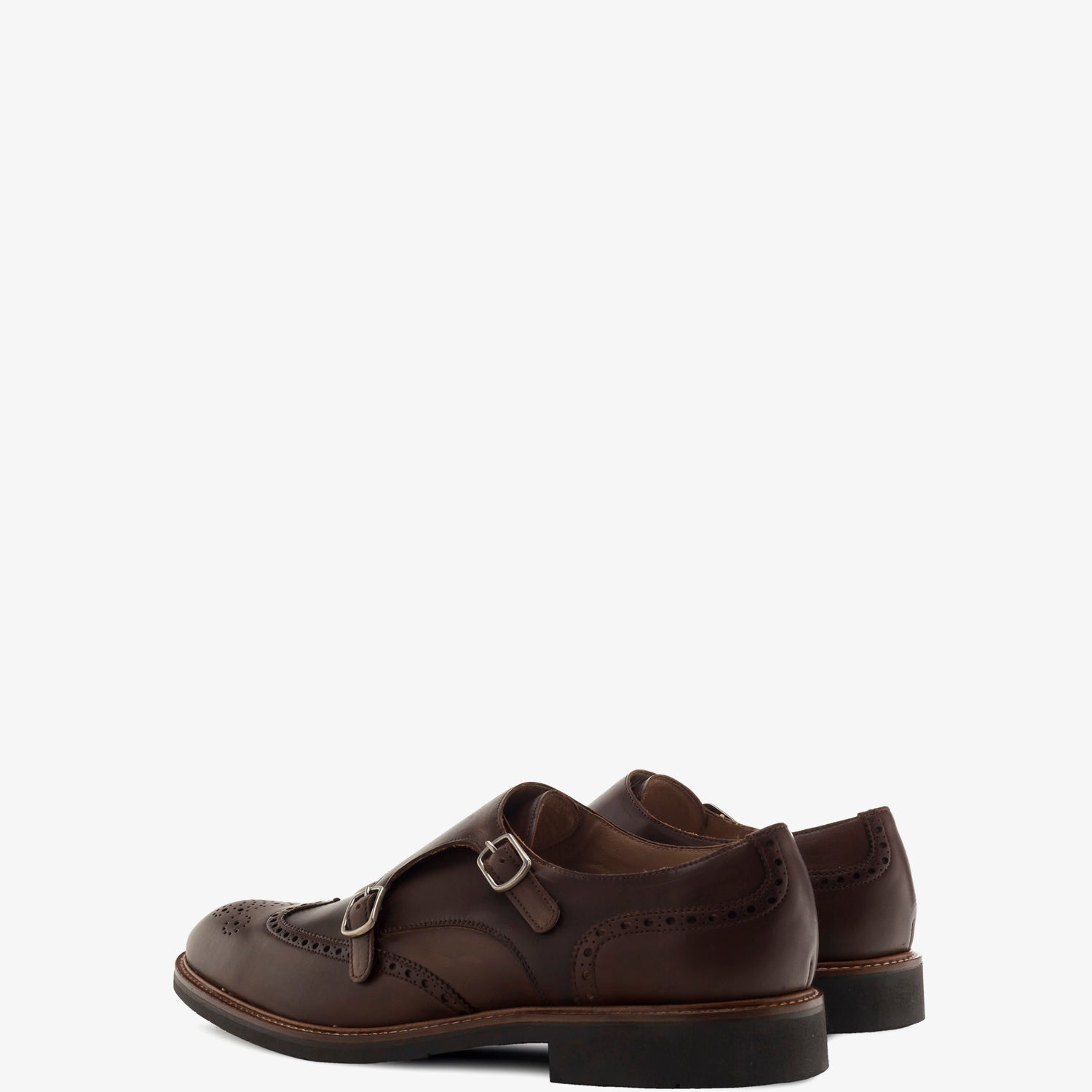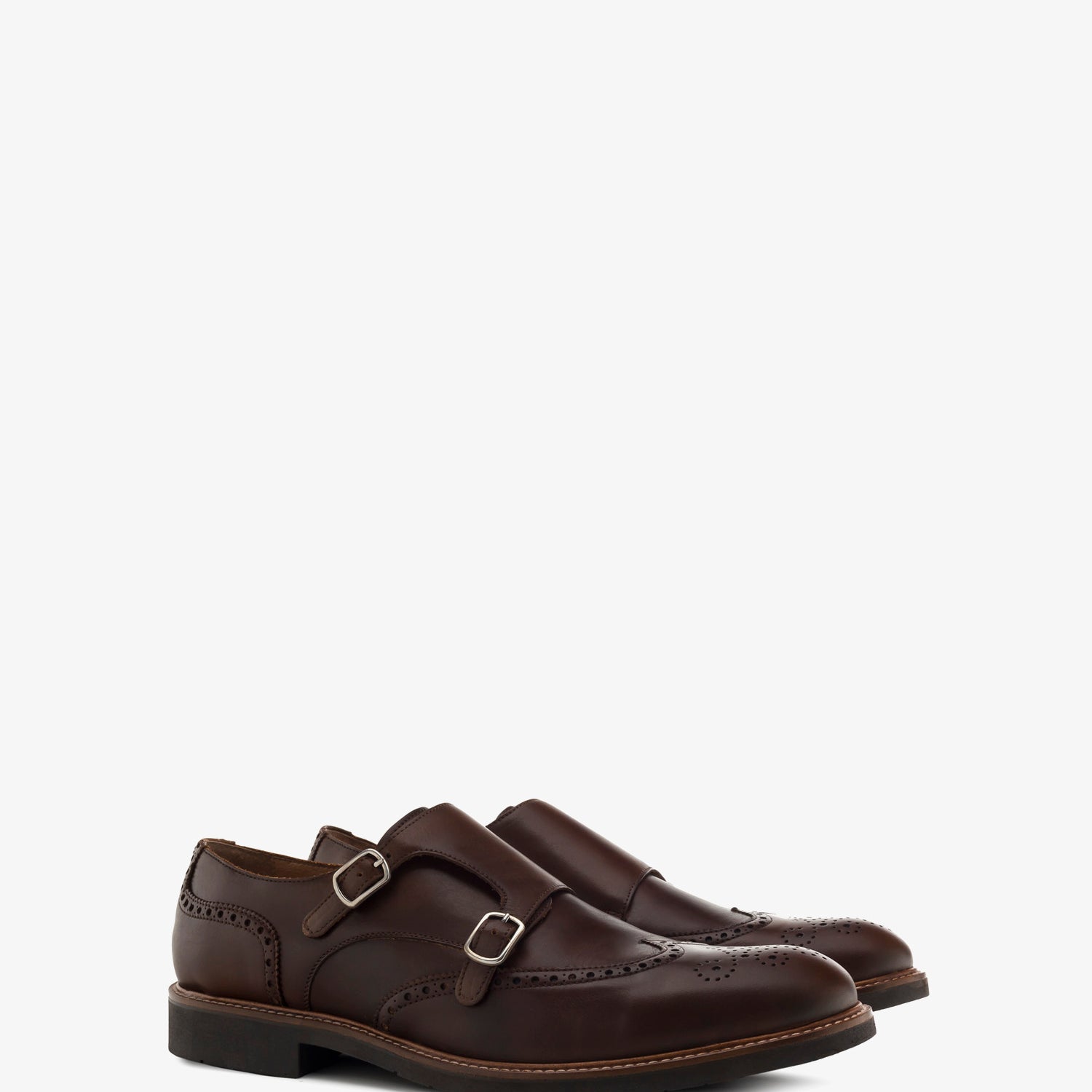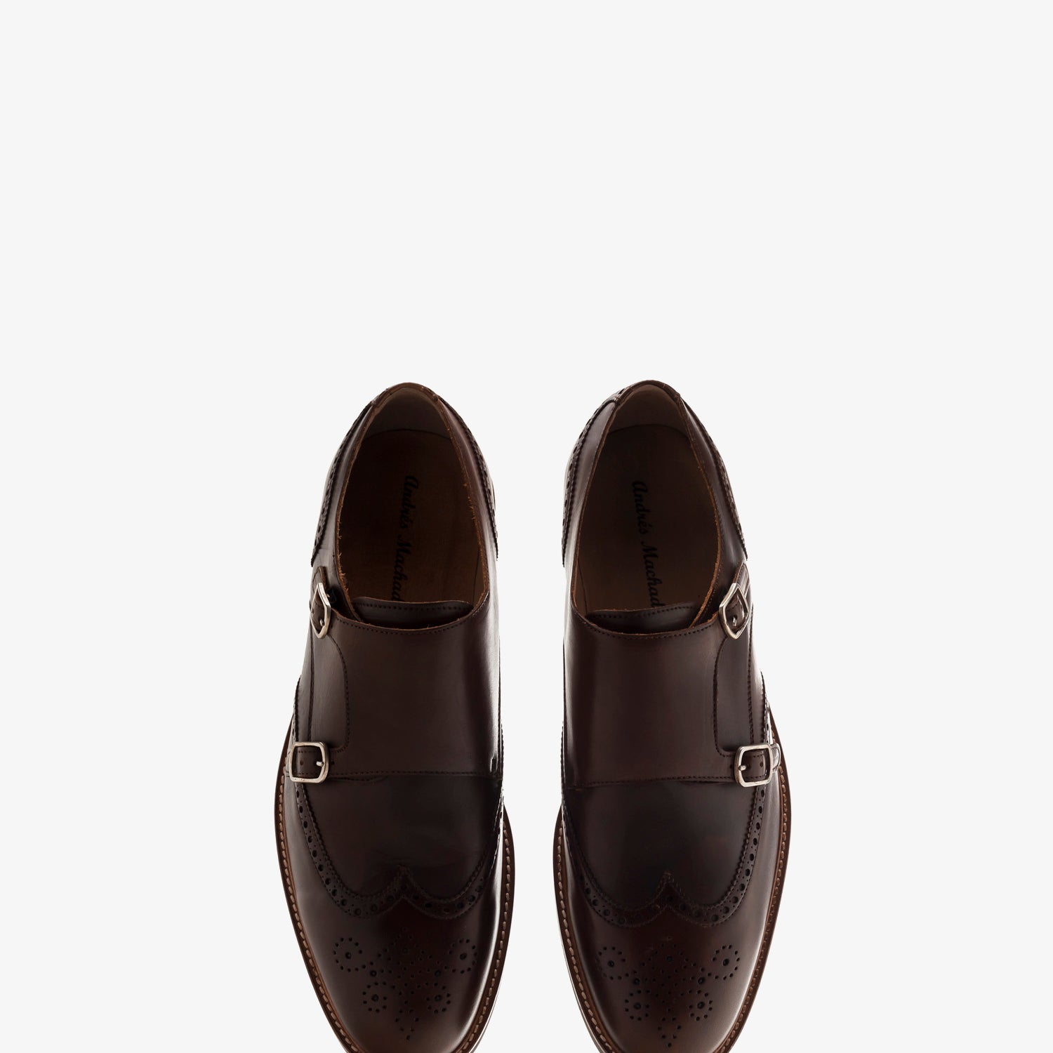 Zapato de piel en color Marron de estilo Monk, cierre con dos hebillas metálicas con elastico. Detalle ornamental de picados en el corte. Plantilla y forro en color Camel. Suela de color marrón. Tallas Grandes de Caballero de la 47 a la 50. Fabricación Española.