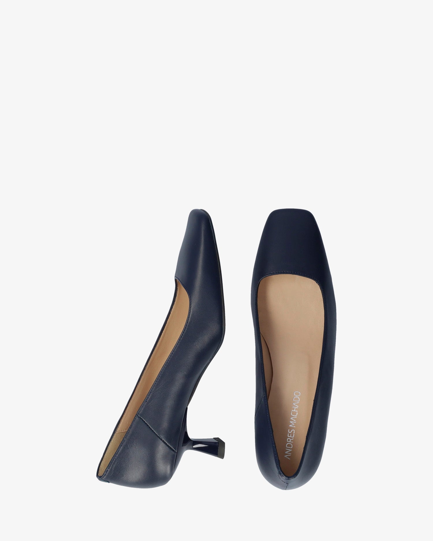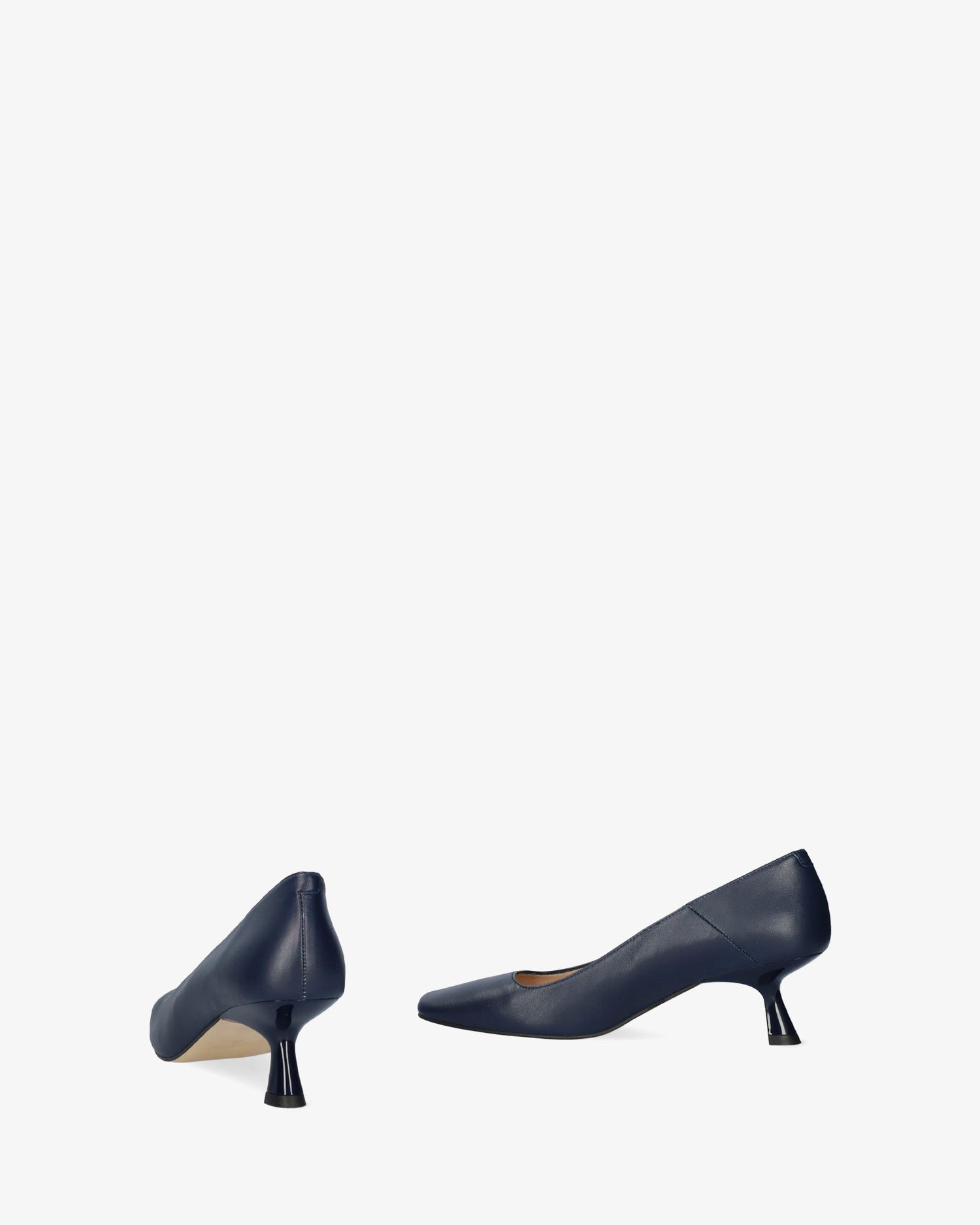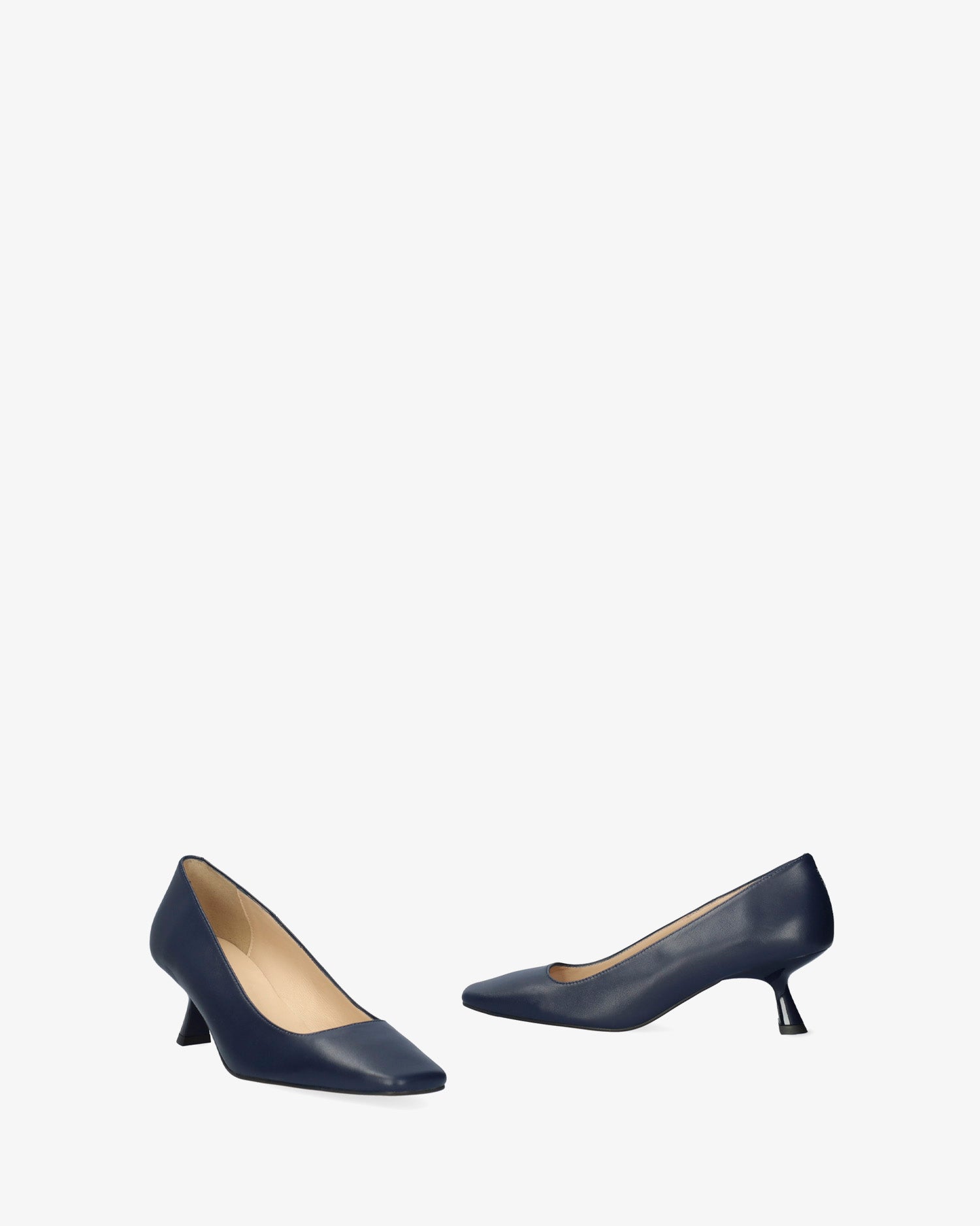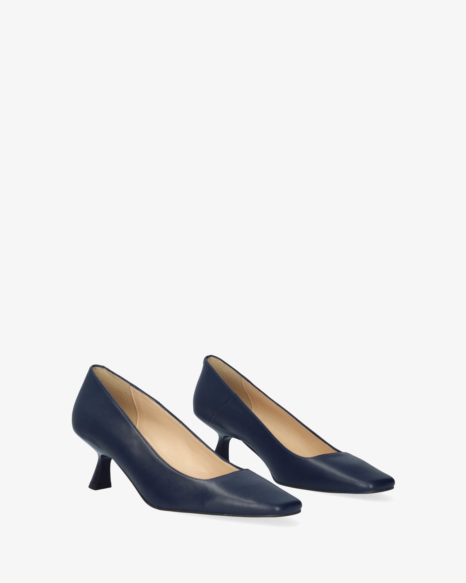 Zapato de tacón en piel de color marino. Acabado en punta cuadrada. Forro interior en piel de color beige. Tacón kitten heel al tono efecto charol de 5,5 cm de alto para las tallas pequeñas de la 32 a la 35. Tacón de 5,5 cm de alto para las tallas medianas de la 36 a la 41. Tacón de 6 cm de alto para las tallas grandes de la 42 a la 45. Fabricados en España