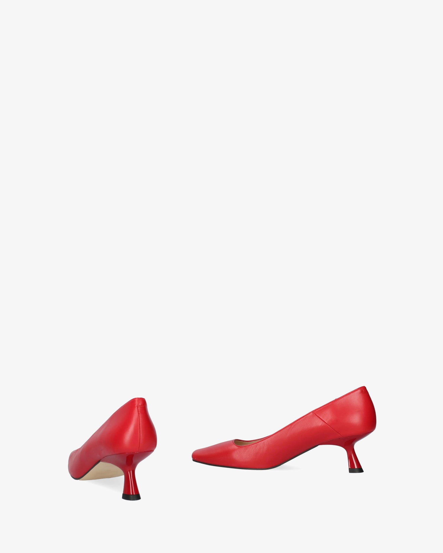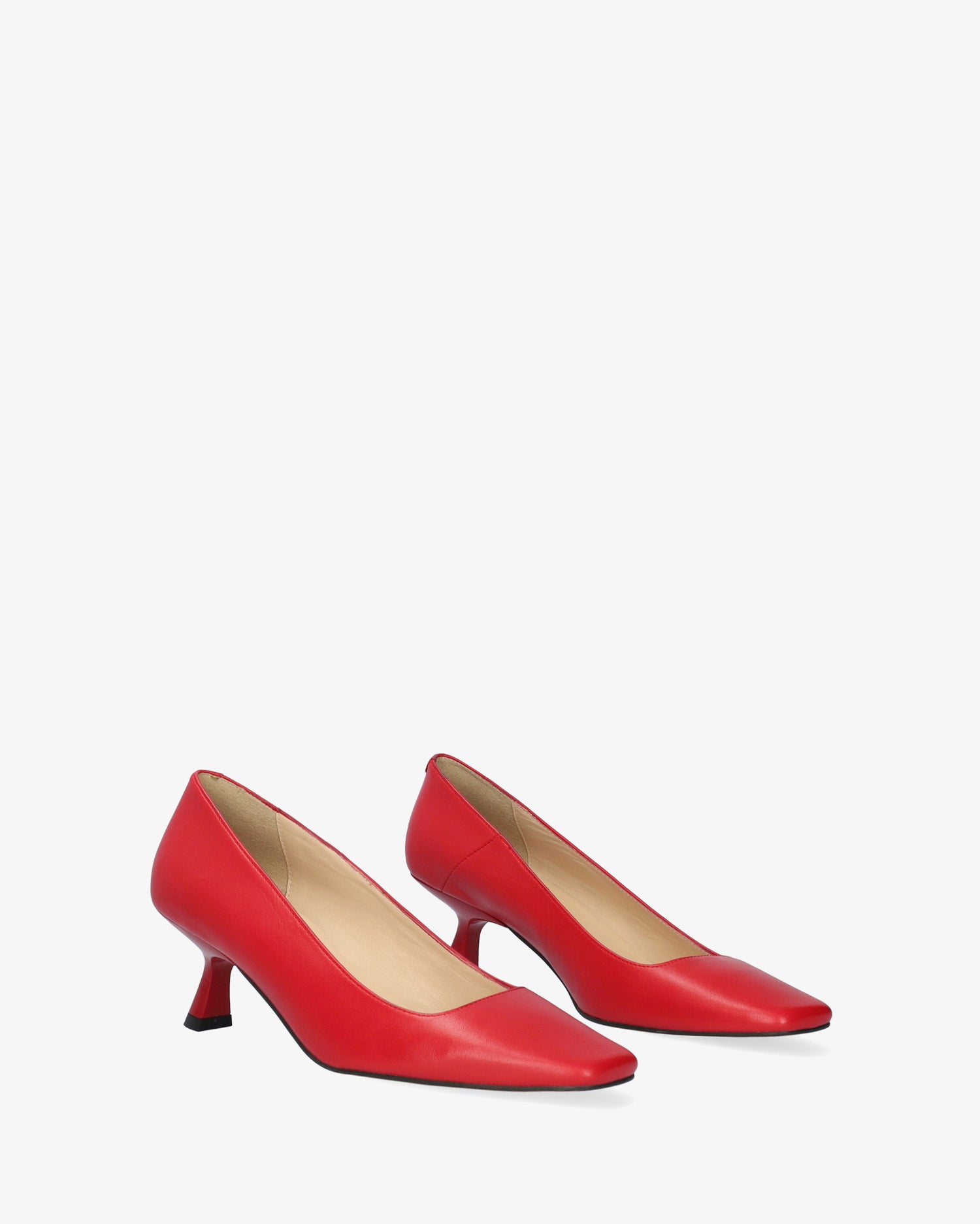 Zapato de tacón en piel de color rojo. Acabado en punta cuadrada. Forro interior en piel de color beige. Tacón kitten heel al tono efecto charol de 5,5 cm de alto para las tallas pequeñas de la 32 a la 35. Tacón de 5,5 cm de alto para las tallas medianas de la 36 a la 41. Tacón de 6 cm de alto para las tallas grandes de la 42 a la 45. Fabricados en España