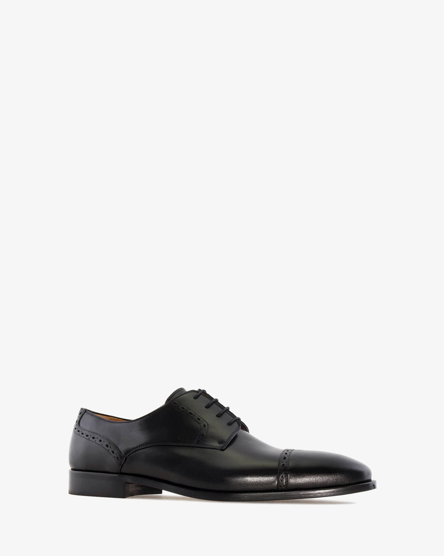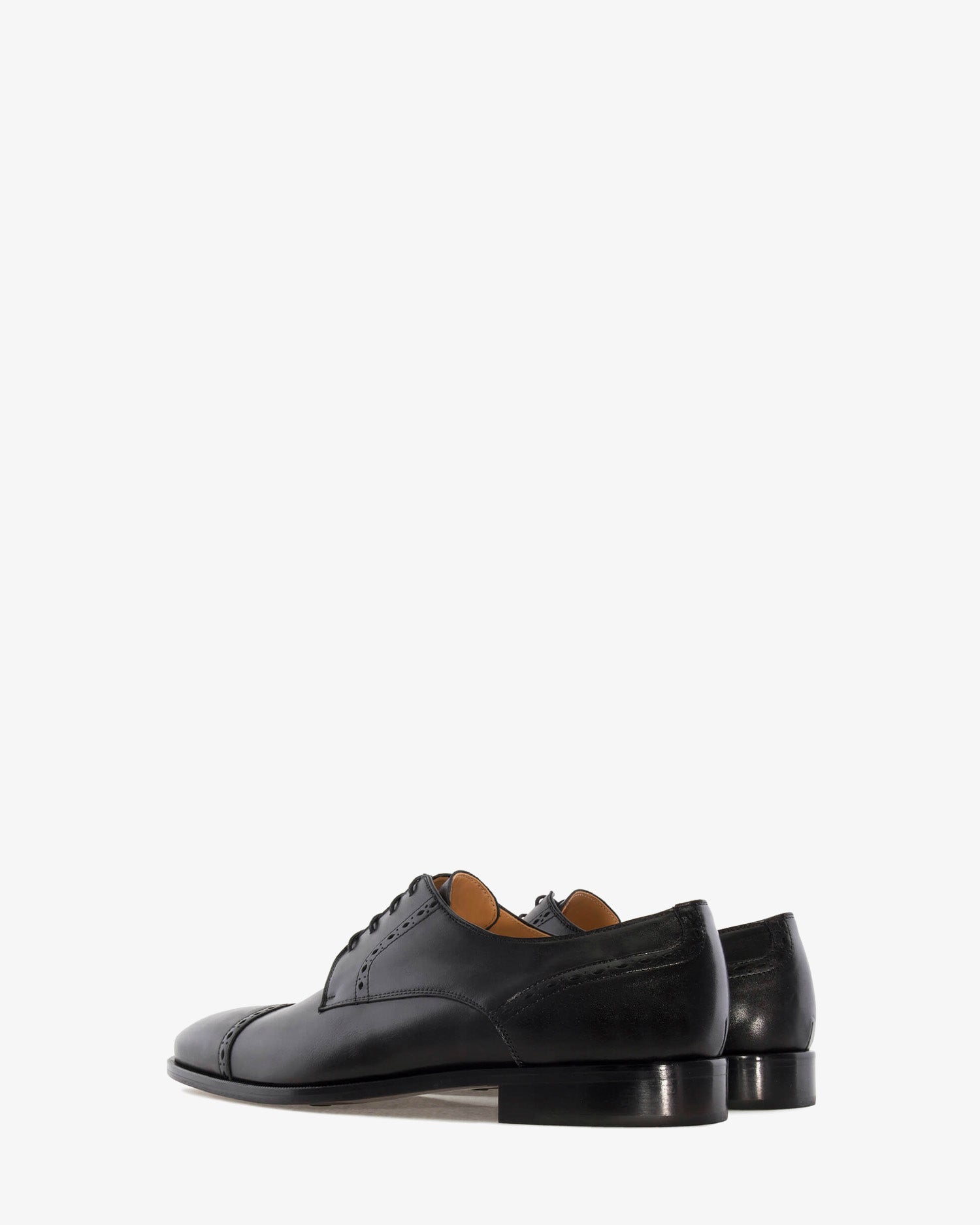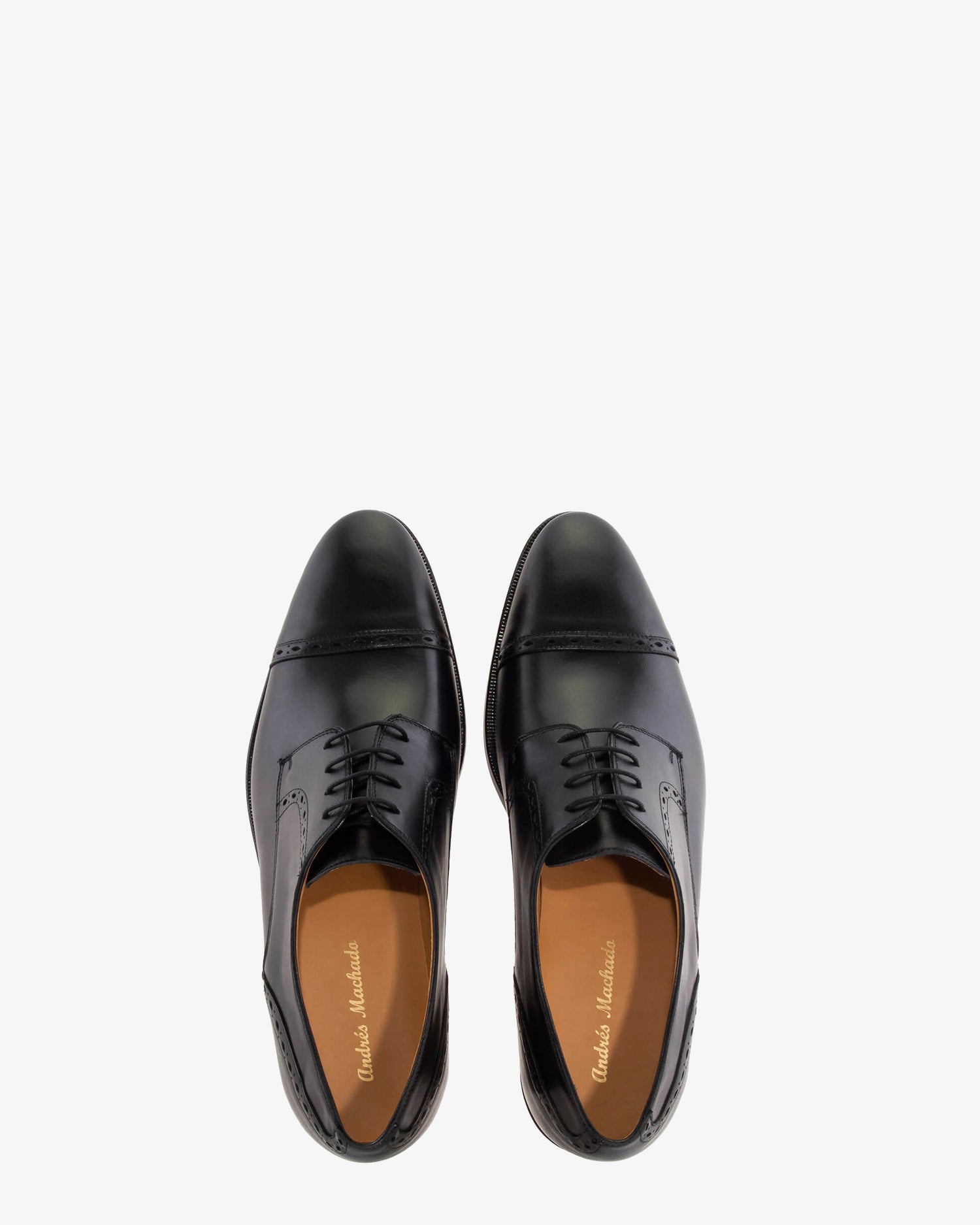 Zapato de piel en color Negro con cordones al tono. Detalle de picados en el corte. Forro interior de cuero Marrón. Suela Negra de cuero. Tallas Pequeñas de caballero de la 37 a la 40. Tallas Grandes de Caballero de la 47 a la 50. Fabricados en España.